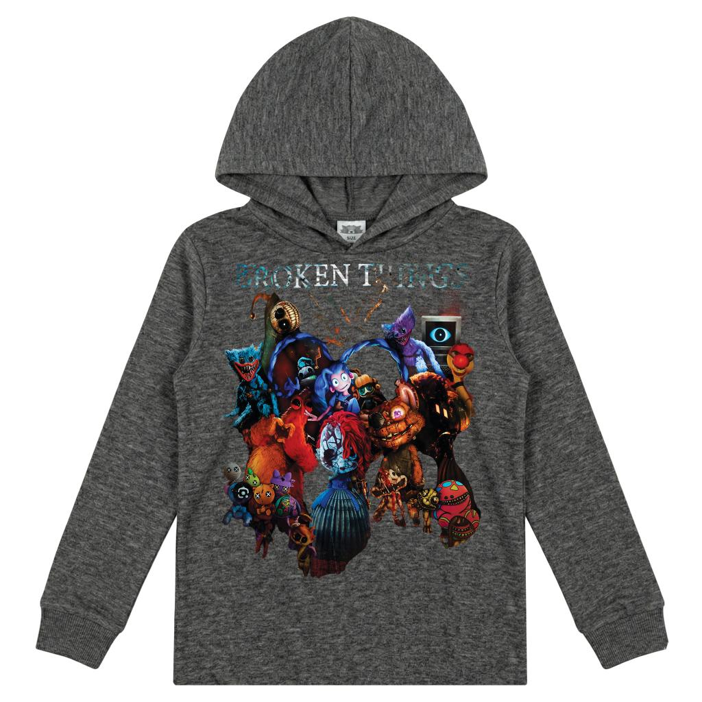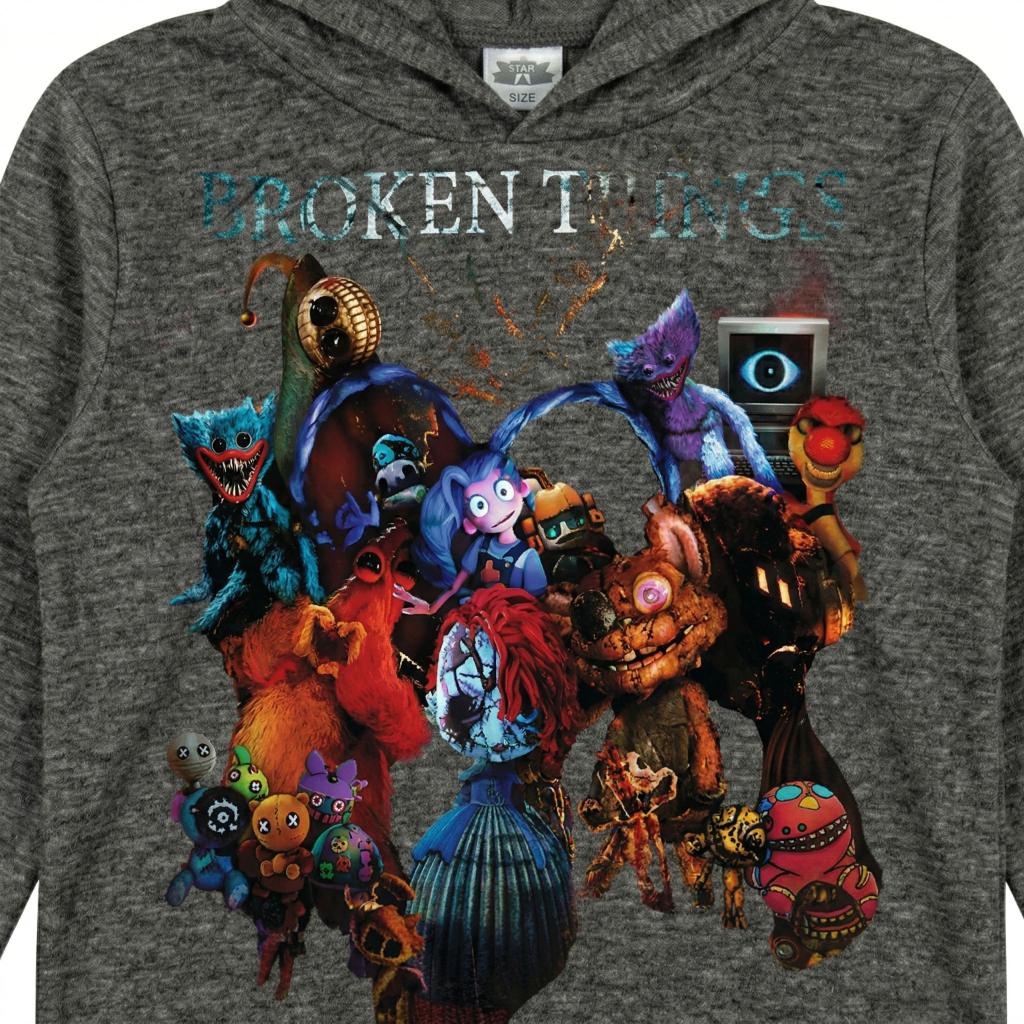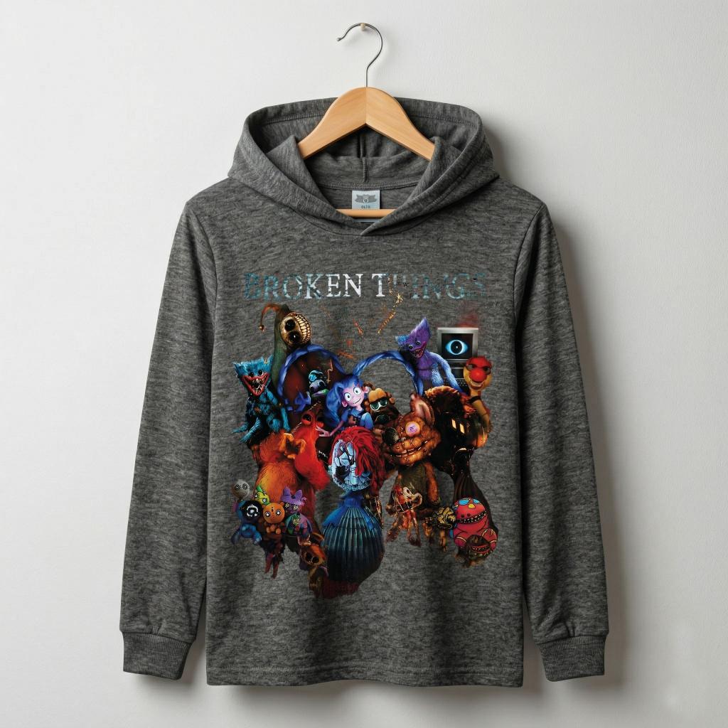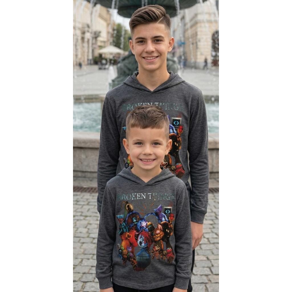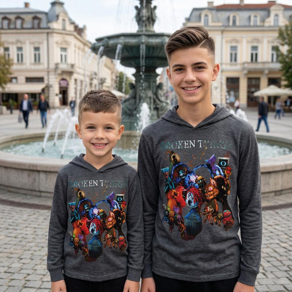 Смел стил за малки герои! 😎 Тази модерна сива блуза с качулка впечатлява с ефектен и детайлен DTF печат „Broken Things“ 🎮🔥 – перфектен избор за деца, които обичат по-различната и интересна визия.