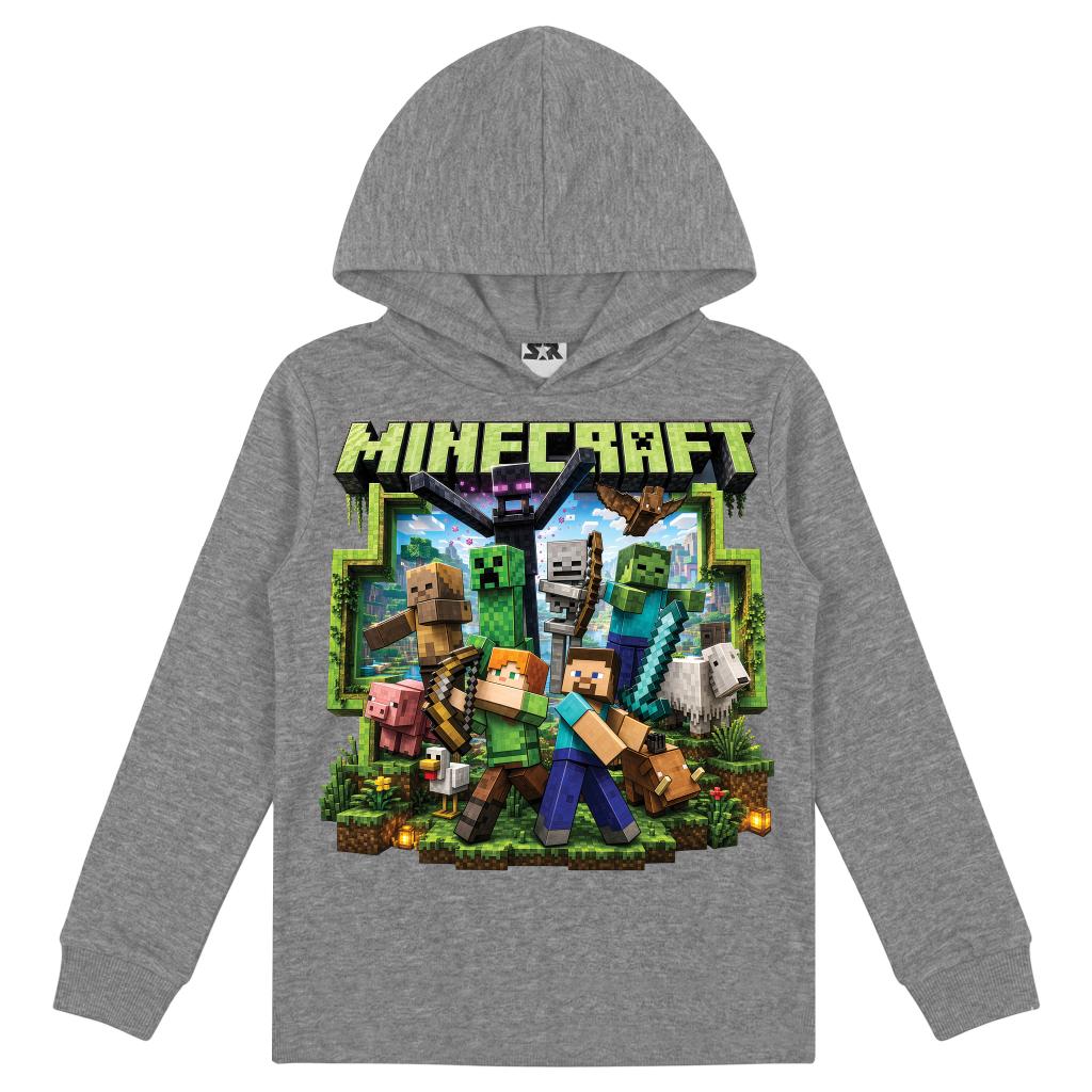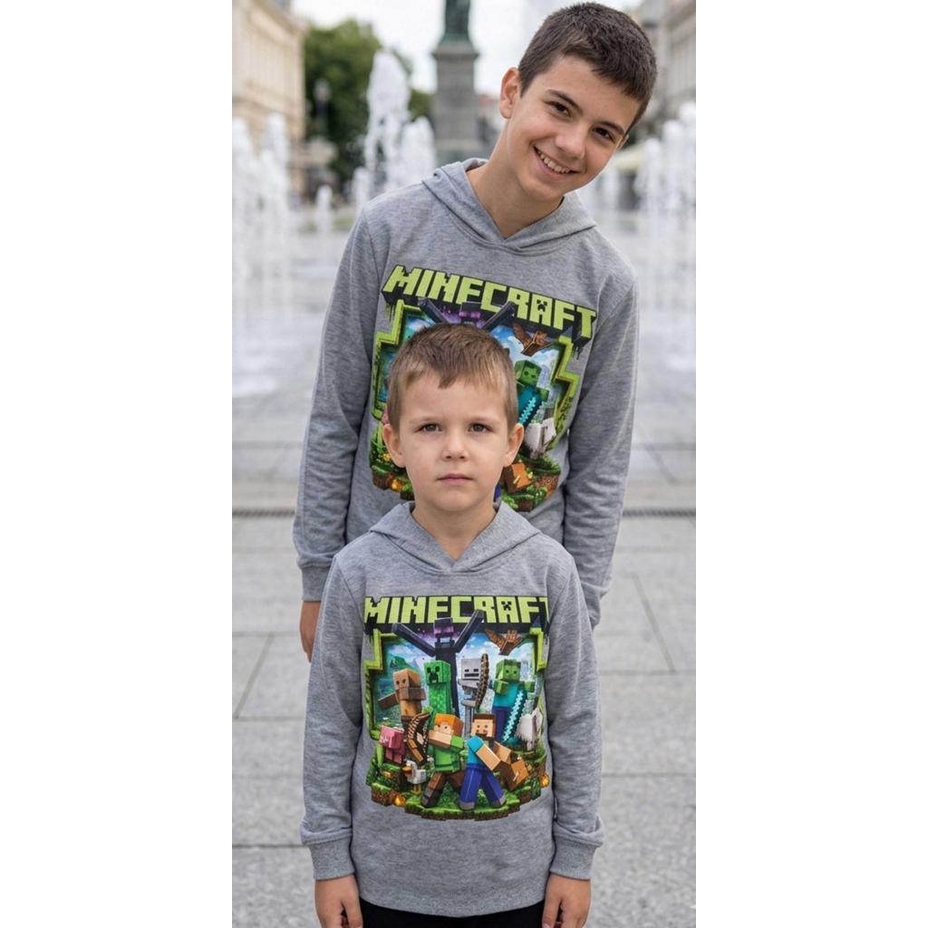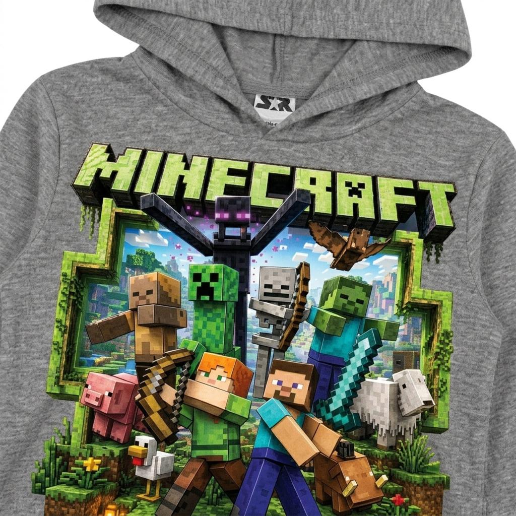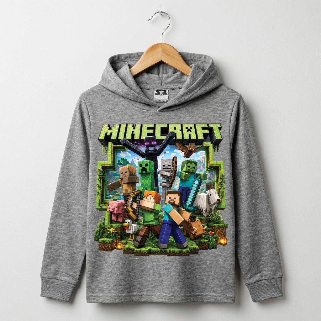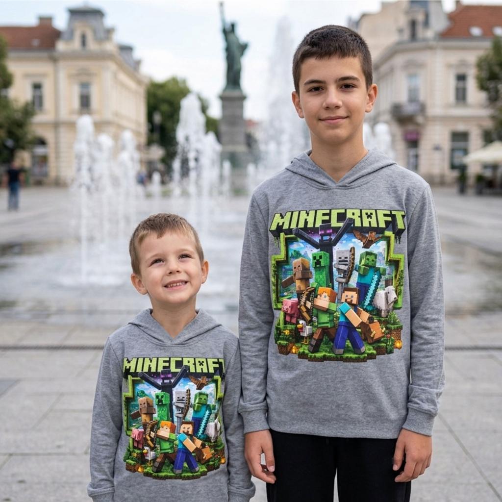 Любимата игра оживява! 🎮💚 Тази сива блуза с качулка с впечатляващ DTF печат в стил „Minecraft“ е истинска находка за малките геймъри. Яркият и детайлен дизайн с познатите герои превръща всяко облекло в приключение!