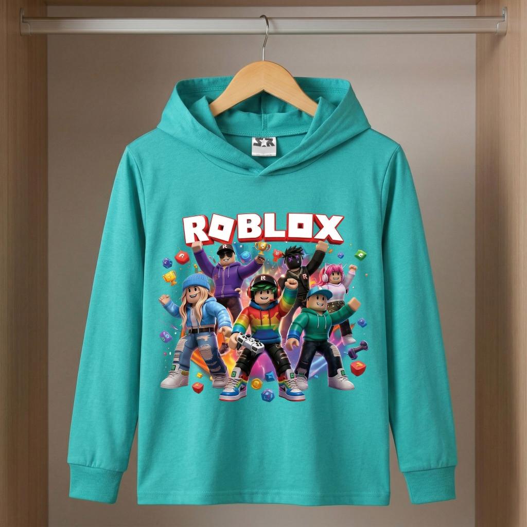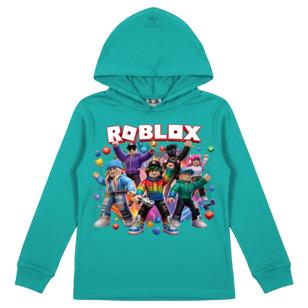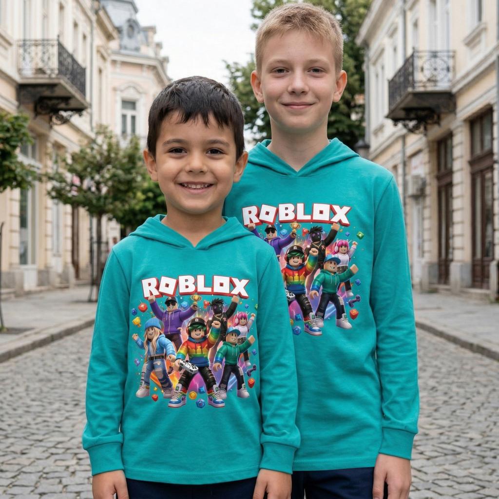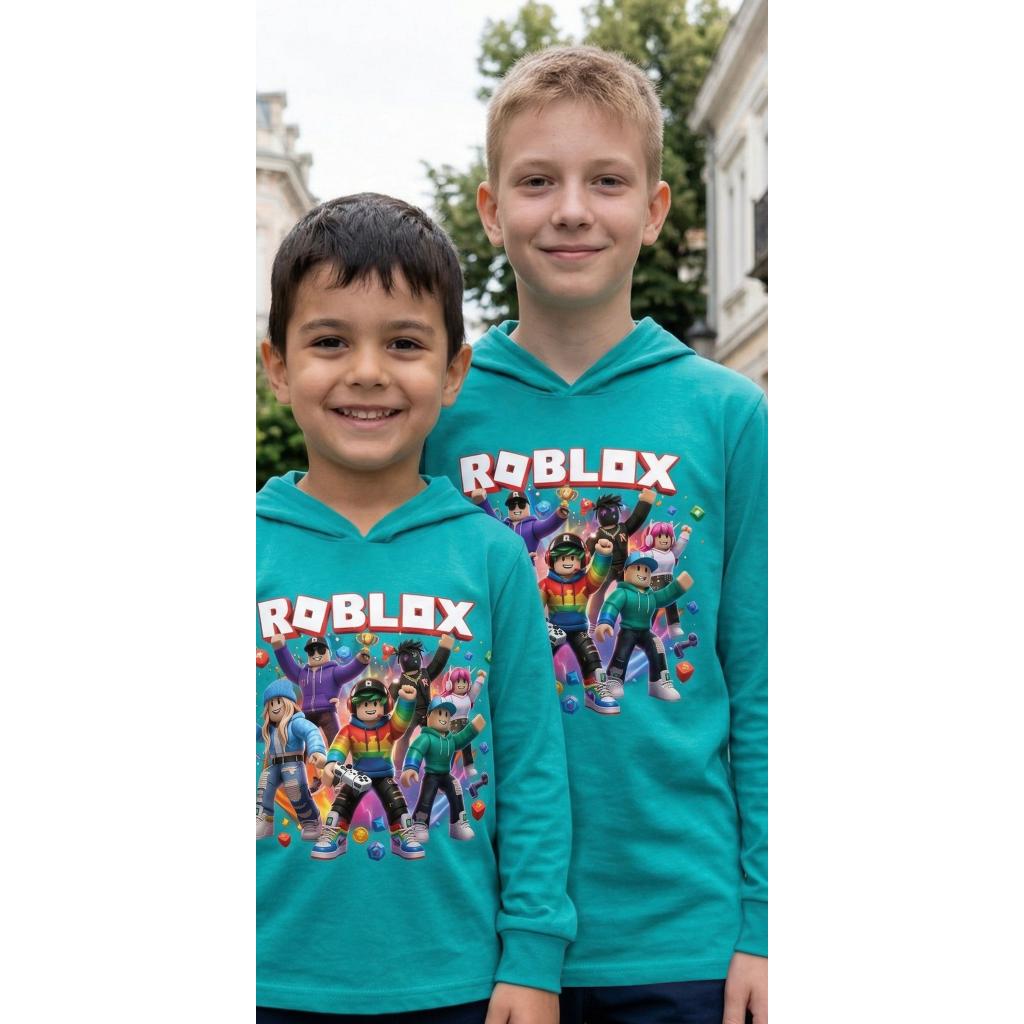 Гейминг настроение на макс! 🎮🔥 Тази свежа тюркоазена блуза с качулка ще стане абсолютен фаворит за всеки малък фен на Roblox! Със супер ефектен DTF печат с любими герои, моделът носи настроение, енергия и стил във всяка визия 😍