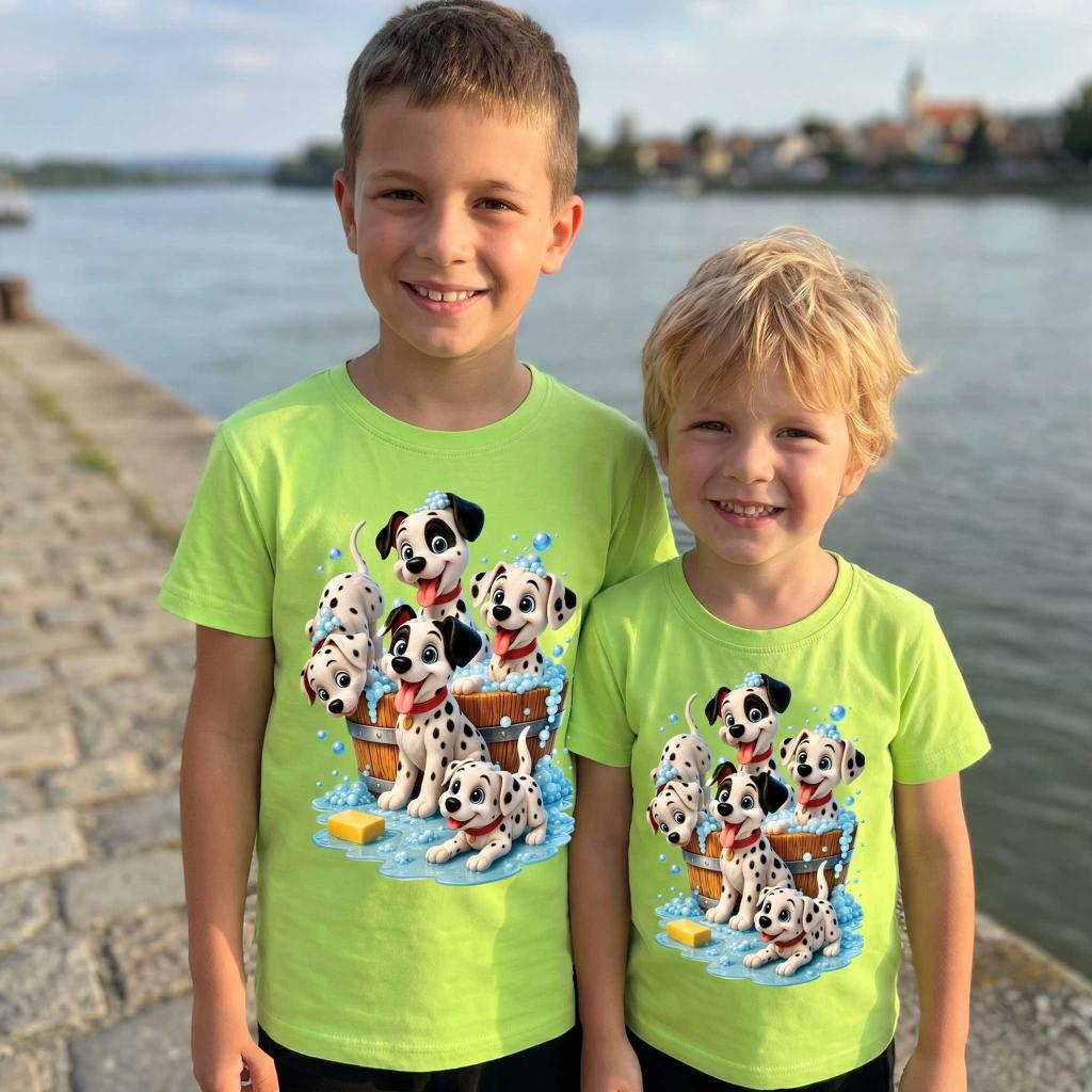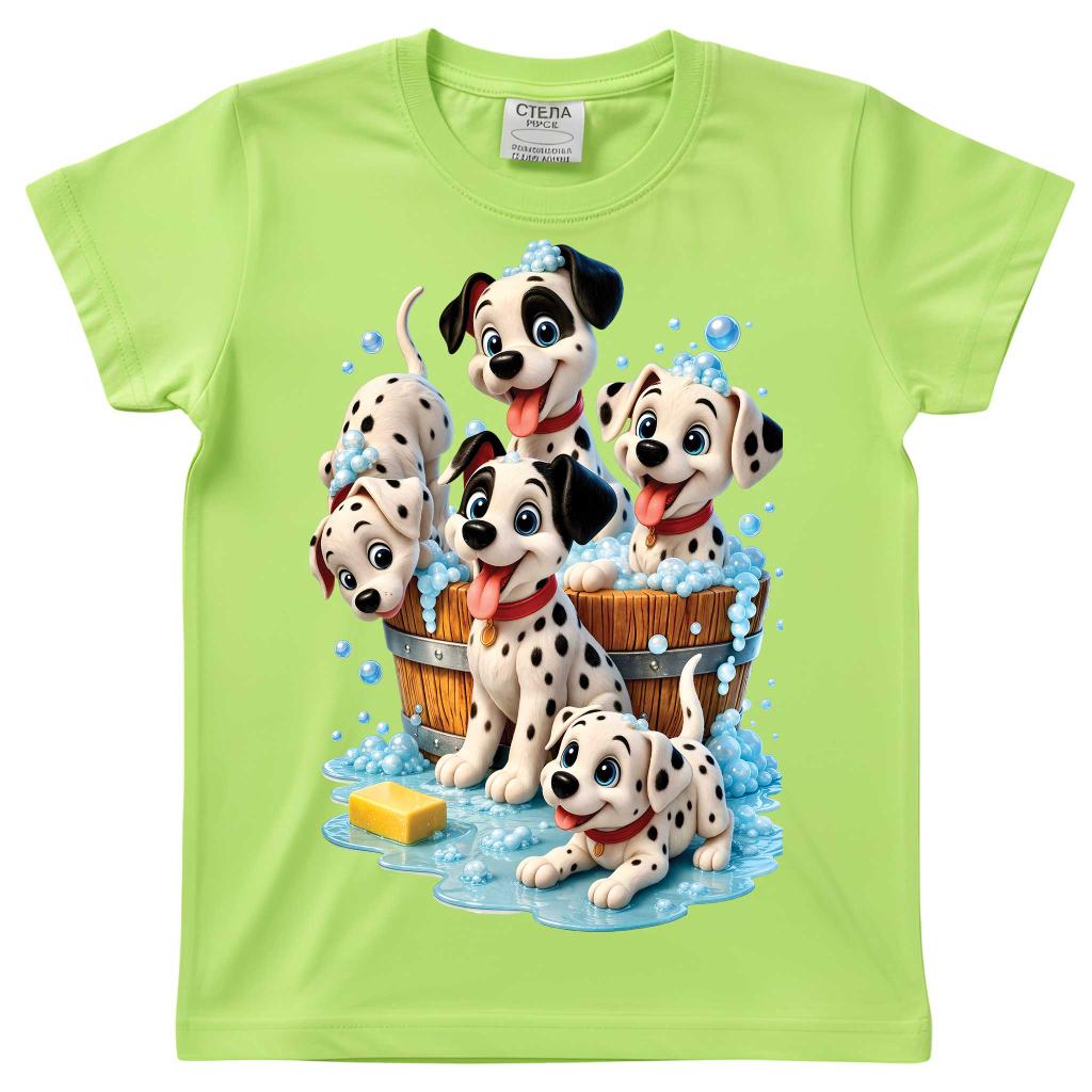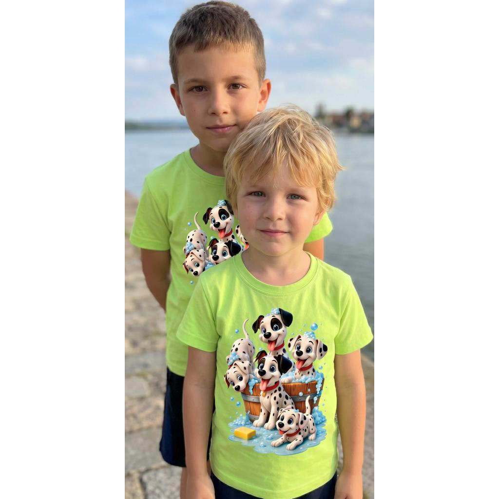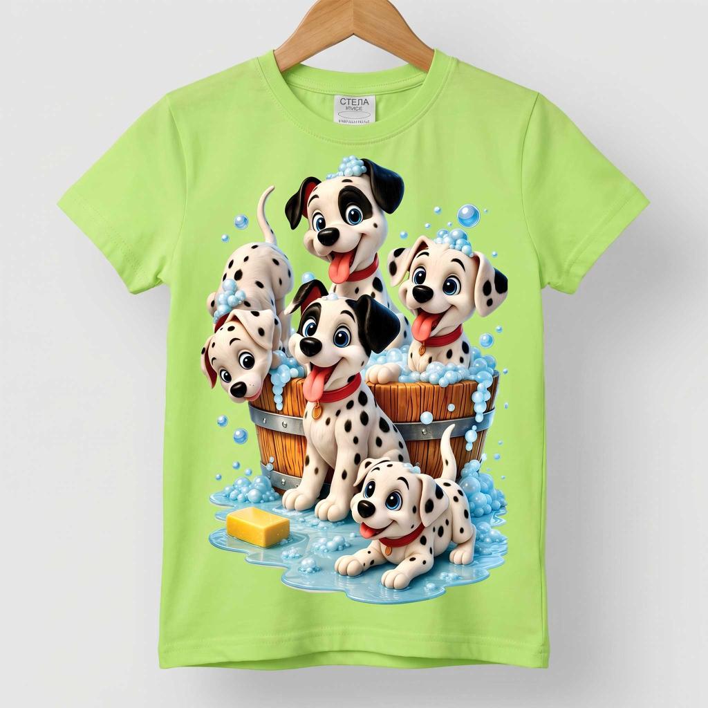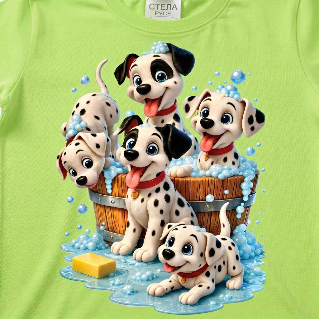 Веселие, игри и много настроение! 🫧🐾 Тази свежа зелена тениска е истински хит сред малчуганите с очарователния DTF печат на игриви далматинчета, които се къпят и пръскат сапунени мехурчета 💙