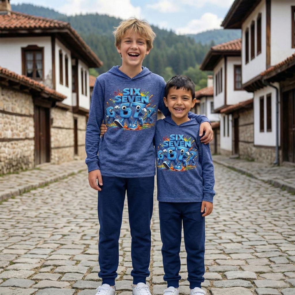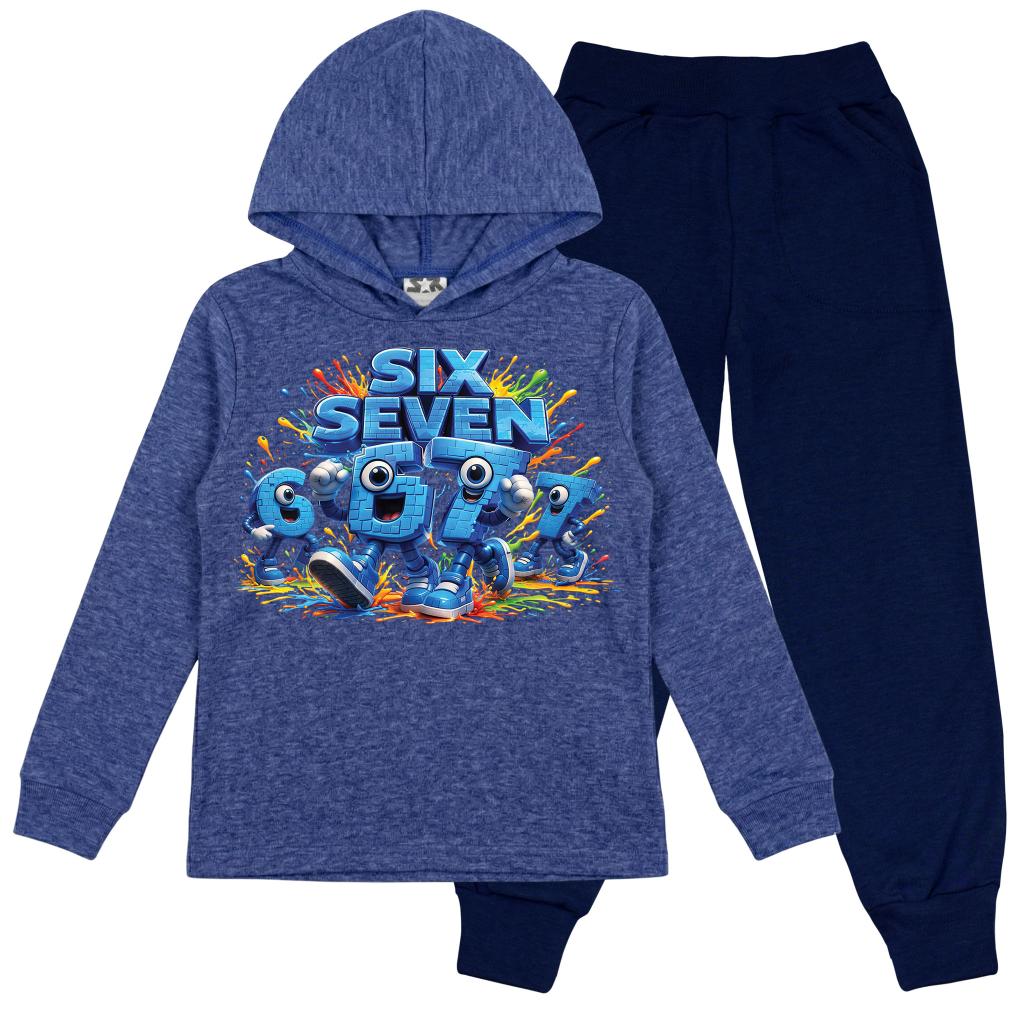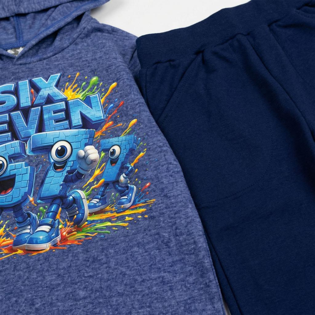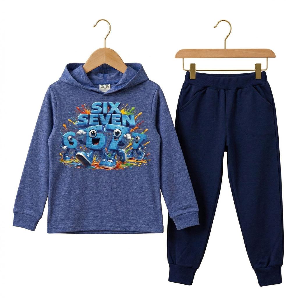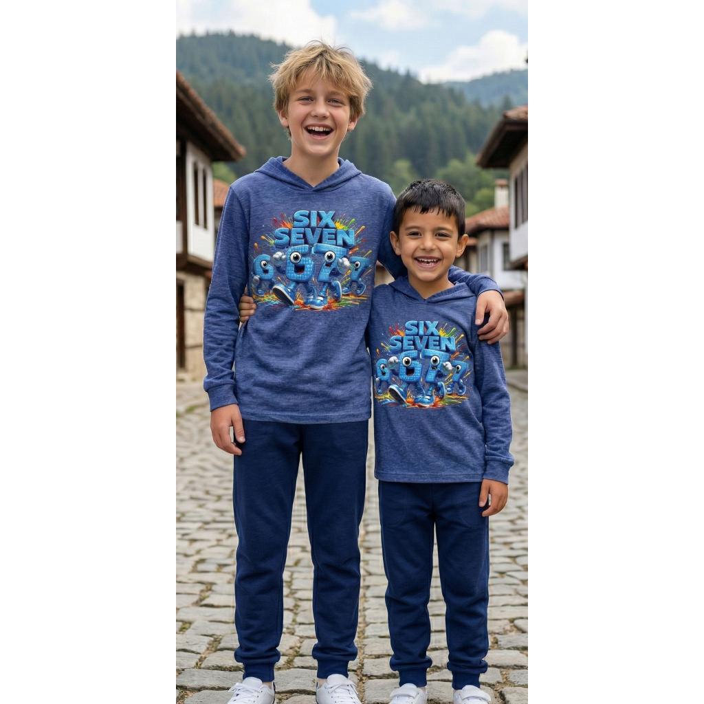 Готов комплект, готов за действие! 😍 Тази страхотна комбинация от синя блуза с качулка и тъмно долнище е създадена за малките герои, които не спират да се движат. Със свеж и цветен DTF печат „Six Seven“ 🎨🟦, визията е модерна, игрива и много любима на децата!