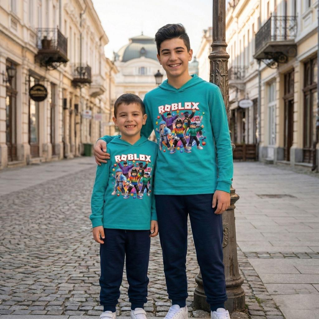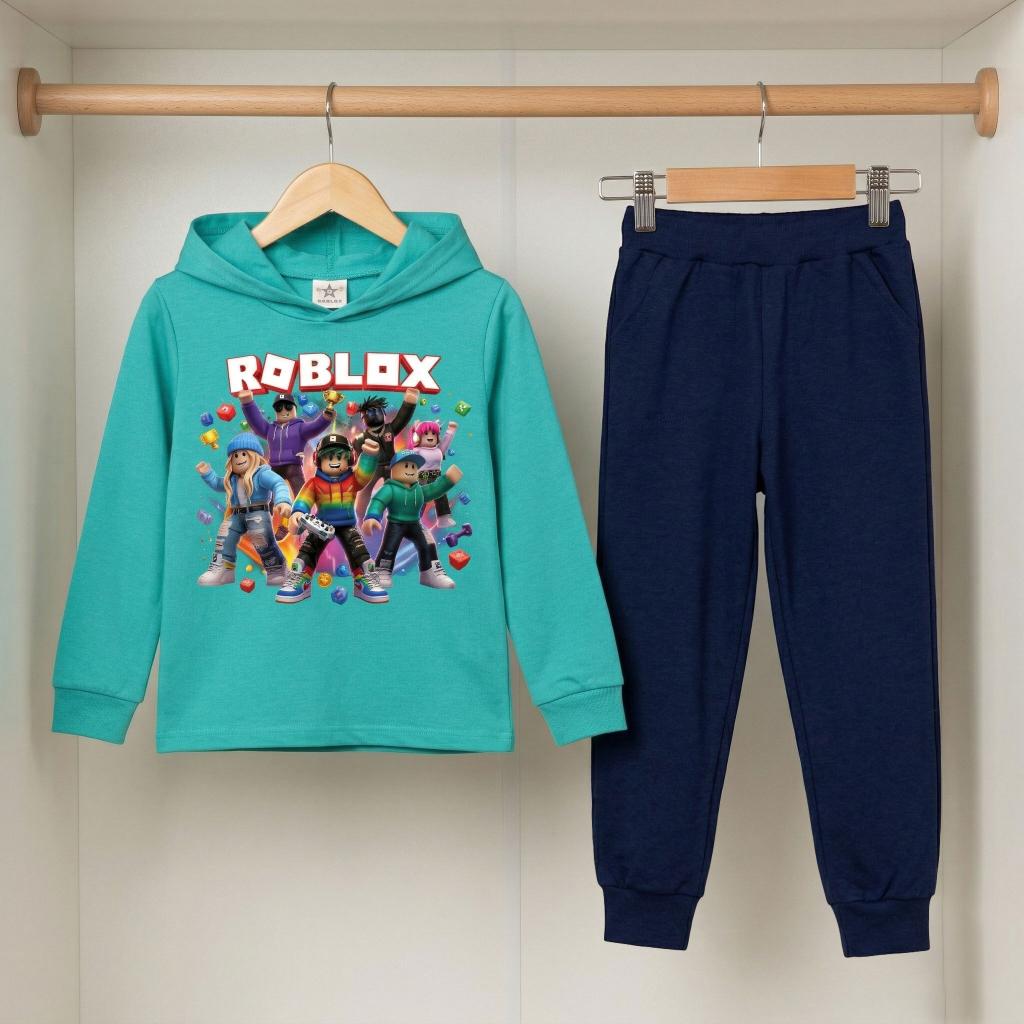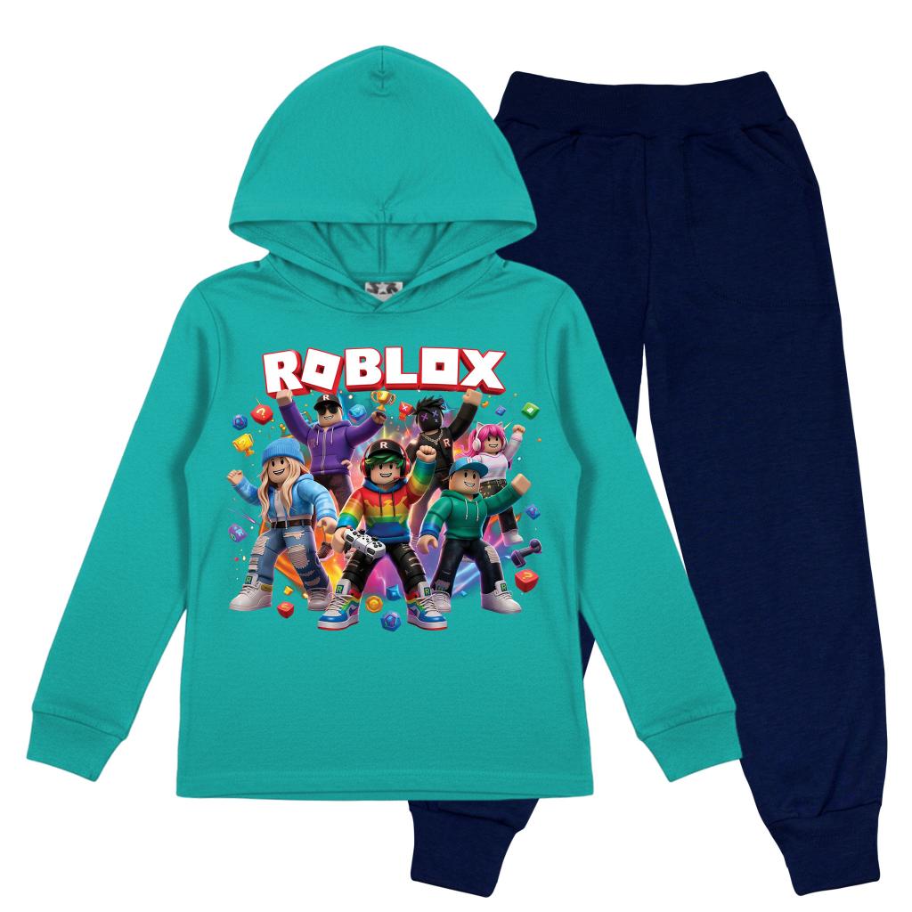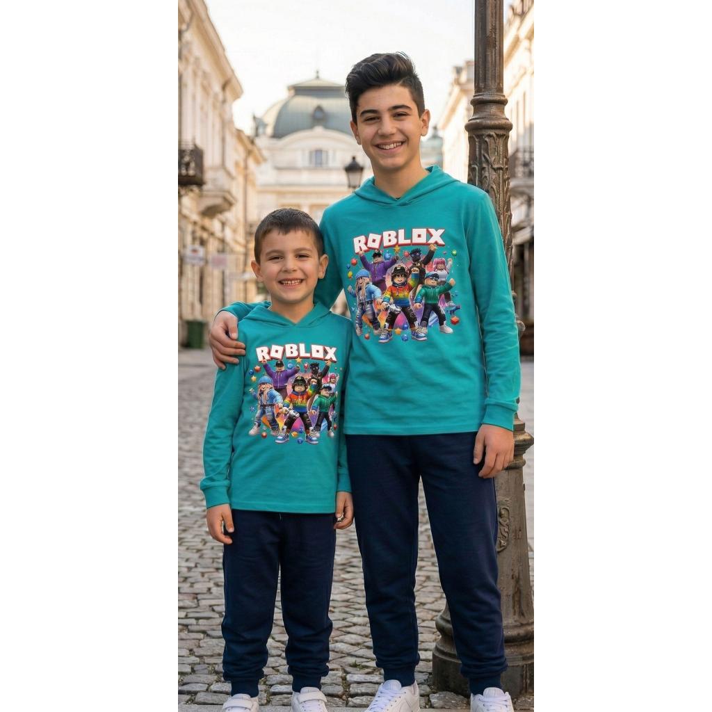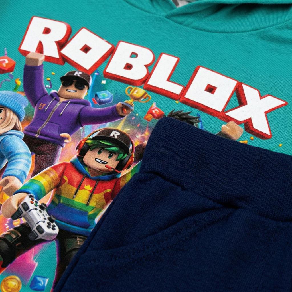 Готов за игра? 🎮✨ Този супер свеж комплект в тюркоаз и тъмно долнище е създаден за малки фенове на Roblox! С ефектен и цветен DTF печат, визията грабва вниманието още от пръв поглед и носи настроение през целия ден 😍