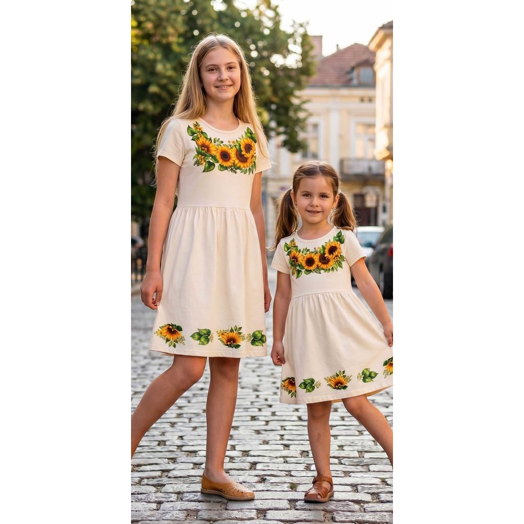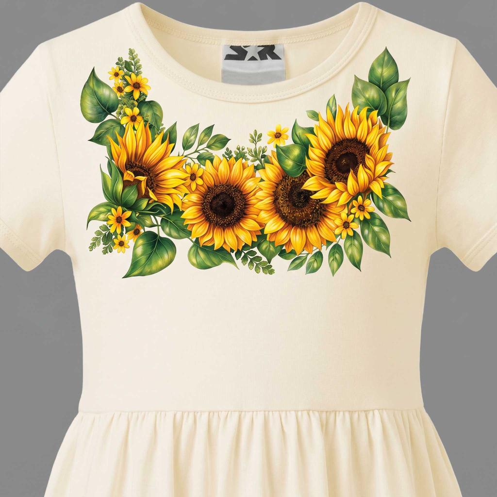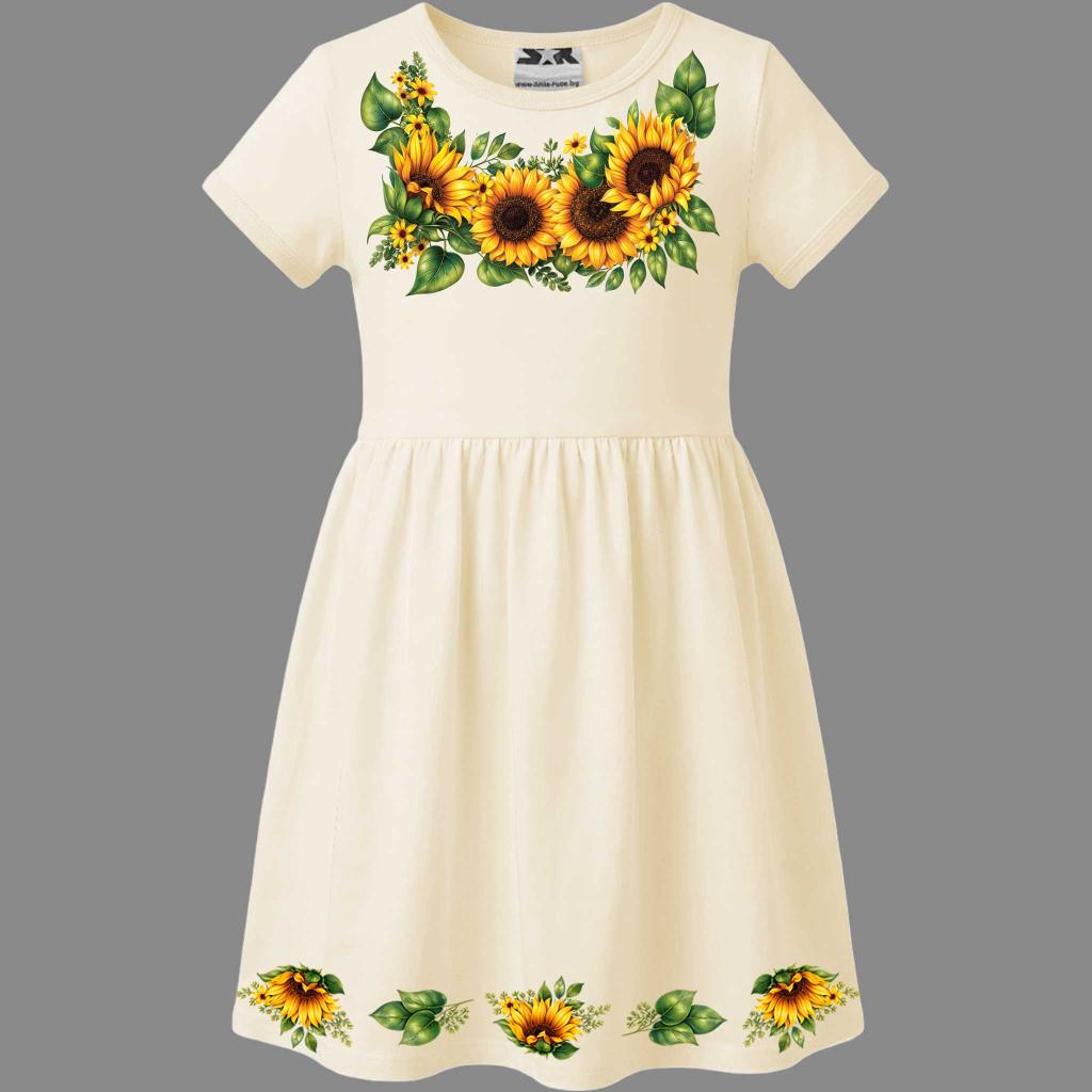Детска рокля с къс ръкав екрю – слънчогледи с DTF печат