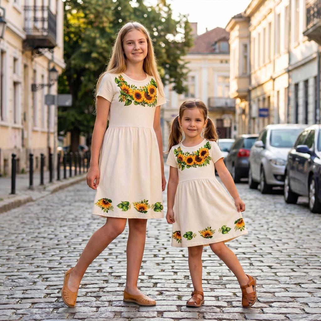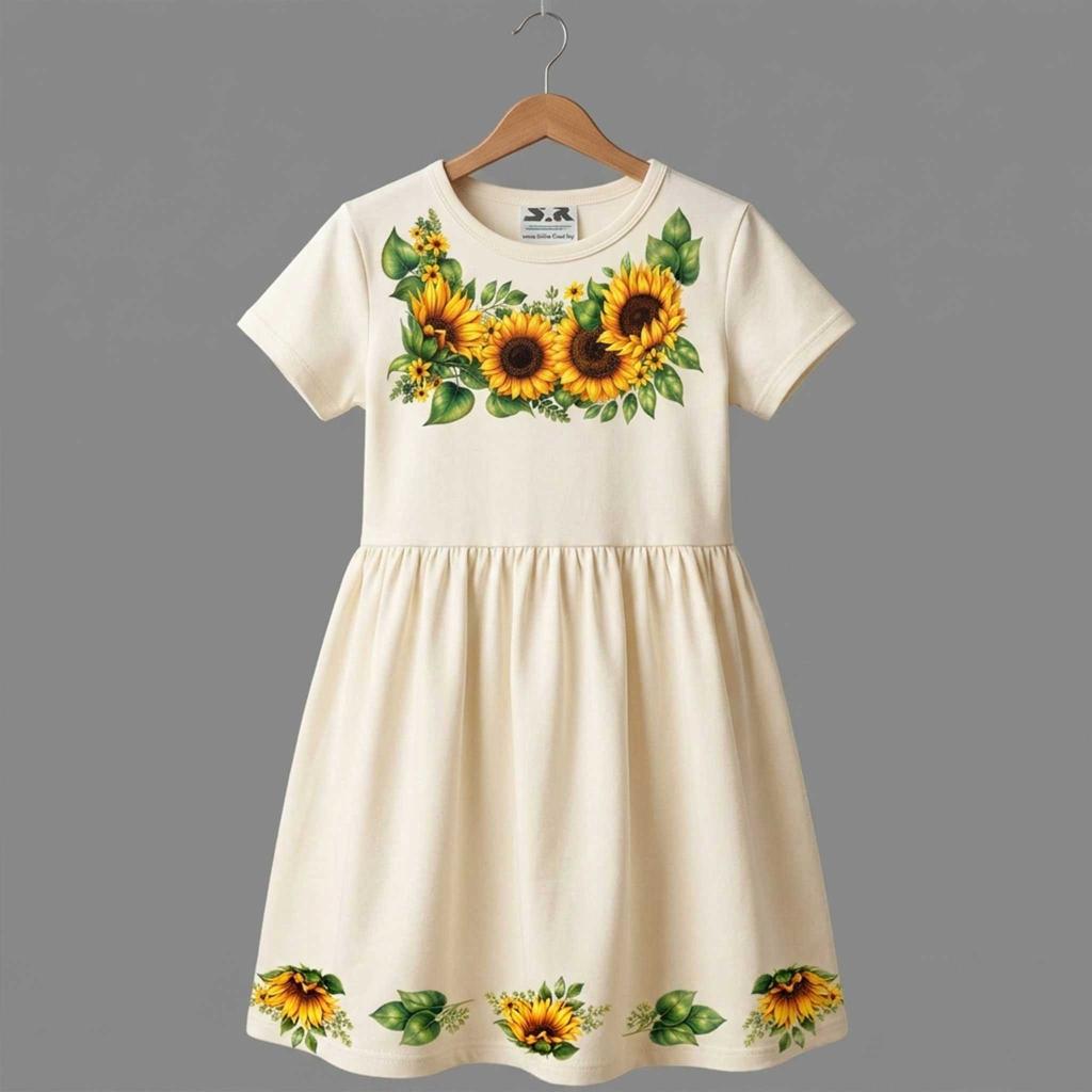 Слънчево настроение, уловено в рокля! ☀️🌻 Този нежен модел в цвят екрю грабва с красив DTF печат на слънчогледи, който носи усещане за топлина, природа и безгрижни детски дни.