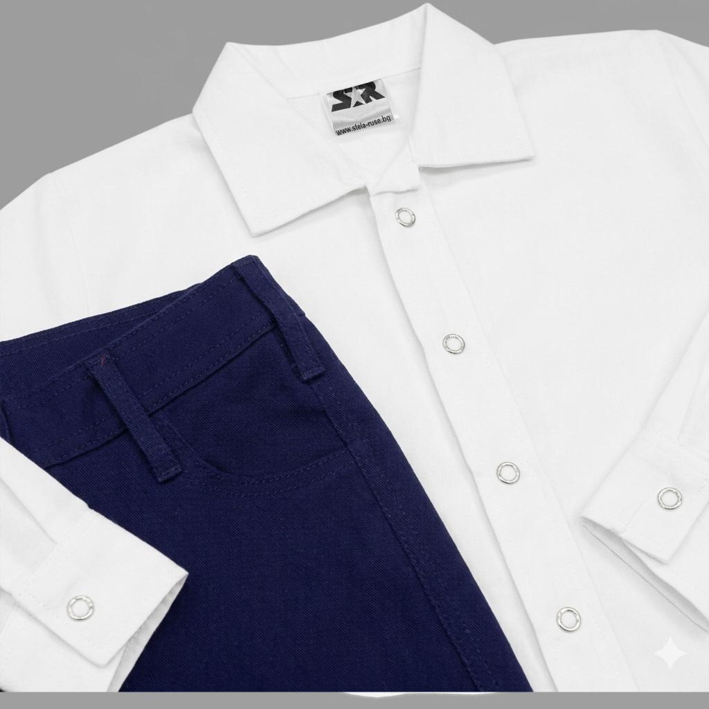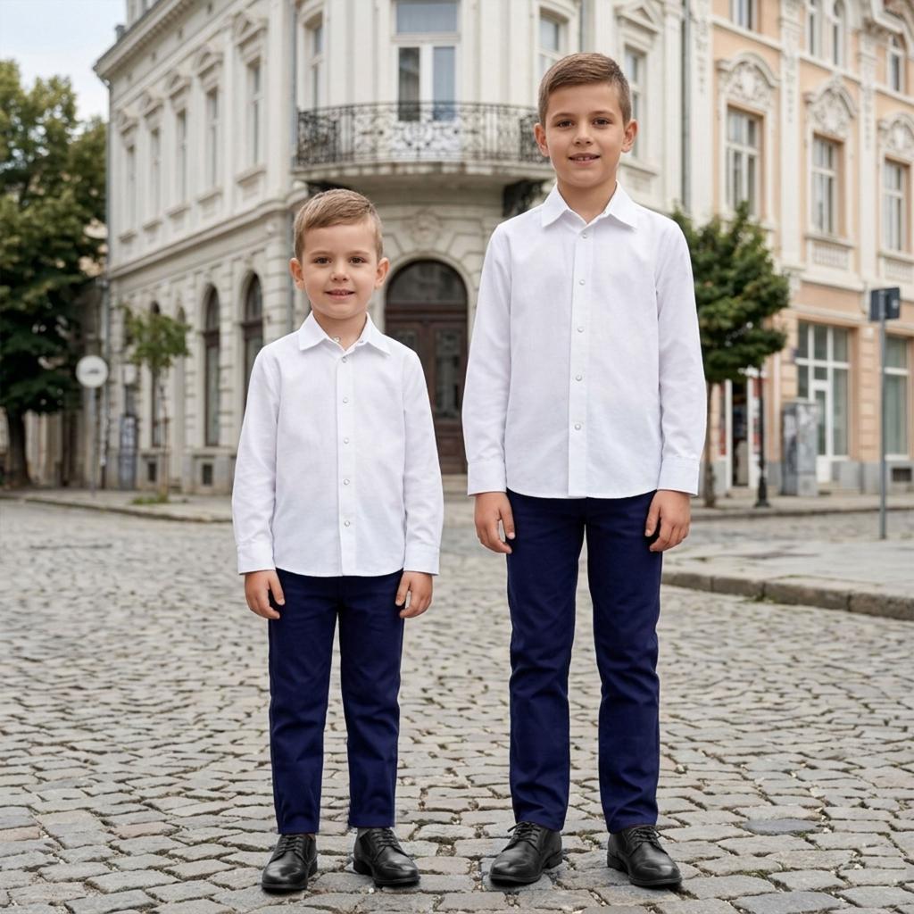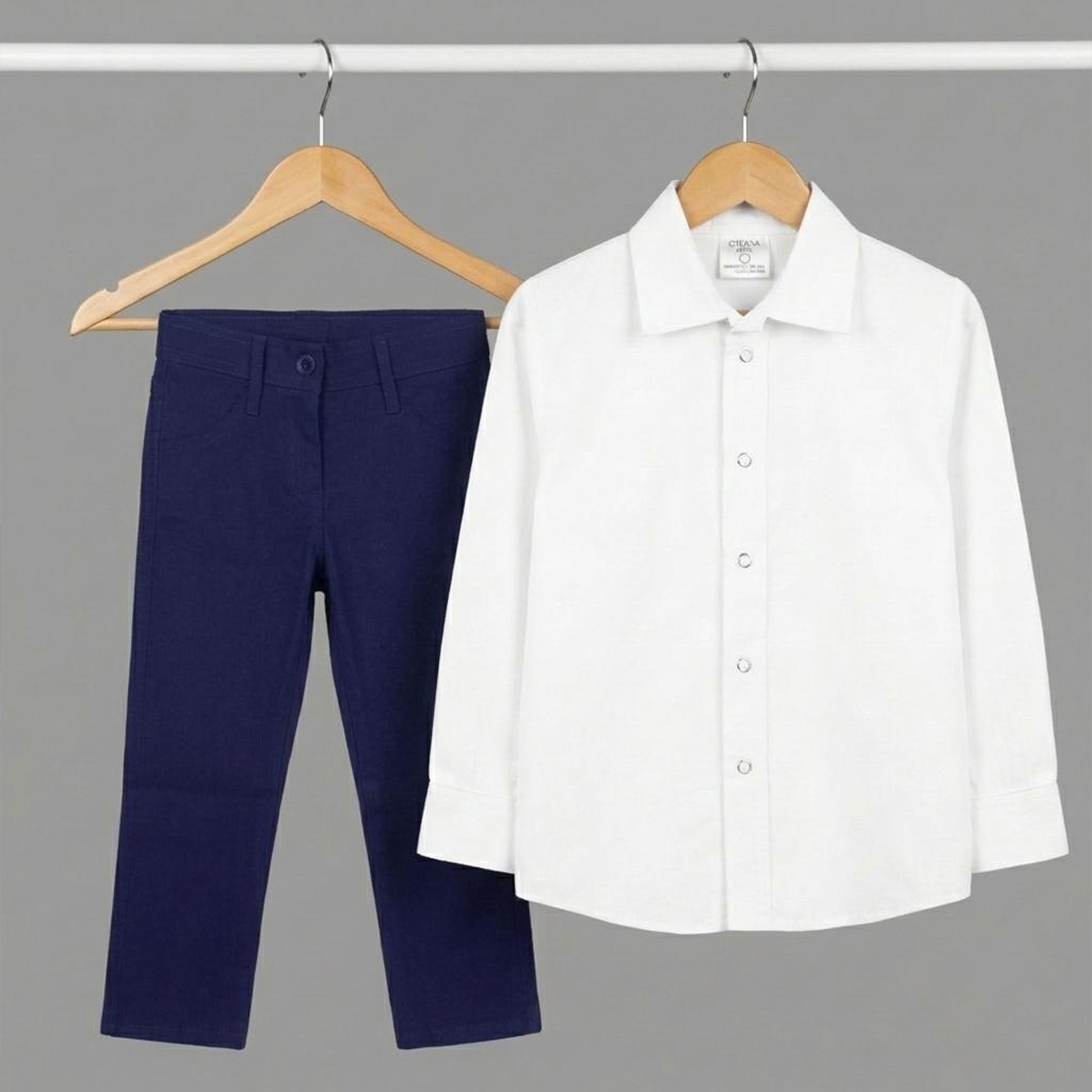 Този детски комплект с бяла риза и тъмносин спортно-елегантен панталон е перфектният избор за момчета, които трябва да изглеждат стилно, но и да се чувстват удобно 👌