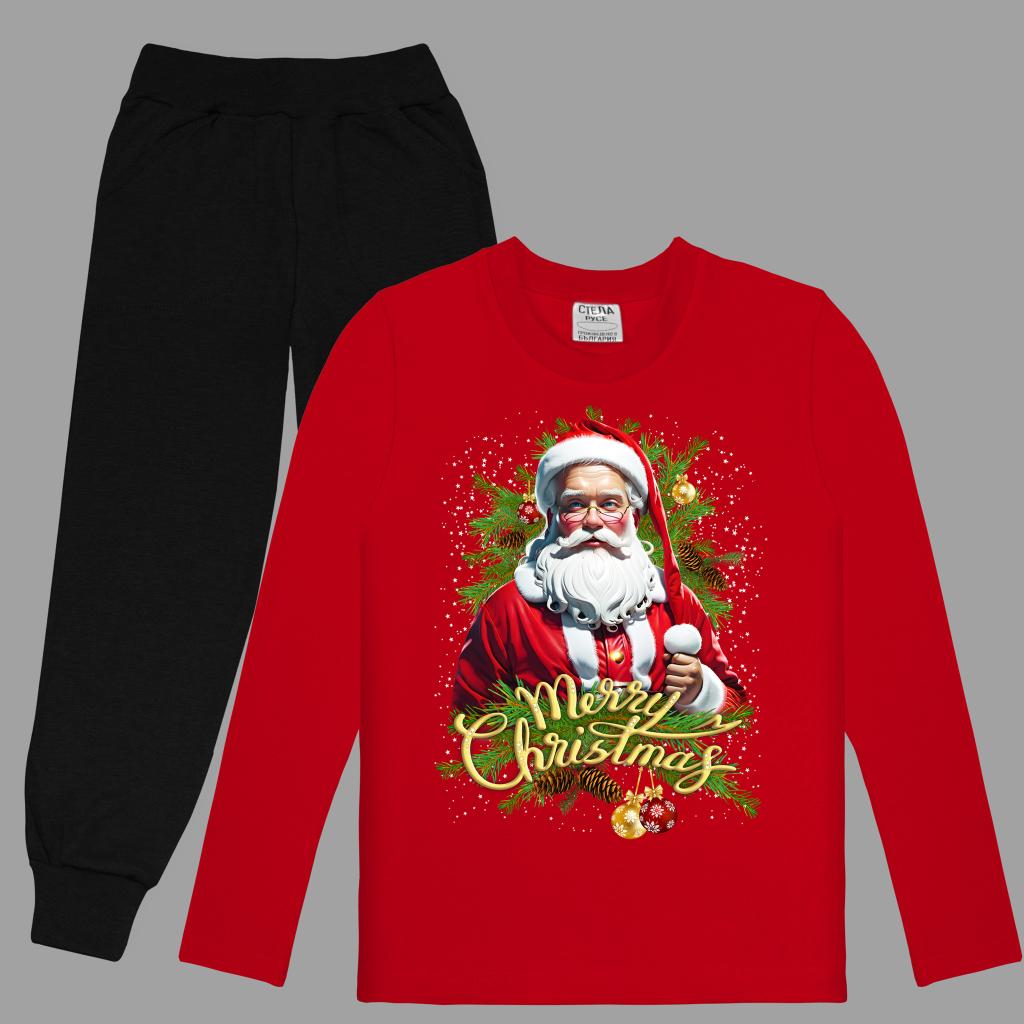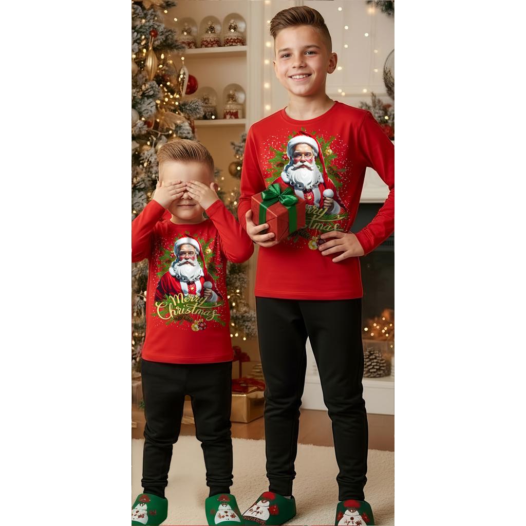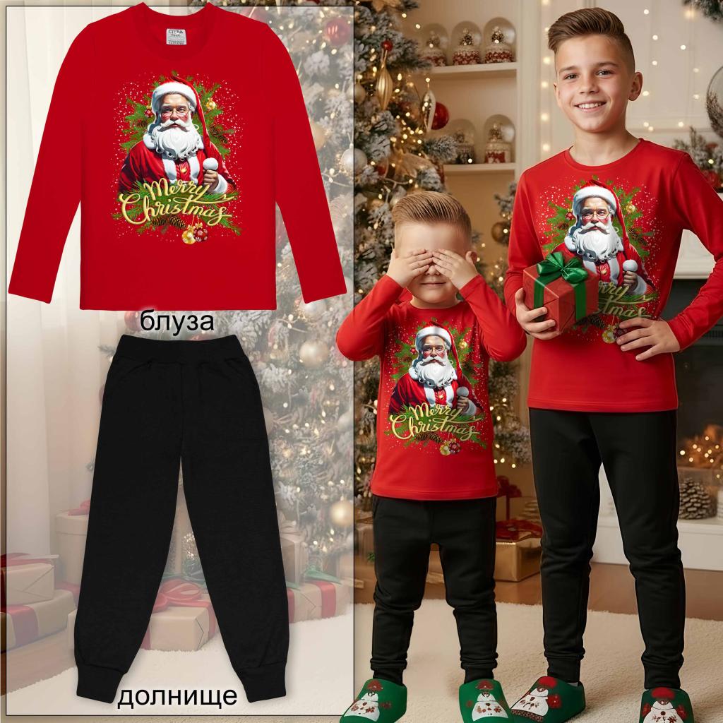 Горнище (Блуза): Дълъг ръкав в класическо коледно червено. Има голям, реалистичен принт на Дядо Коледа и пожеланието "Merry Christmas" (Весела Коледа), обградени от елхови клонки и златисти играчки.