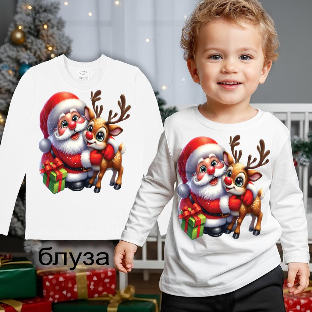 Герои: Бяла блуза, която служи за перфектен фон на очарователна сцена: Усмихнат Дядо Коледа в пълно облекло, прегърнал сладко еленче, което също носи червено-бял пуловер.