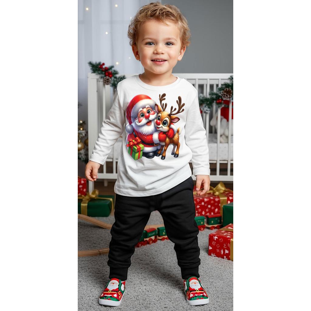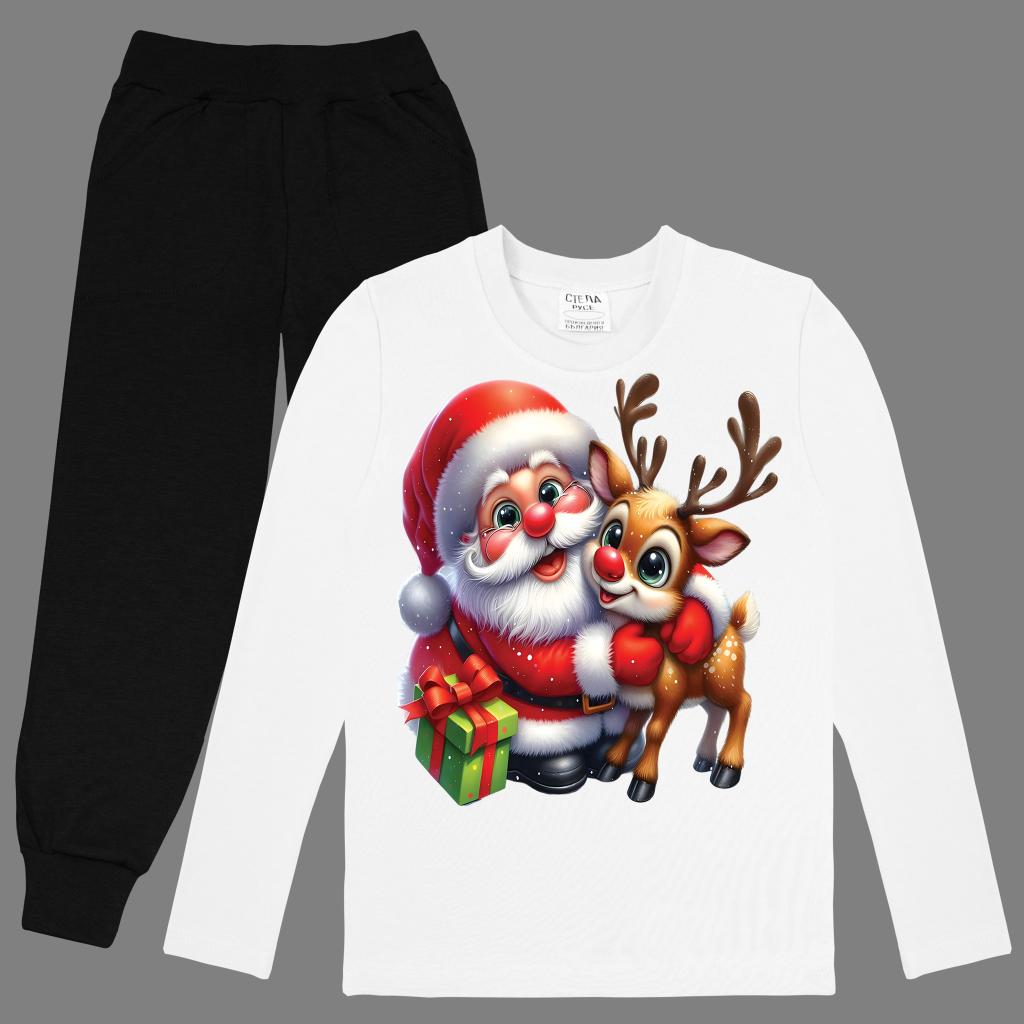 Горнище (Блуза): Дълъг ръкав в класическо бяло с принт, който стопля сърцето: Усмихнат Дядо Коледа, прегърнал своето сладко еленче, което също носи празничен пуловер. Принтът е весел, ярък и пълен с подаръци!