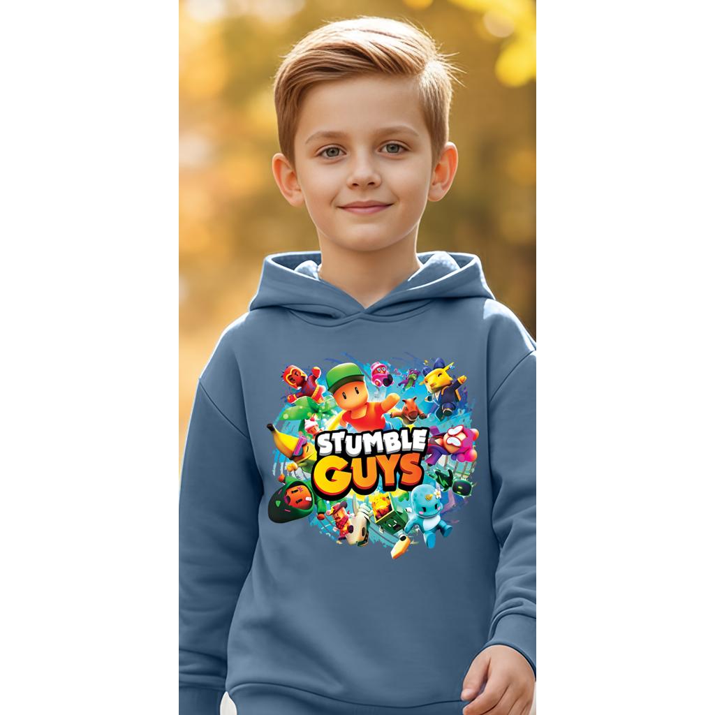 Време е за забавление и игри! Този суичър с качулка в наситен син цвят е задължителен за всеки фен на хитовата игра Stumble Guys! Перфектната дреха, с която детето ви ще се чувства комфортно и модерно, докато е в играта или навън.
