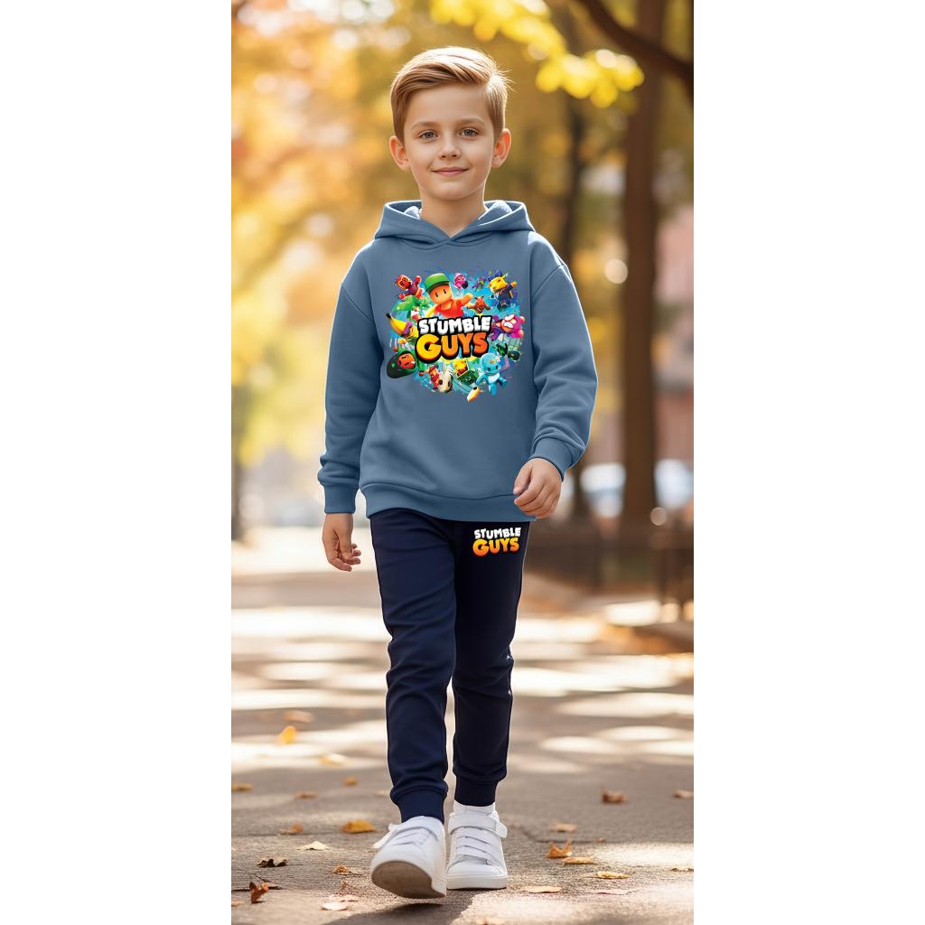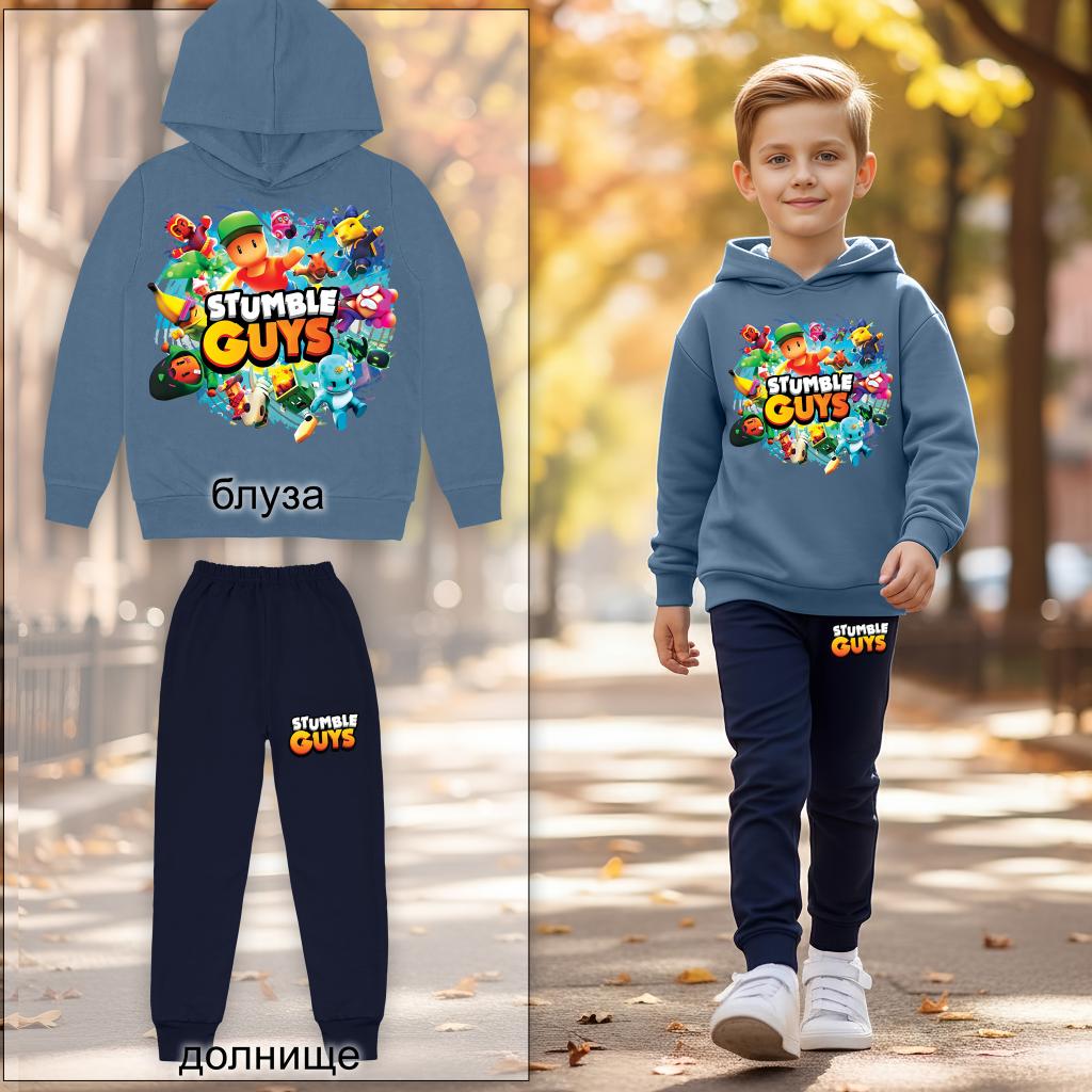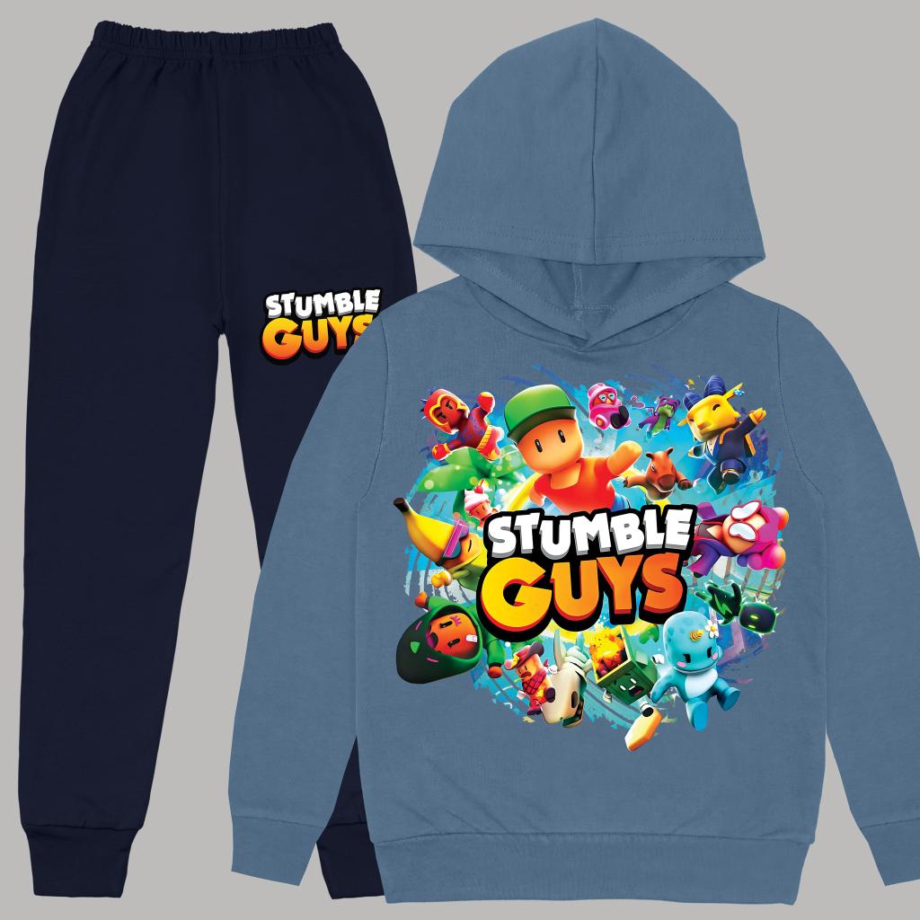 Горнище (Суичър): Суичър с качулка в стилен син цвят (или стоманено синьо). Принтът е голям и цветен, включващ логото STUMBLE GUYS и многобройните весели герои от играта.