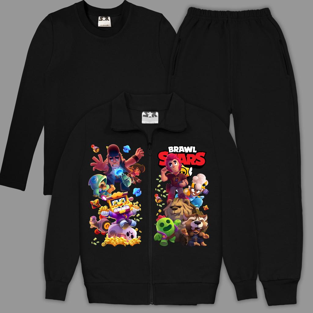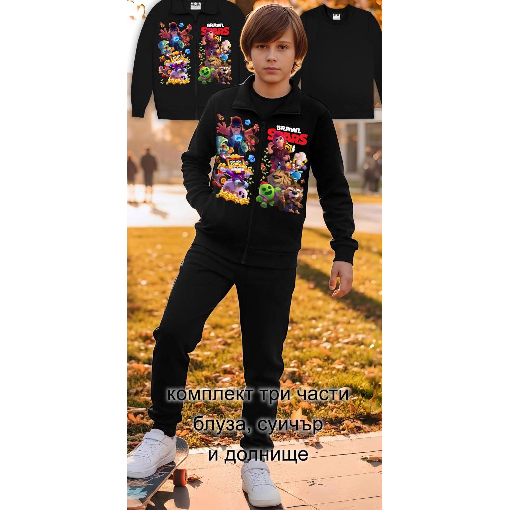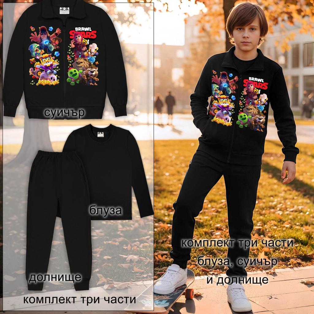 Най-якият сет за малки геймъри! Черният суичър с цип и принт на любимите герои от Brawl Stars идва в комплект с едноцветна блуза и универсално едноцветно долнище – удобство, стил и настроение в едно.
