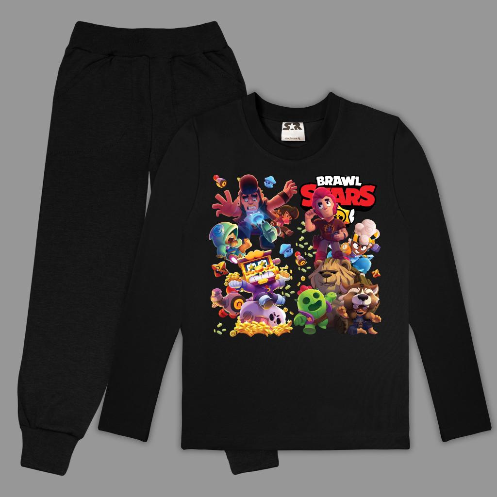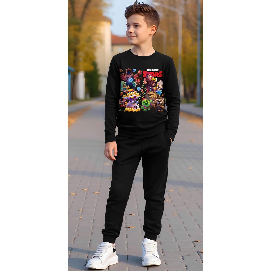 За фенове на игрите и модата! ⚡ Черната блуза с ярък Brawl Stars принт се комбинира с удобно едноцветно тъмно долнище – перфектен сет за училище, свободното време и забавленията с приятели.