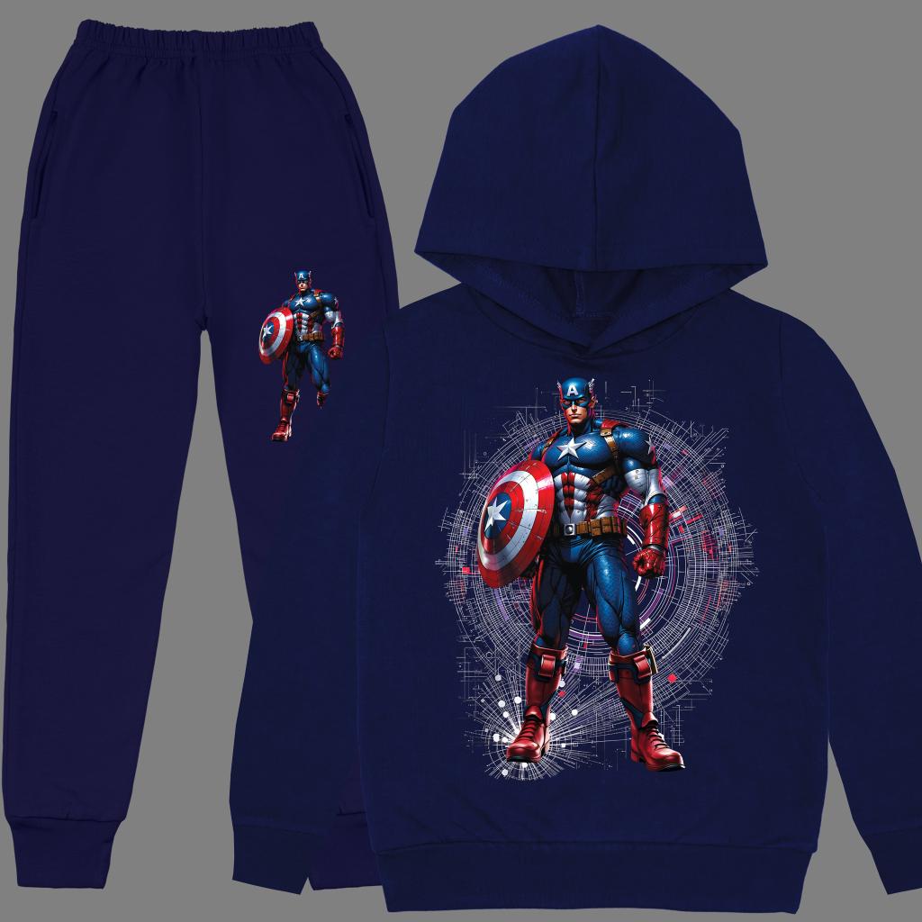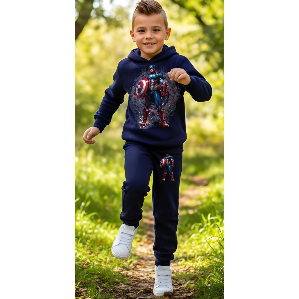 Тъмносинята блуза с DTF печат на Капитан Америка е съчетана с едноцветно долнище в удобна кройка – идеално за игри, спорт и ежедневие. Българският памук осигурява мекота и дишаща материя, която запазва формата си дори след много прания.