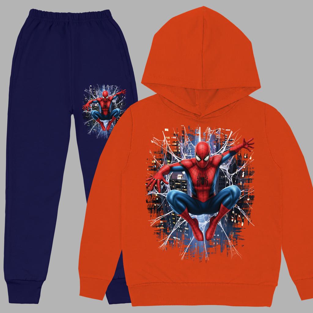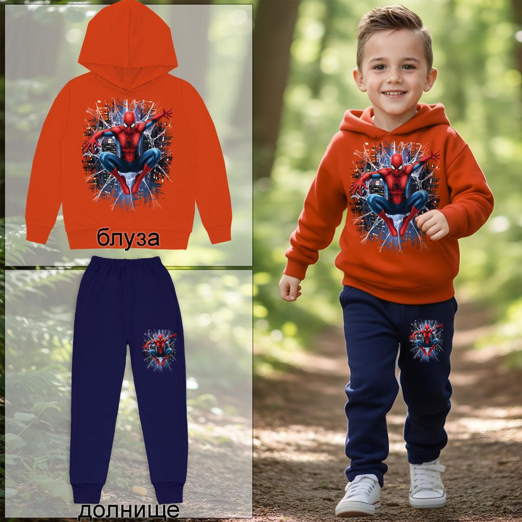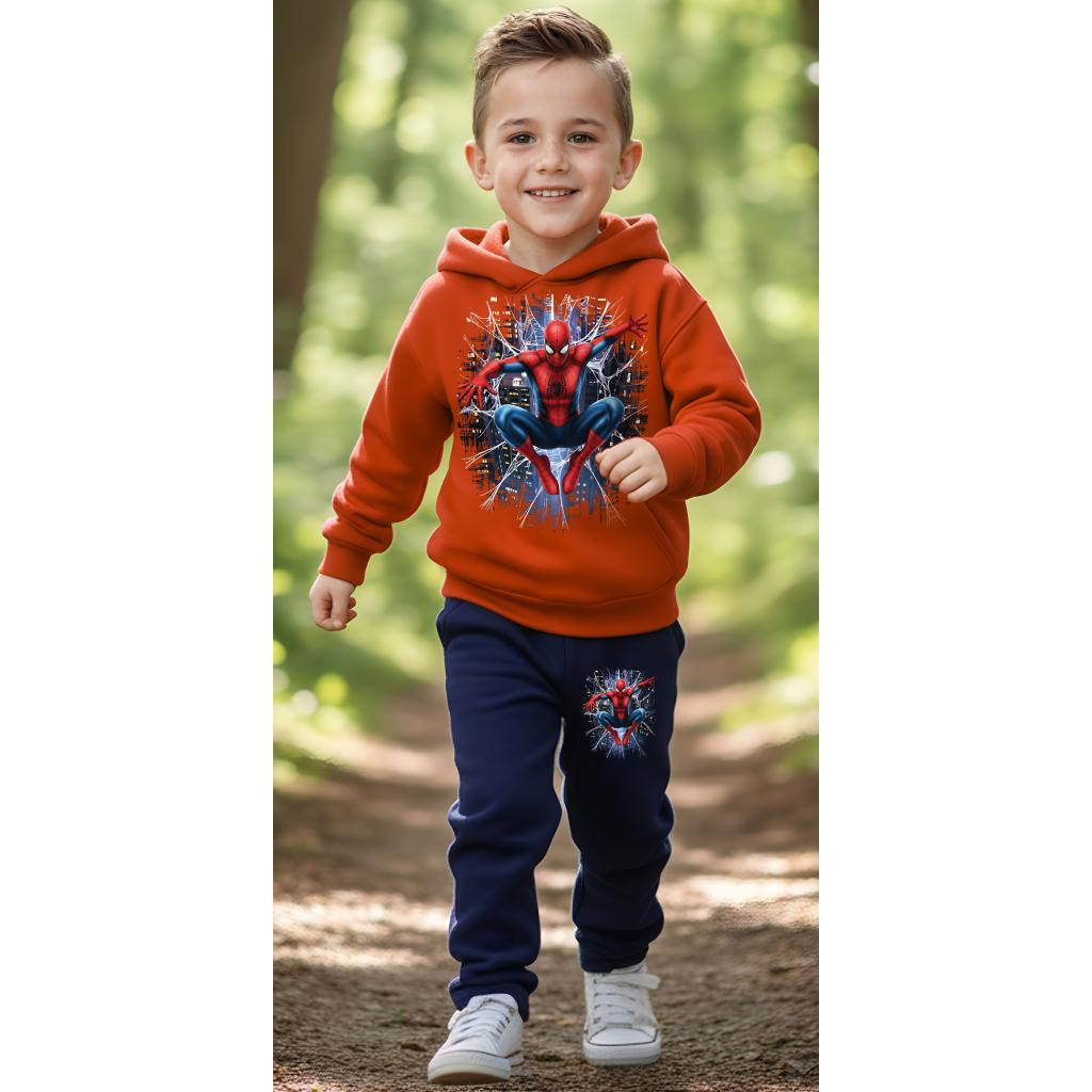 Този детски комплект „Спайдърмен“ включва блуза цвят керемида с качулка с впечатляващ DTF печат на любимия супергерой и удобно долнище в тъмен цвят, което допълва визията с баланс и стил.