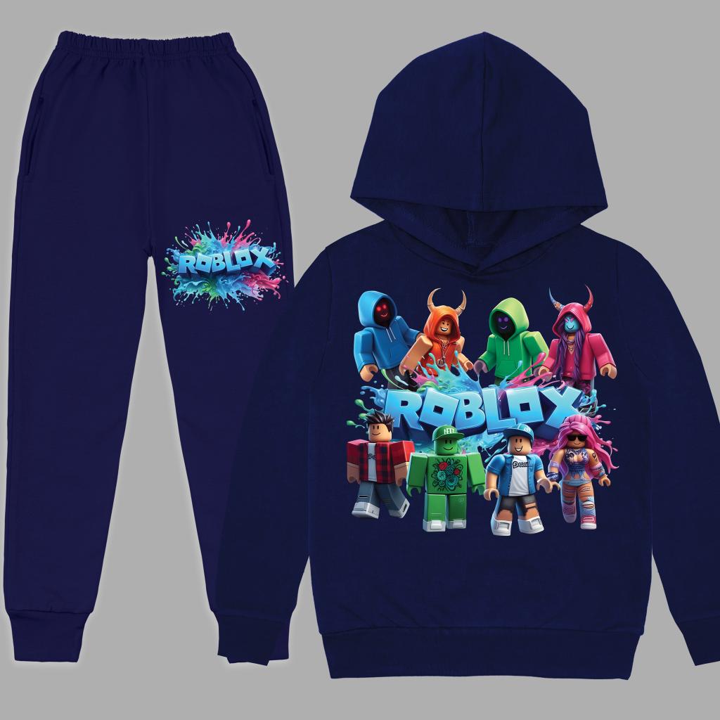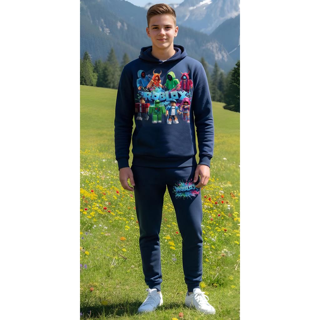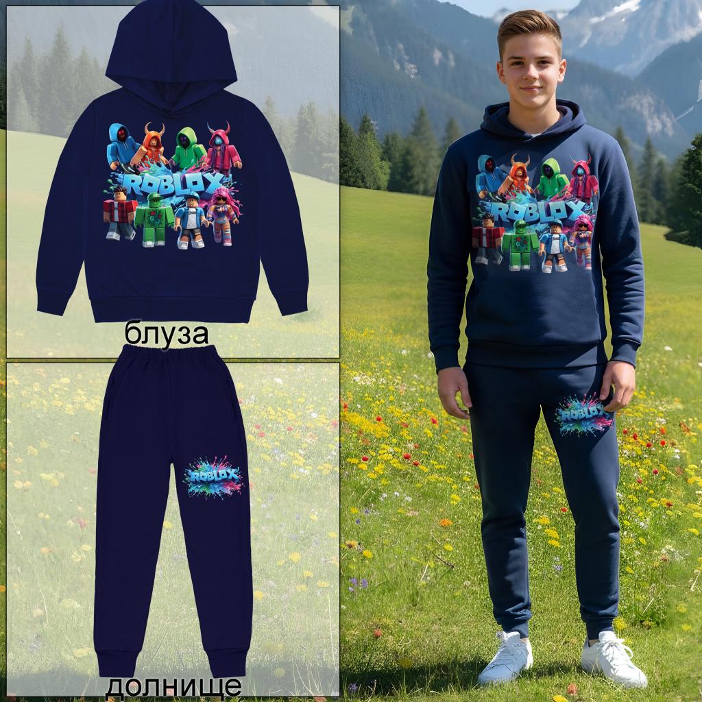 Комфортен детски комплект “ROBLOX Galaxy Team”, включващ тъмносин суичър с качулка и ефектен DTF печат на героите от Roblox 🧱, комбиниран с едноцветно спортно долнище в същия тъмносин нюанс.