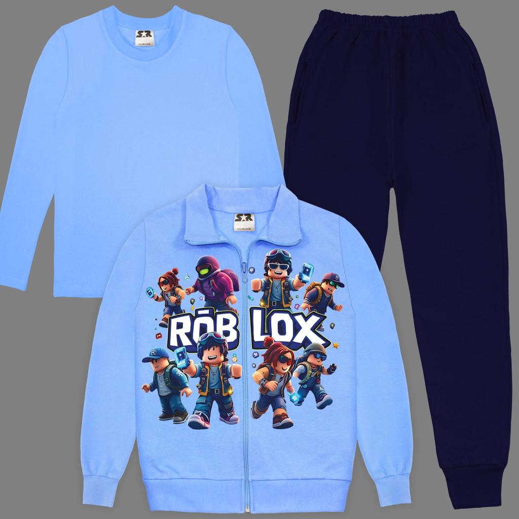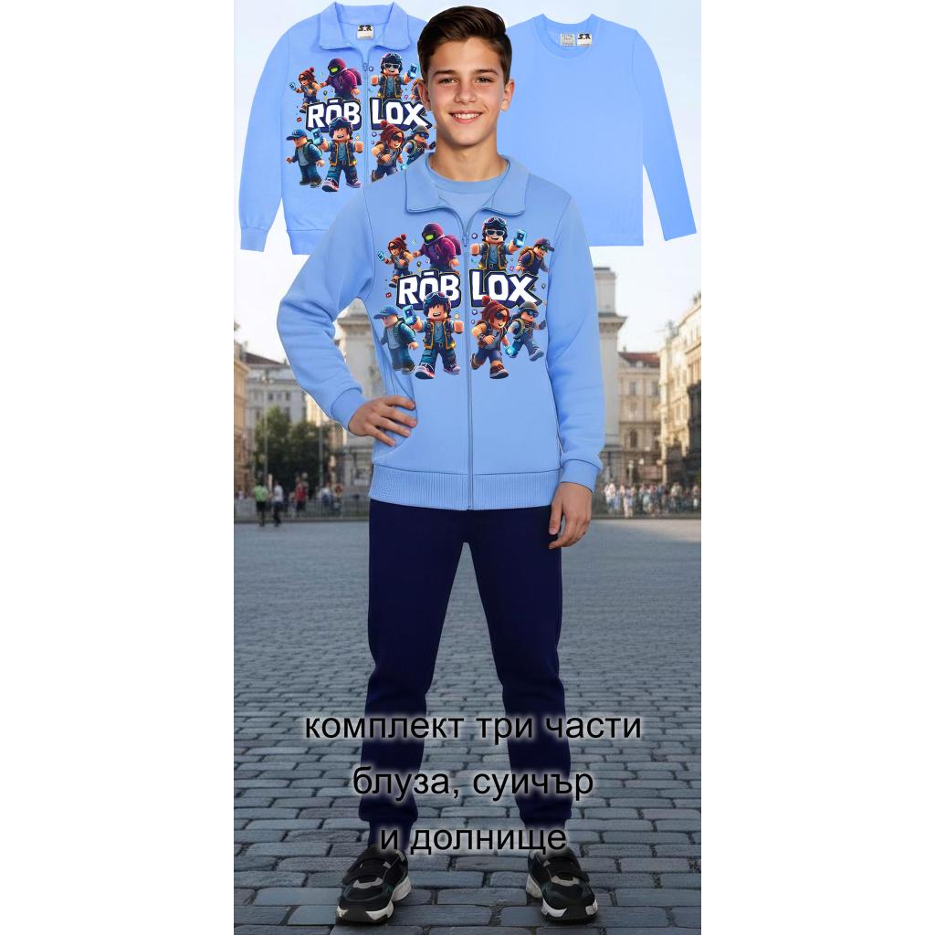 Включва суичър с ярък DTF печат Roblox, едноцветна блуза в същия тон и тъмно долнище, което завършва перфектно визията.