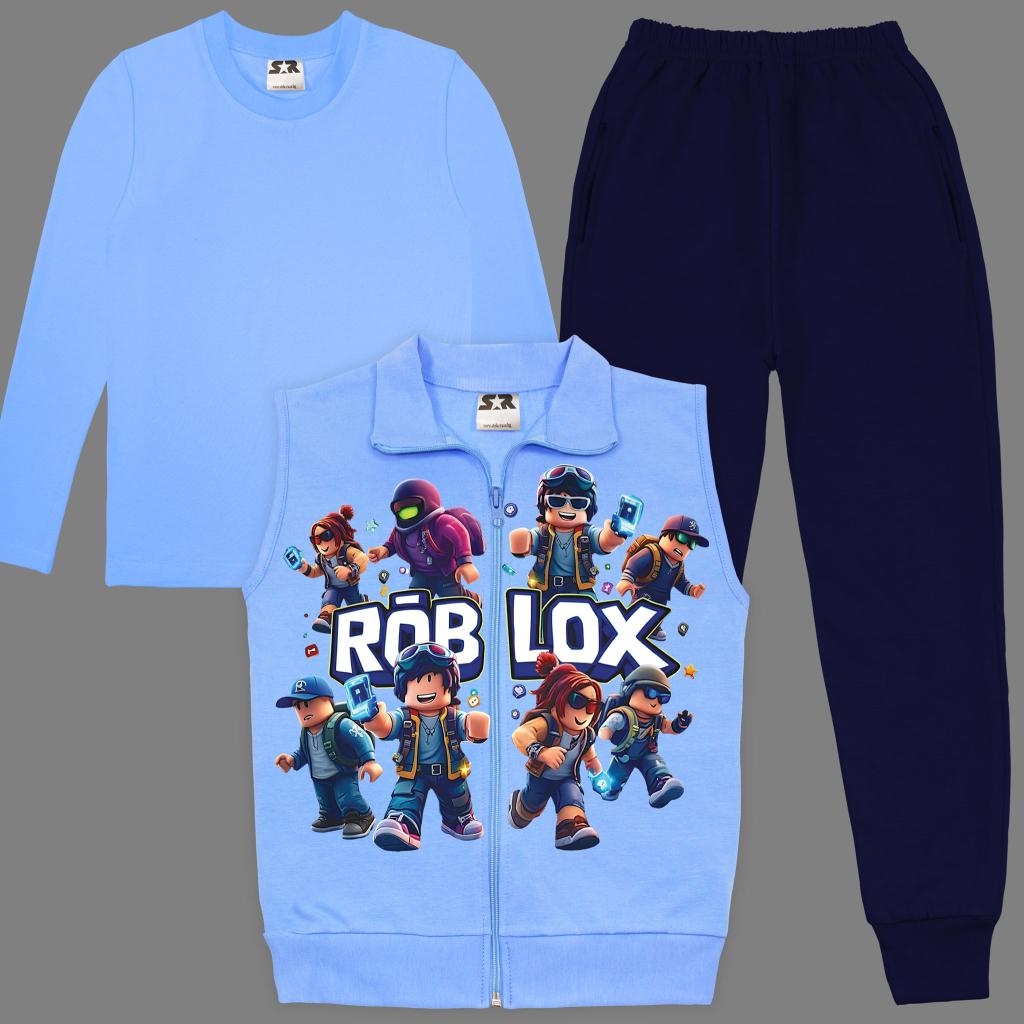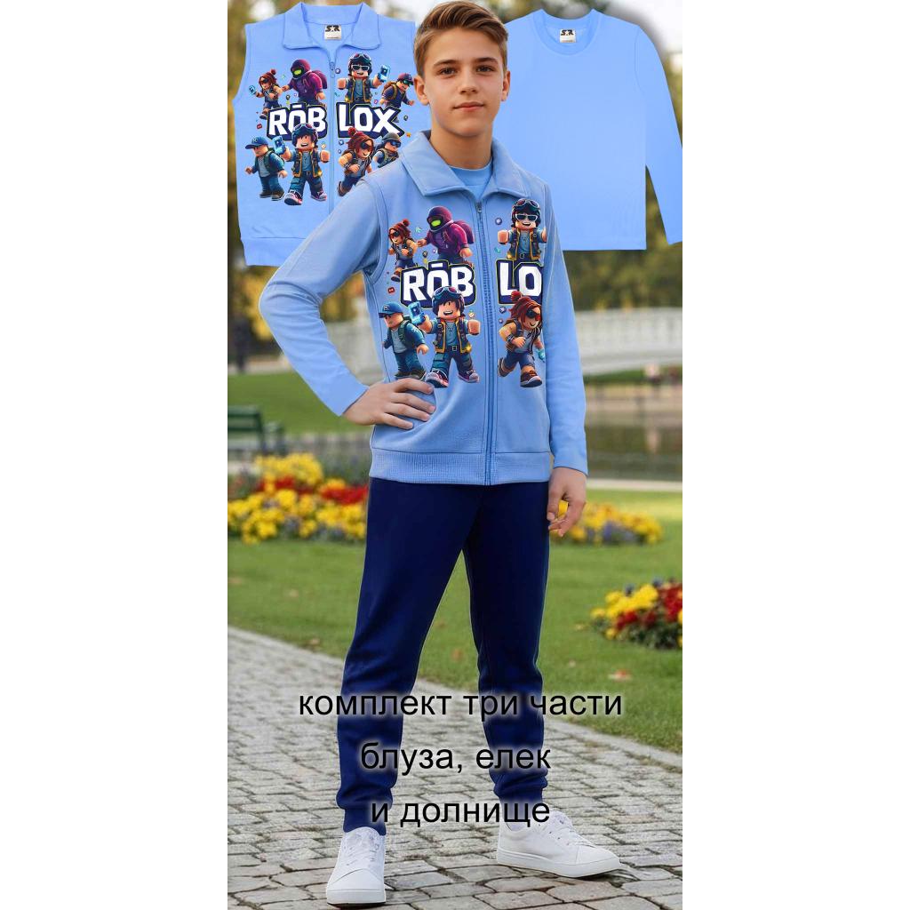 Елекът с любимите Roblox герои носи настроение и свеж стил, синята блуза добавя топлина и уют, а тъмното долнище завършва визията с универсален чар. 🩵👖