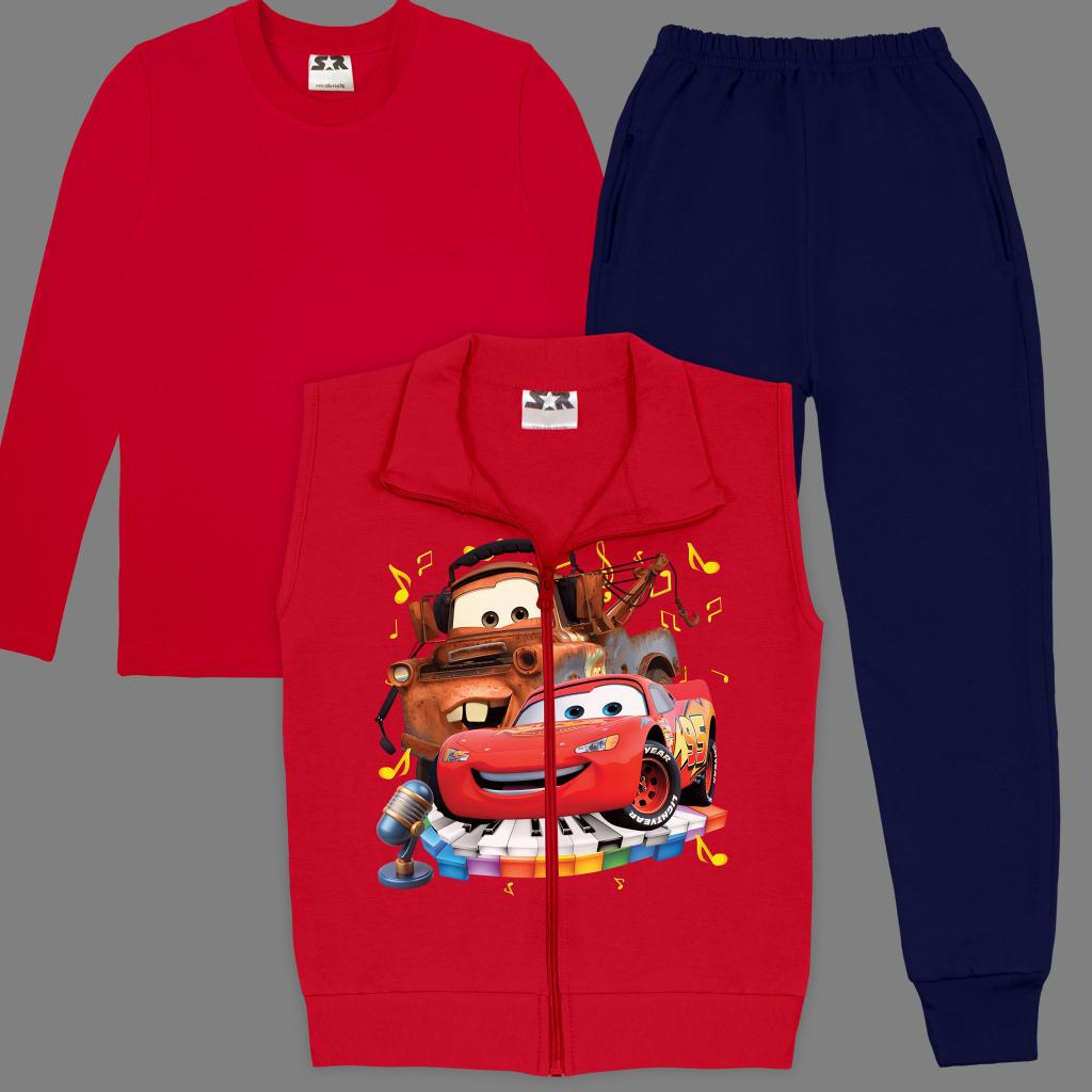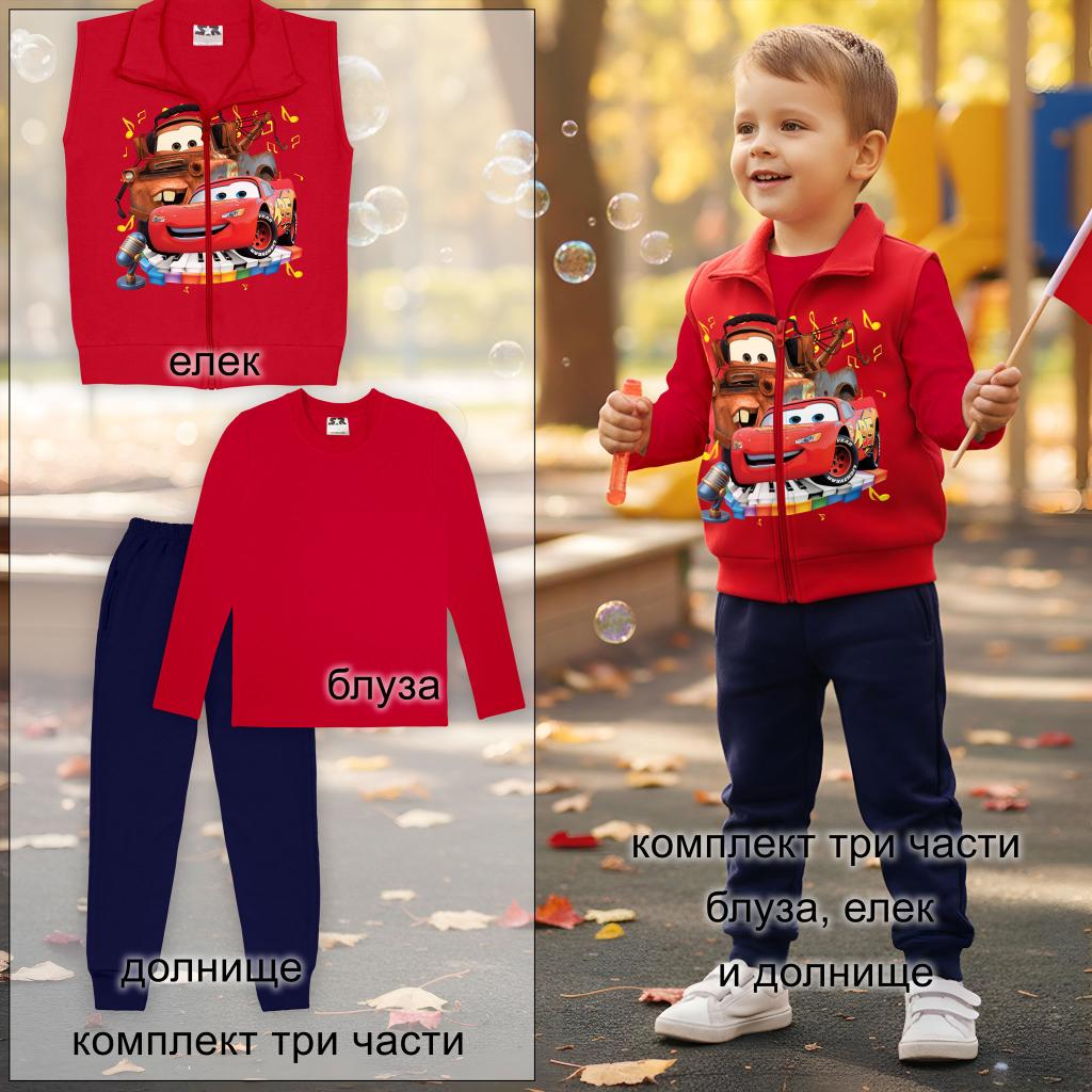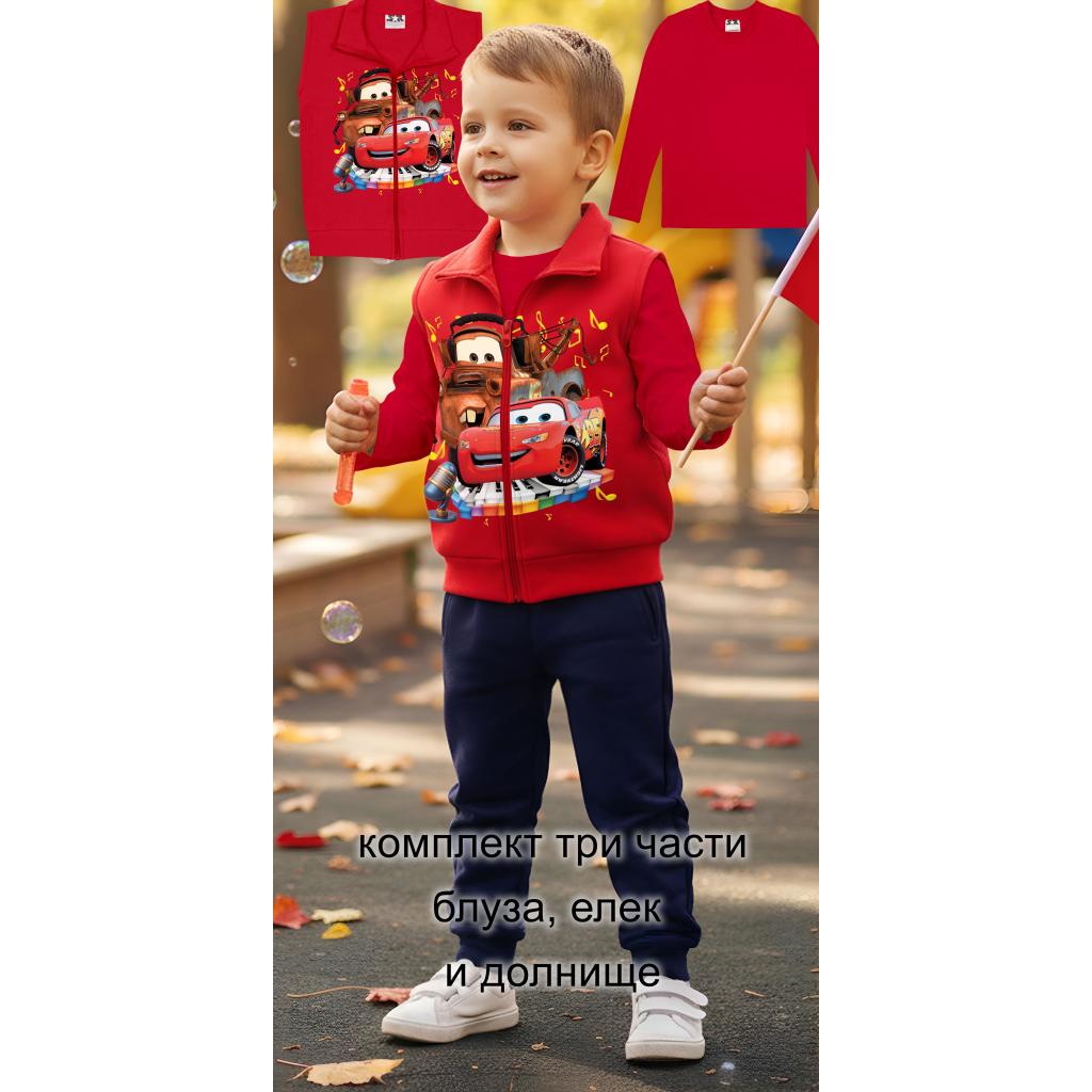 Този троен комплект McQueen комбинира комфорт, практичност и любим герой в един впечатляващ аутфит! Състои се от мека едноцветна блуза, удобно тъмно долнище и елегантен елек с принт McQueen – идеален за активните момчета, които не спират да се движат!