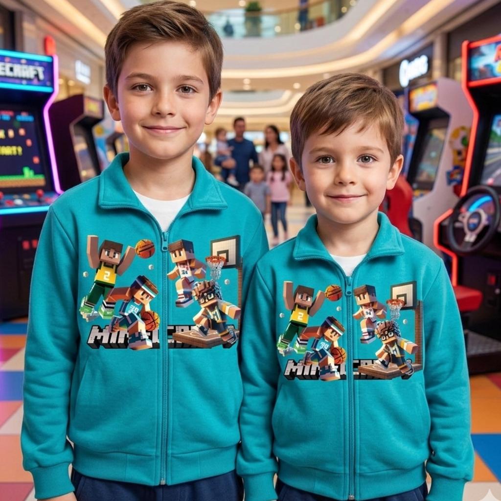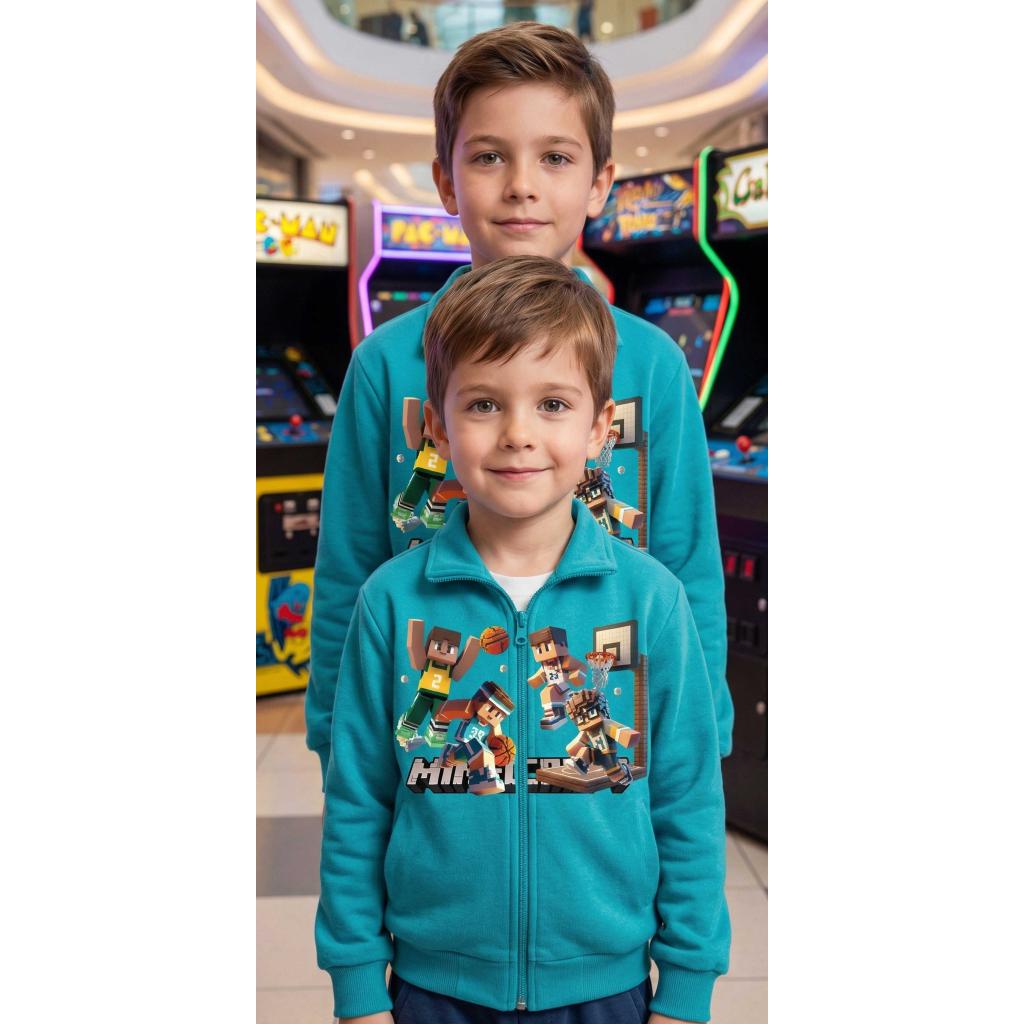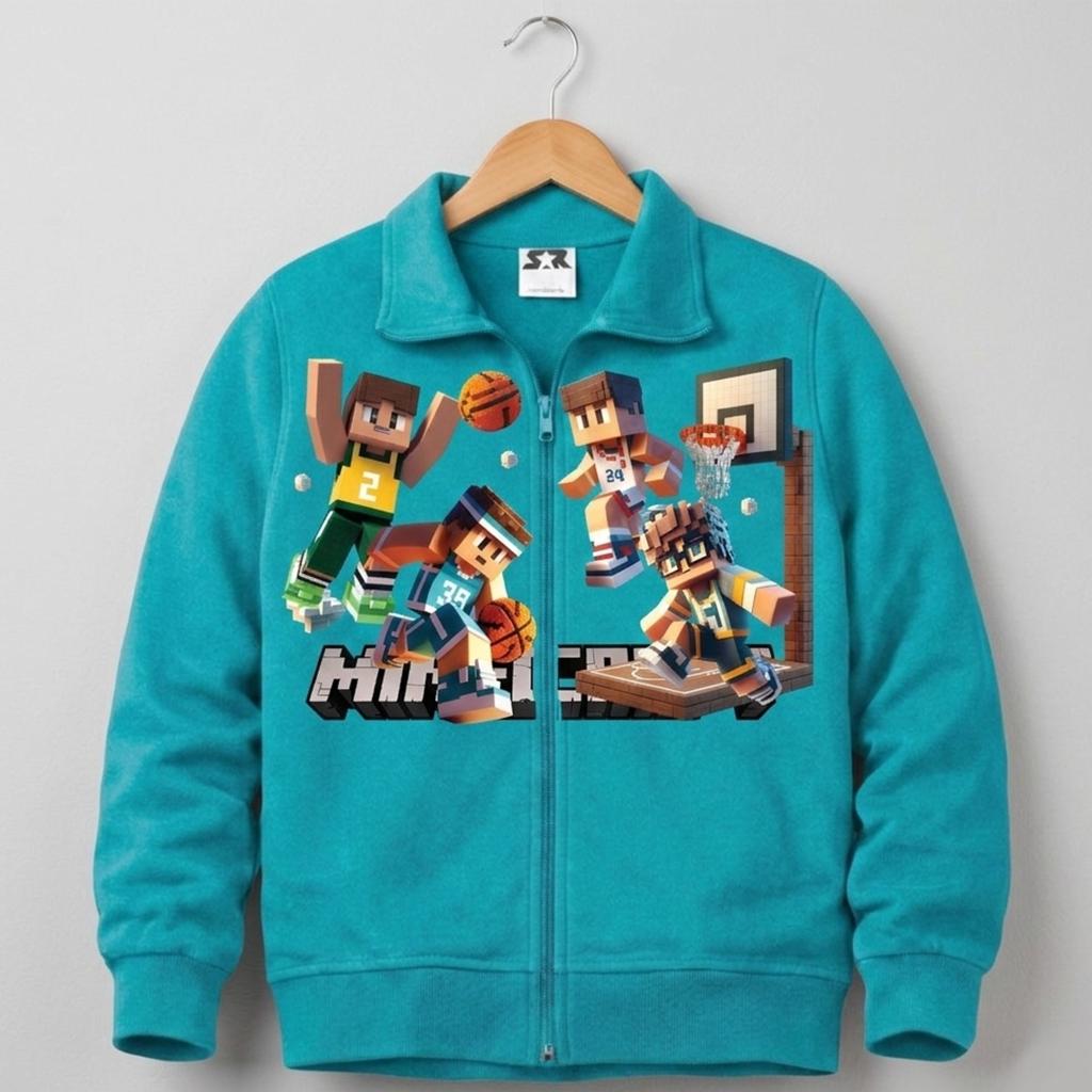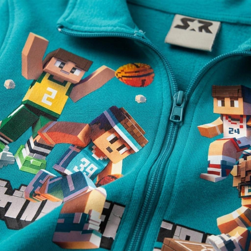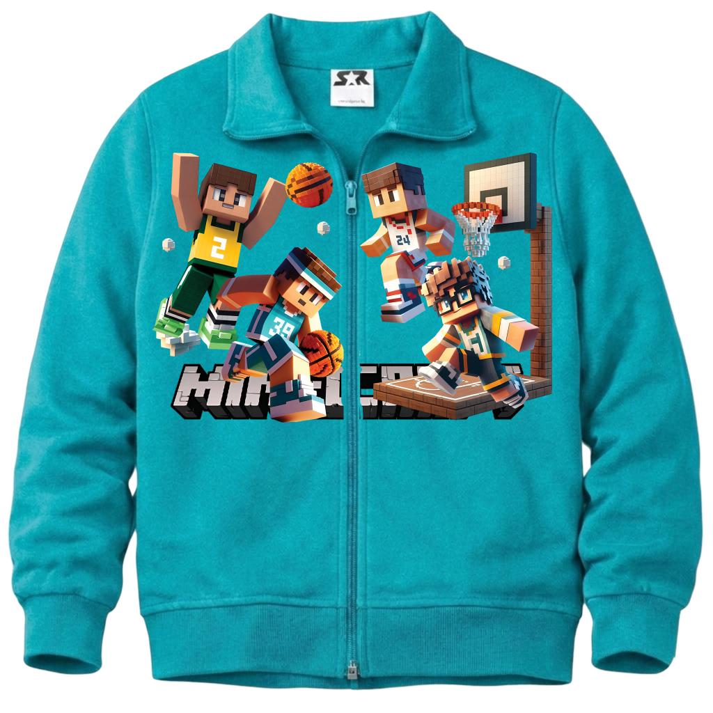 Тъмносин суичър с пълно закопчаване и яка, изработен от висококачествен български памучен плат, с ярък и траен ДТФ печат на баскетболни герои от Minecraft.