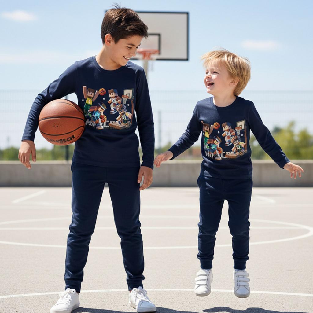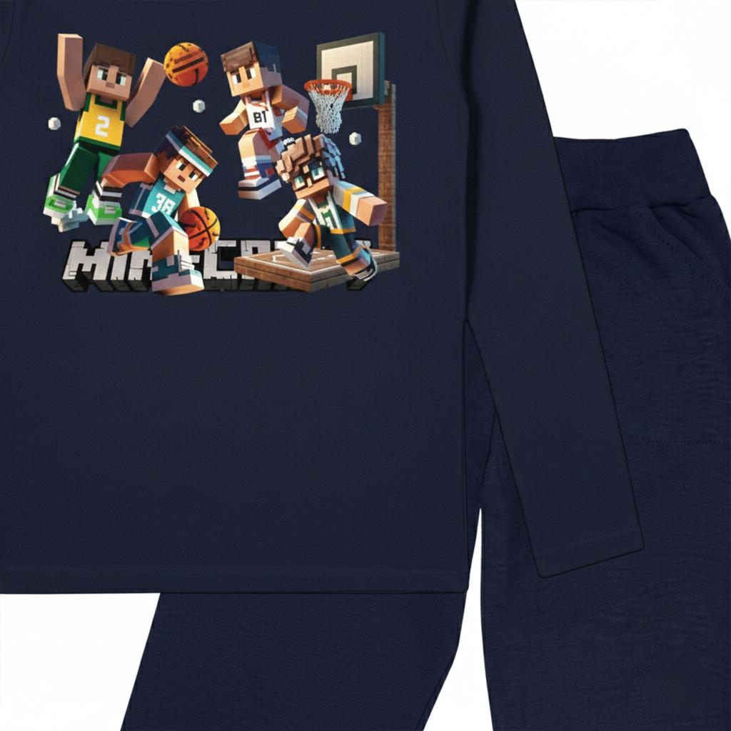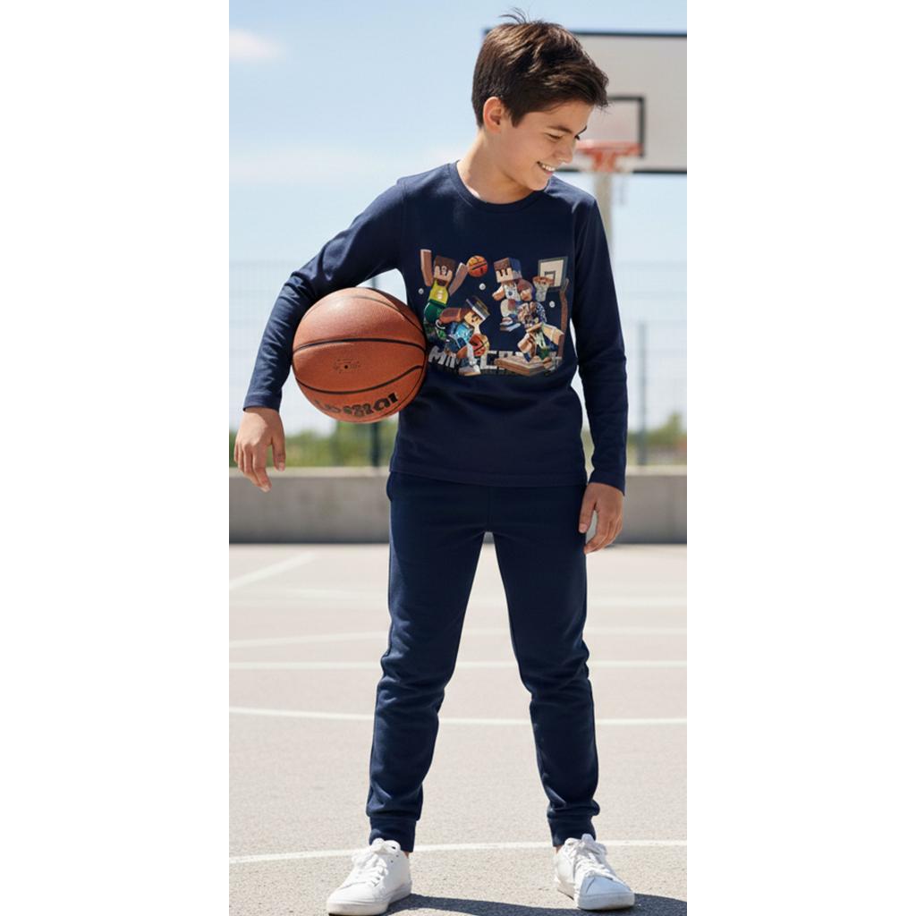 Блузата с ефектна Minecraft Basketball картинка и тъмното спортно долнище са перфектната комбинация за училище, игри навън и семейни разходки.