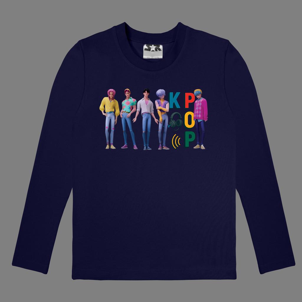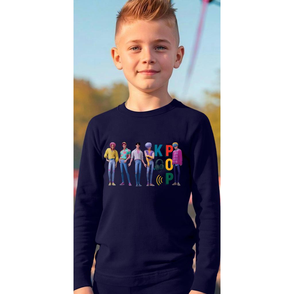 Тъмносиня блуза с дълъг ръкав и ефектна щампа на K-POP идоли — идеалният избор за деца, които искат да блестят, където и да отидат!
