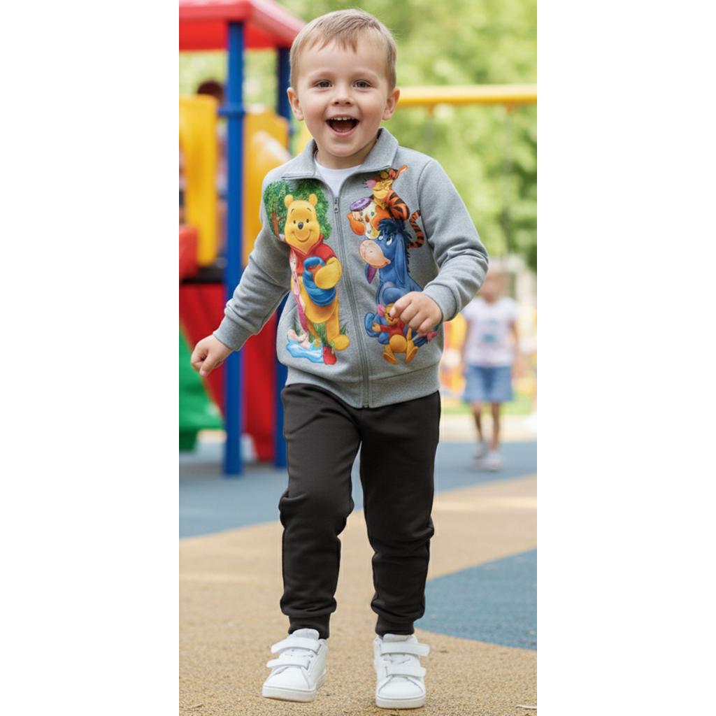 Комбинацията от мек сив суичър и практично тъмно долнище създава удобство за игра, разходки и ежедневие.