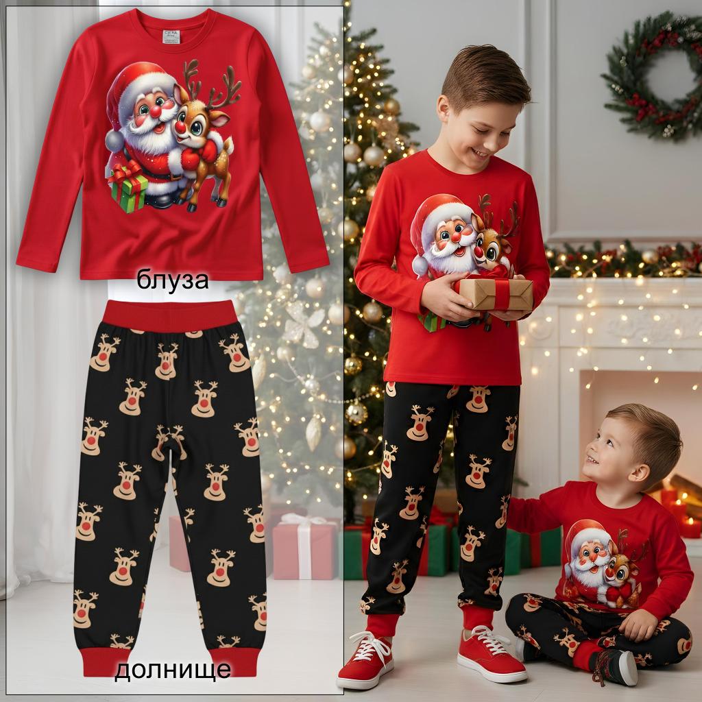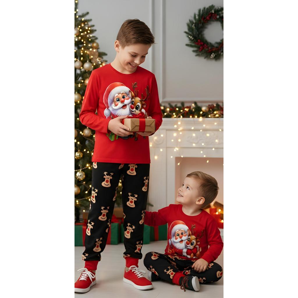 Внесете класически коледен чар и невероятен уют в гардероба на вашето дете! Този комплект е перфектната комбинация от ярки цветове и празнични мотиви – идеален за коледното утро, семейни снимки или като най-уютната пижама за празниците.