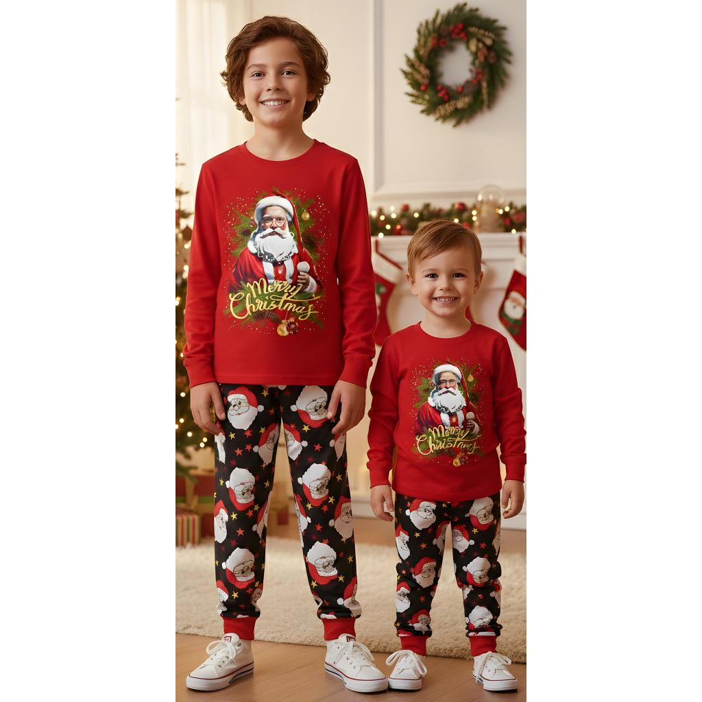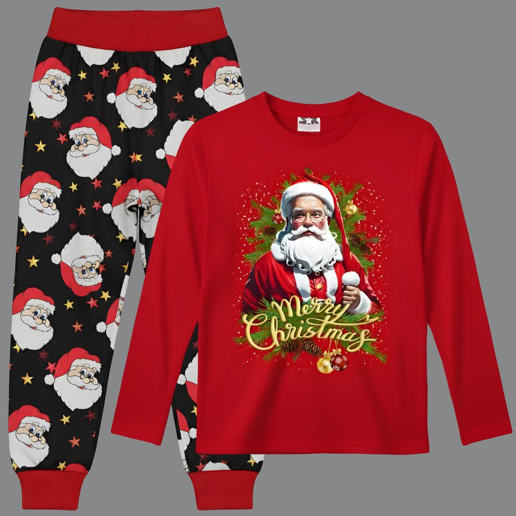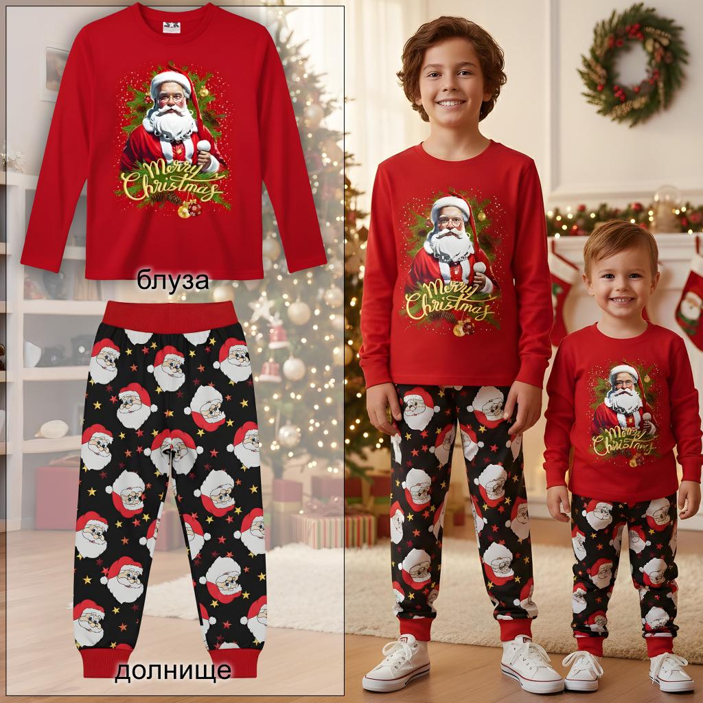 Горнище (Блуза): Дълъг ръкав в наситен червен цвят. Централният принт изобразява Дядо Коледа с очила, заобиколен от елхови клонки и коледни играчки. Под него е изписано "Merry Christmas".