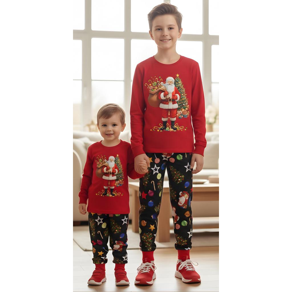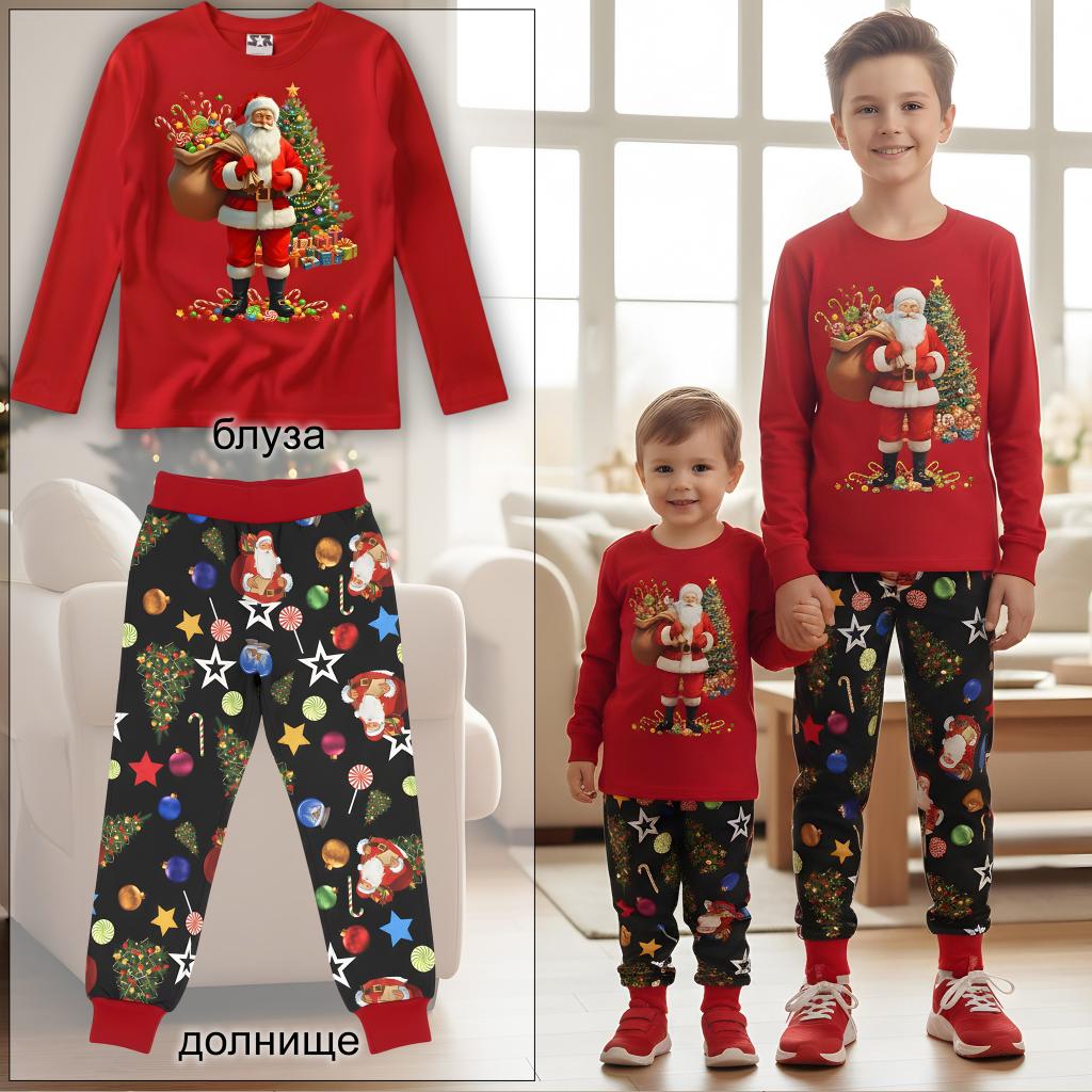 Горнище (Блуза): Дълъг ръкав в наситен червен цвят. Централният принт изобразява Дядо Коледа с очила, заобиколен от елха ,близалки ,подаръци и коледни играчки.