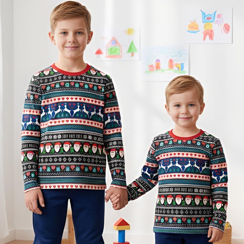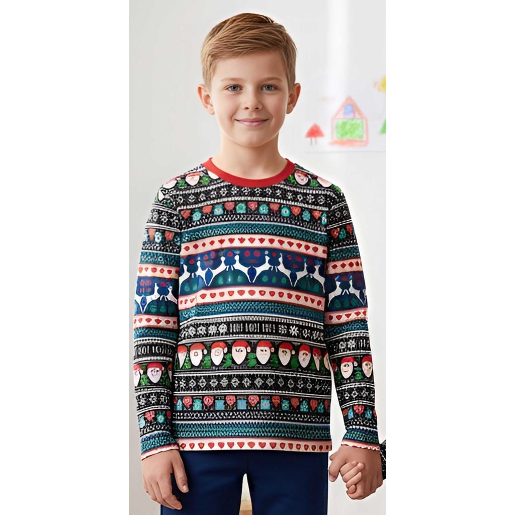 Внесете класически коледен чар и традиционен уют в зимния гардероб на вашето дете! Тази блуза с дълъг ръкав, имитираща плетена шарка, е идеална за създаване на весело настроение – перфектна за училищни тържества, семейни събирания или като стилен ежедневен акцент.