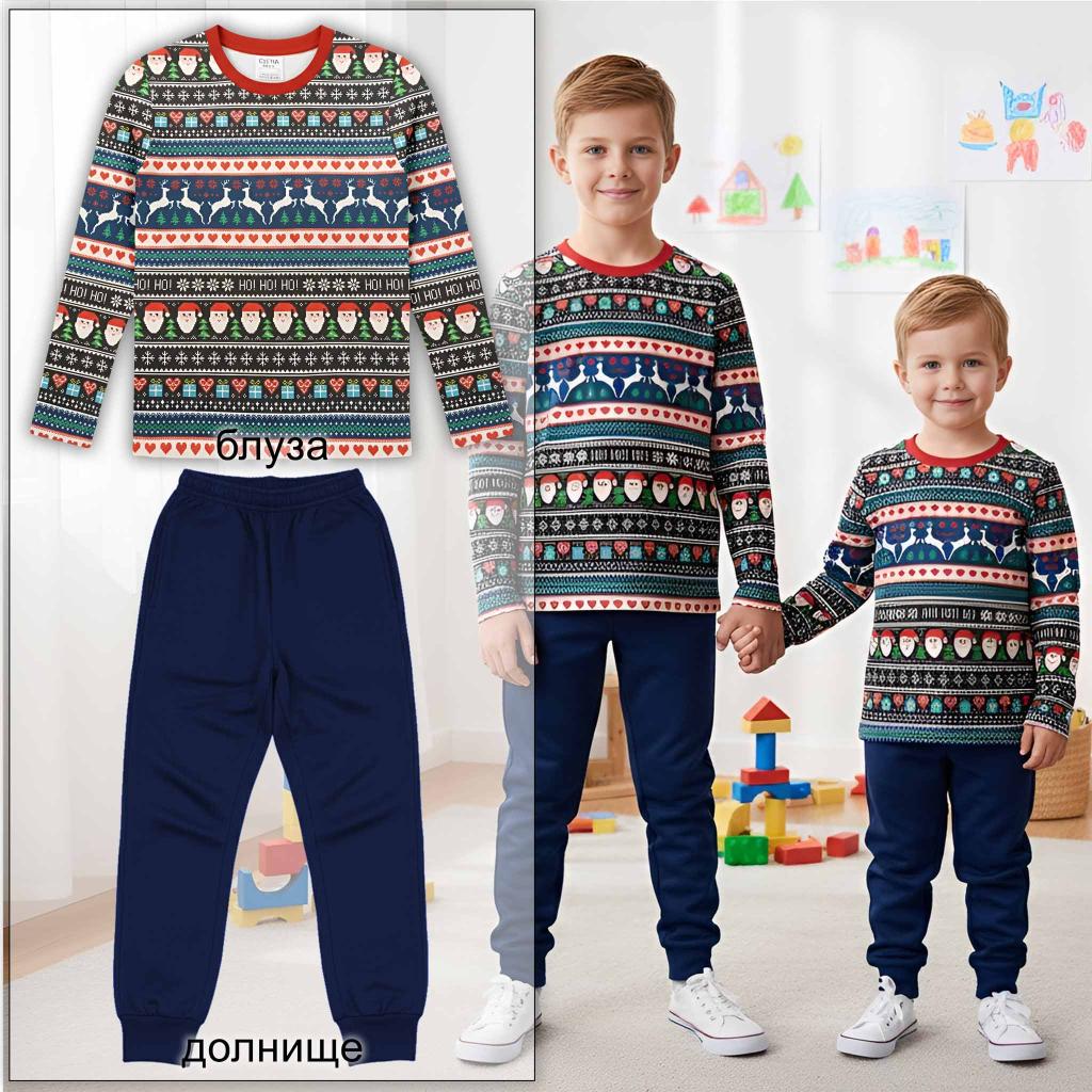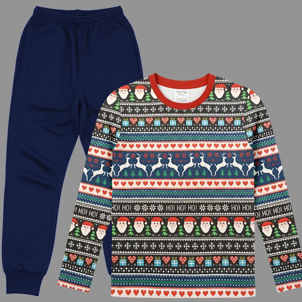 Горнище (Блуза): Дълъг ръкав с цялостен принт, имитиращ плетен коледен пуловер (Fair Isle). Дизайнът е в богата палитра от тъмно синьо, черно, червено, бяло и зелено и е организиран в хоризонтални ивици. Мотивите включват лица на Дядо Коледа, еленчета, елхички, снежинки и надпис "HO! HO! HO!". Деколтето е завършено с контрастен червен щрик.
