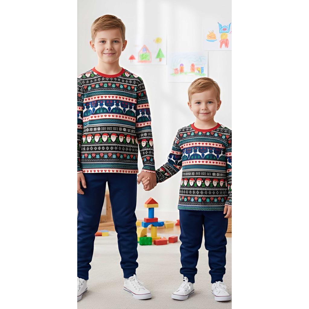 Внесете класически коледен чар и традиционен уют в зимния гардероб на вашето дете! Този комплект съчетава богатия, многоцветен десен на горнището с практично едноцветно долнище, което го прави идеален за всякакви празнични поводи или ежедневен стил.