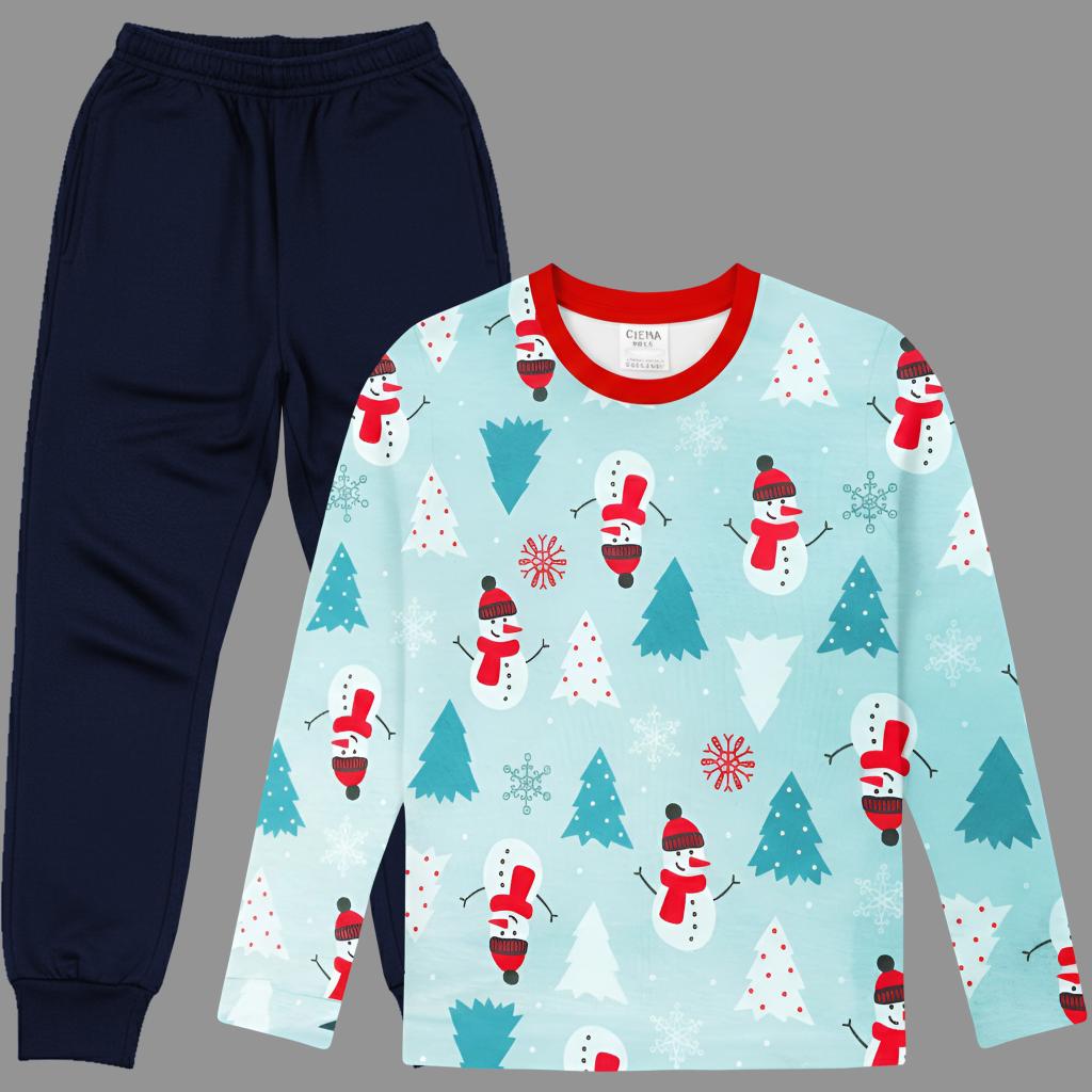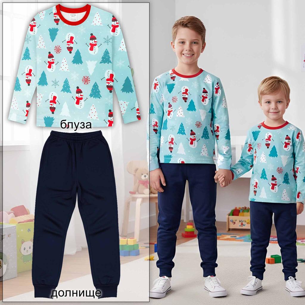 Горнище (Блуза): Дълъг ръкав с цялостен принт на светъл, пастелно син фон. Деколтето е завършено с контрастен червен кант. Принтът е весел и повтарящ се, включващ снежни човеци с червени шапки и шалове, елхички в различни нюанси на синьо и бяло, и снежинки.