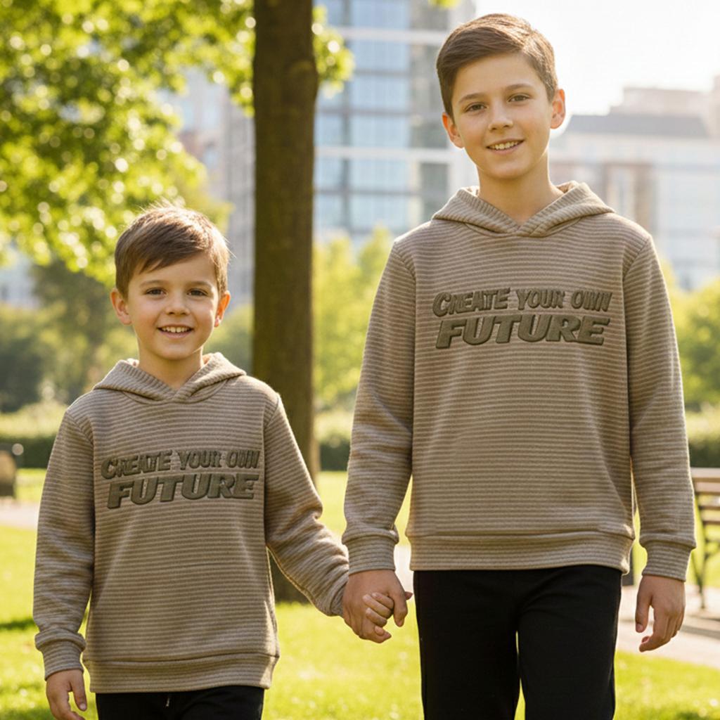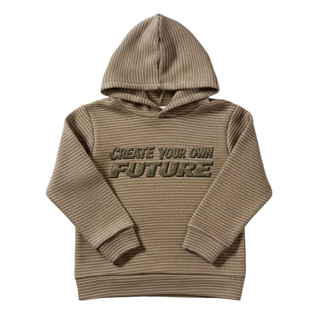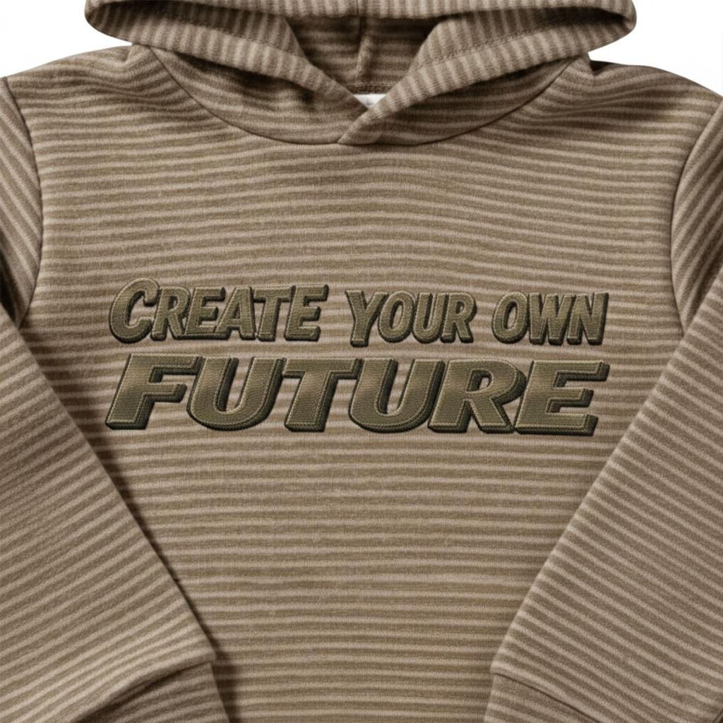 Суичърът се отличава с мека материя с фина релефна текстура (хоризонтални райета), която придава дълбочина и модерен вид на неутралния цвят каки. Акцентът е релефният (3D) принт "CREATE YOUR OWN FUTURE" в контрастен, землист нюанс, който е едновременно стилен и силно мотивиращ.