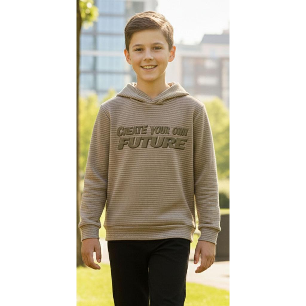Суичърът се отличава с мека материя с фина релефна текстура (хоризонтални райета), която придава дълбочина и модерен вид на неутралния цвят каки. Акцентът е релефният (3D) принт "CREATE YOUR OWN FUTURE" в контрастен, землист нюанс, който е едновременно стилен и силно мотивиращ.