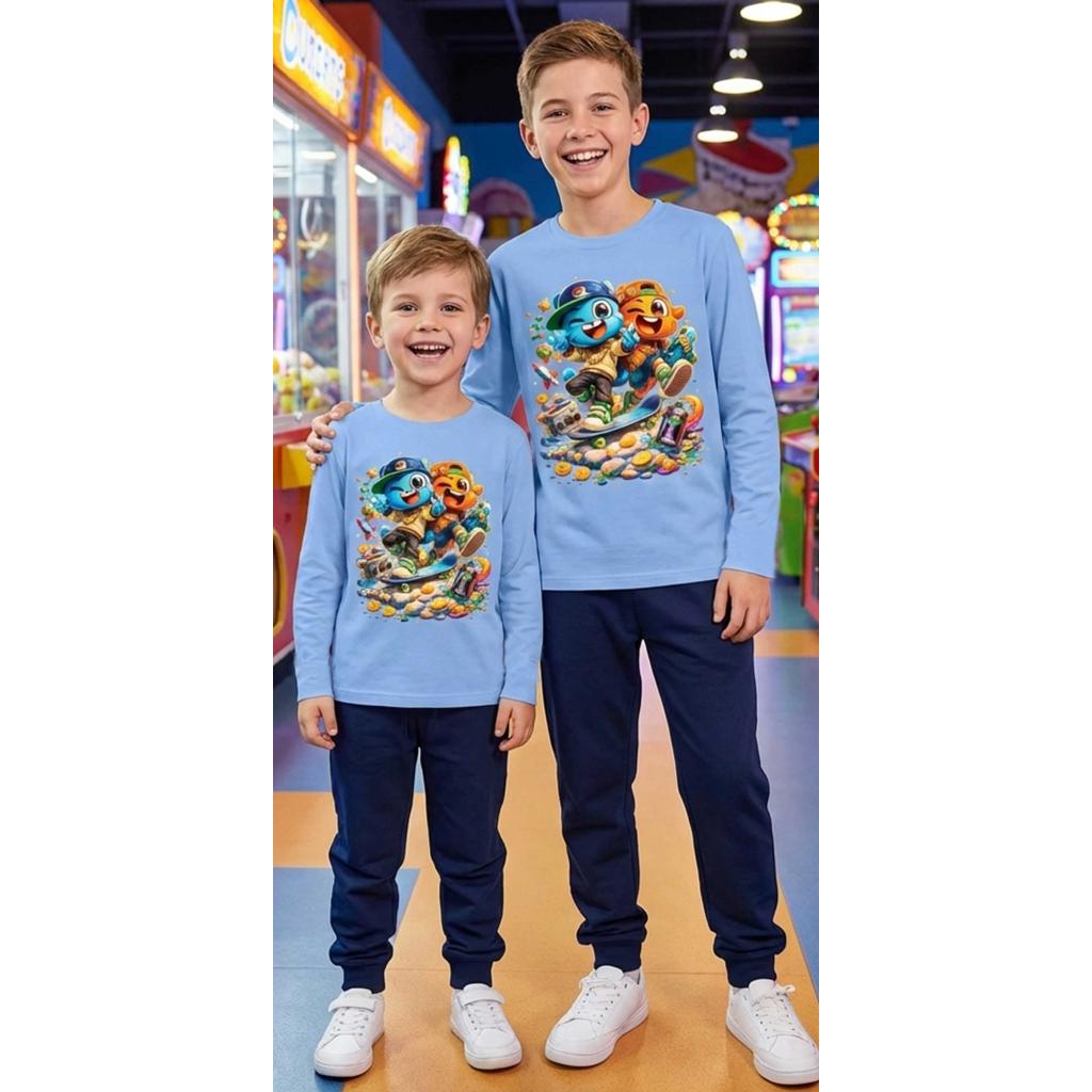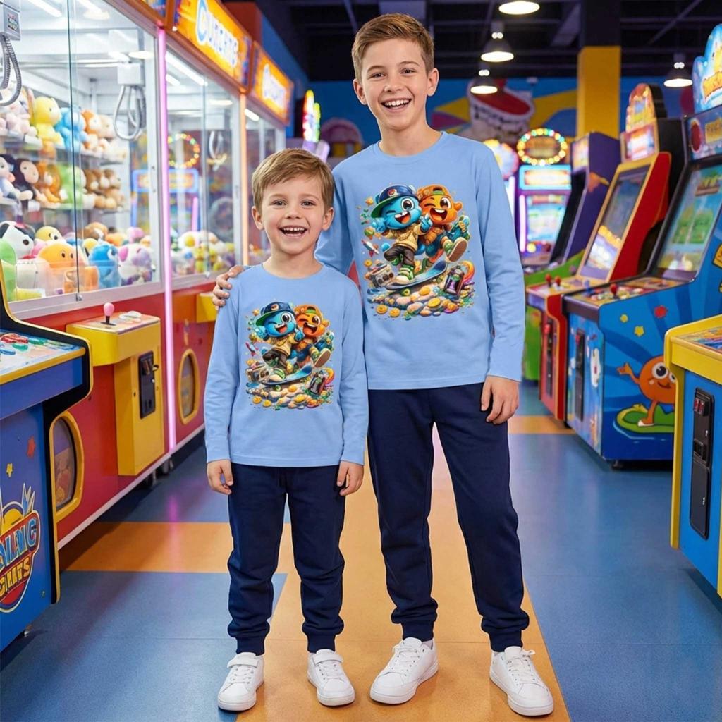 Комбинацията от блуза с цветен гейм принт и тъмно долнище създава балансиран, стилен и много удобен аутфит – идеален за училище, разходки и игри навън. 🚀