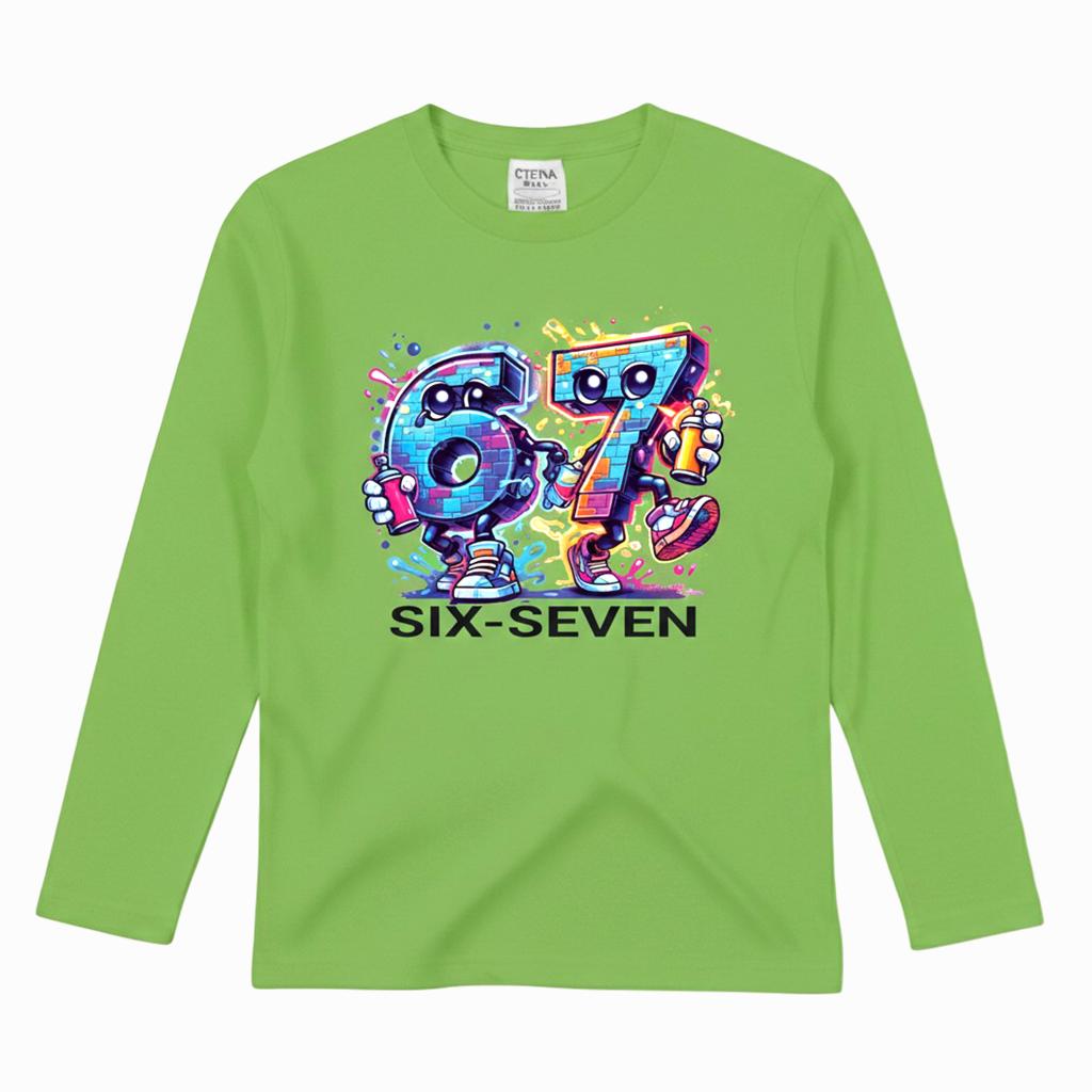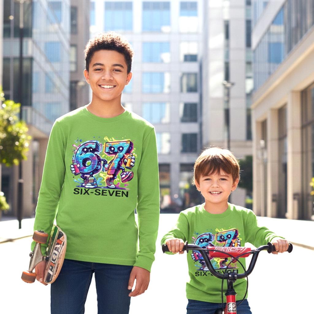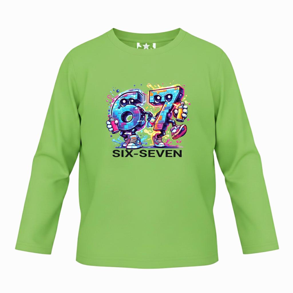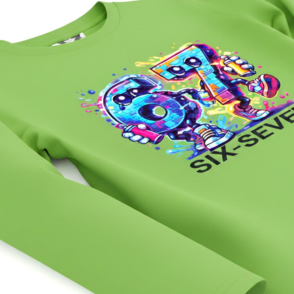 Тази тъмна детска блуза превръща всеки ден в игра на висока скорост! Двата весели герои „Six“ и „Seven“ препускат напред и заразяват с енергия, смелост и детски хъс 🚀💥