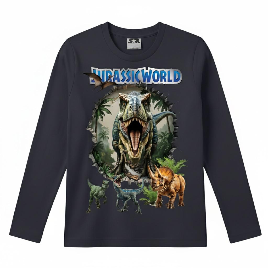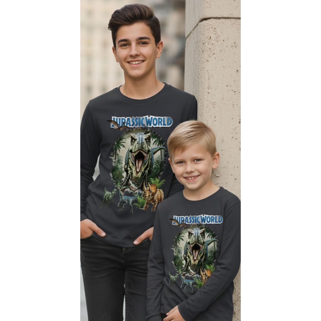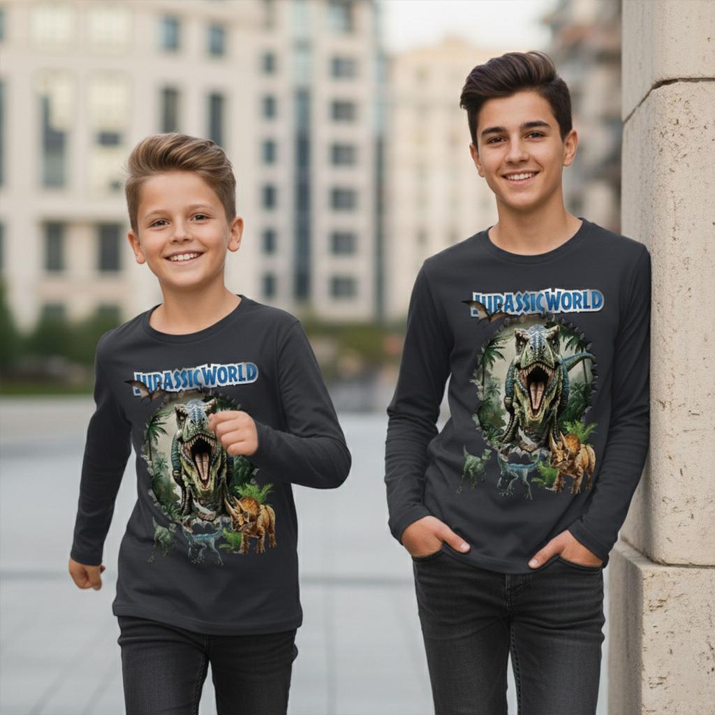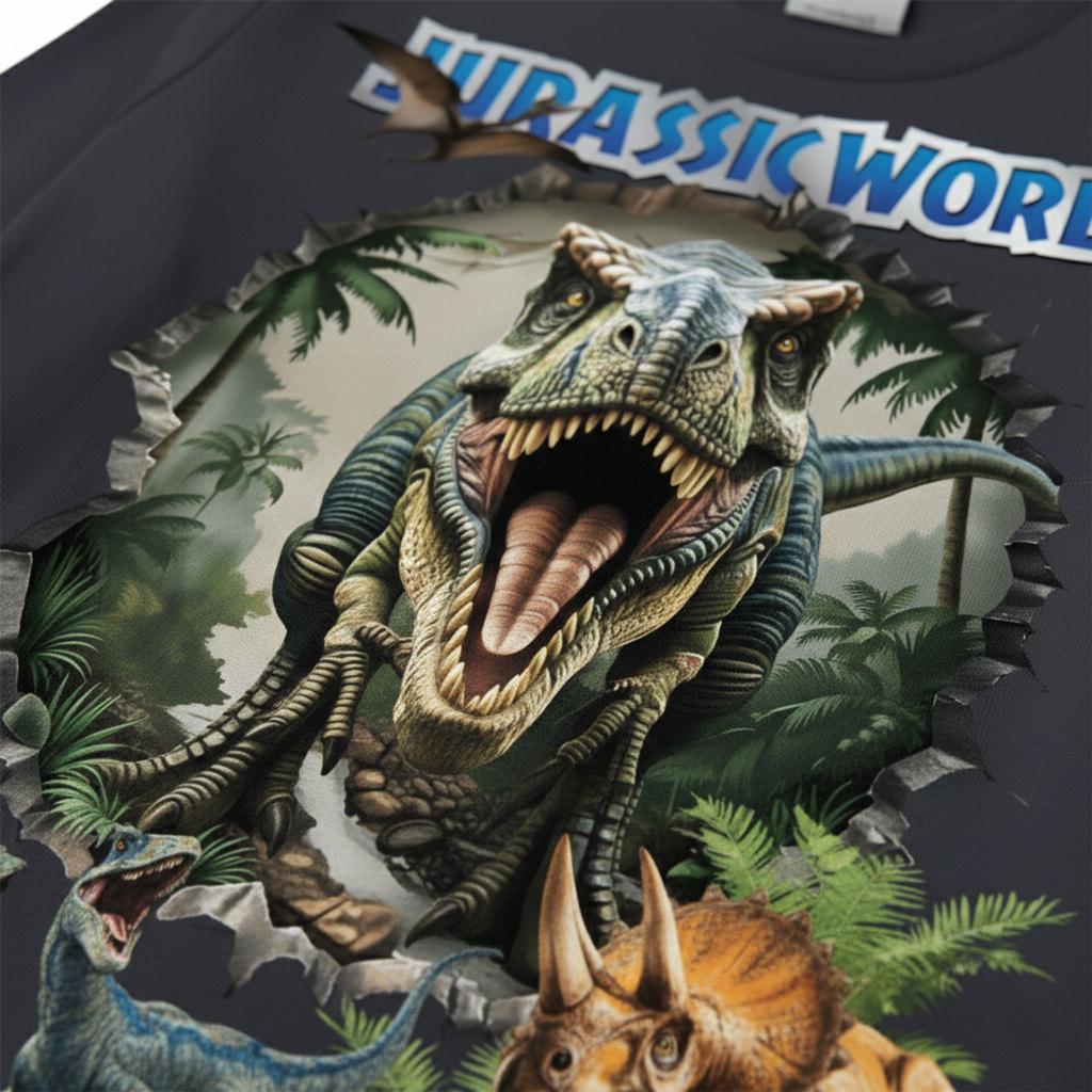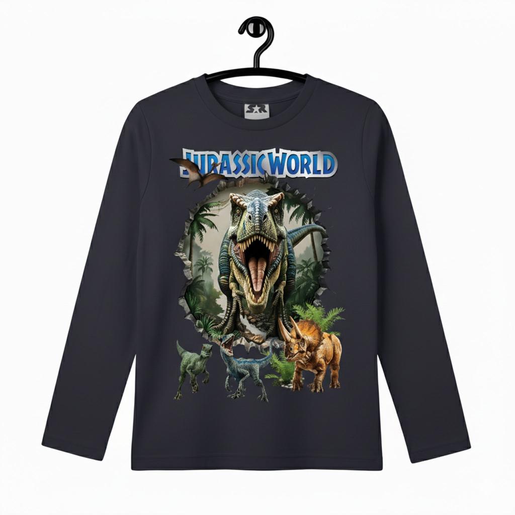 Детска блуза с дълъг ръкав в модерен антрацитен цвят, с впечатляващ DTF принт “Jurassic World”. Реалистичната визия на динозаврите създава ефект „излиза от блузата“, който моментално привлича погледите и превръща дрехата в любим избор на всяко дете.