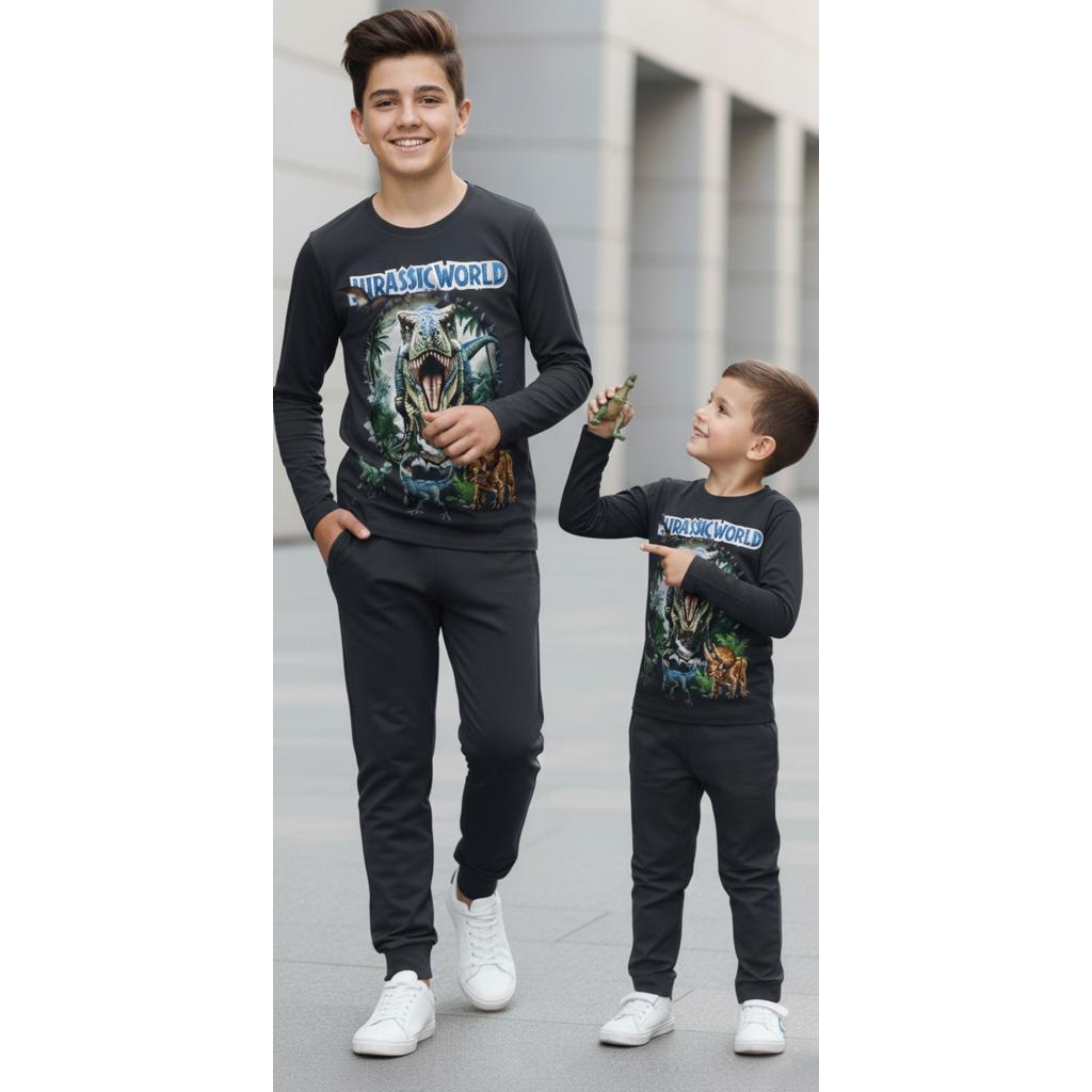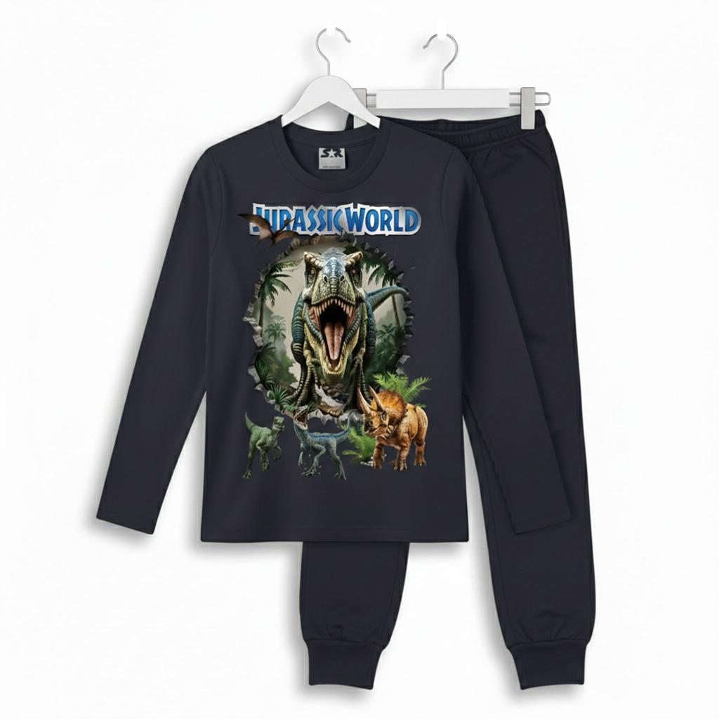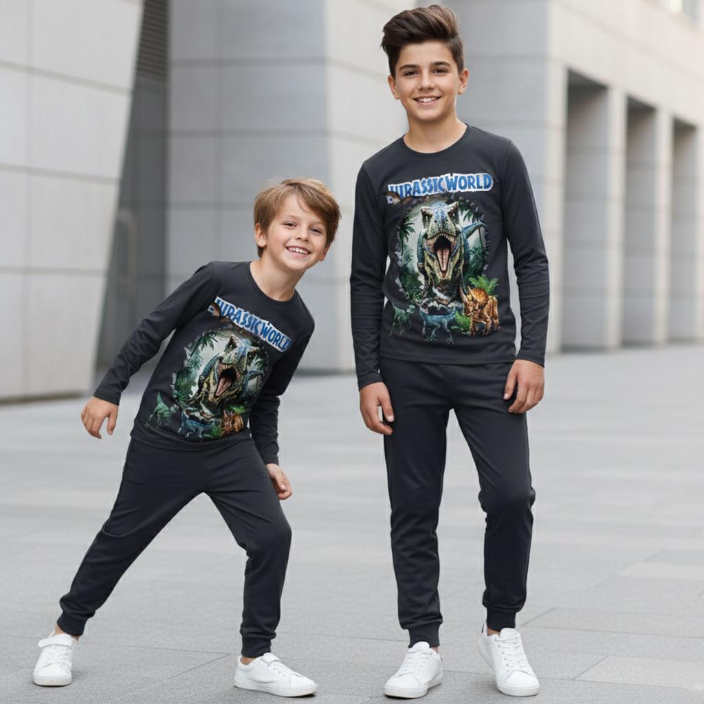 Детски комплект от блуза с дълъг ръкав и долнище в антрацитен цвят, създаден за момчета, които обичат действието, динозаврите и удобството. Впечатляващият DTF принт “Jurassic World” с реалистични динозаври прави визията силна, модерна и супер атрактивна.
