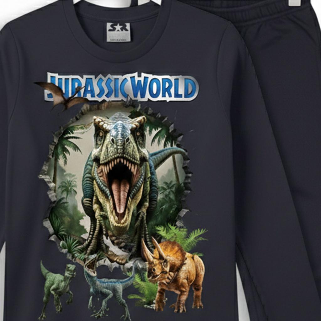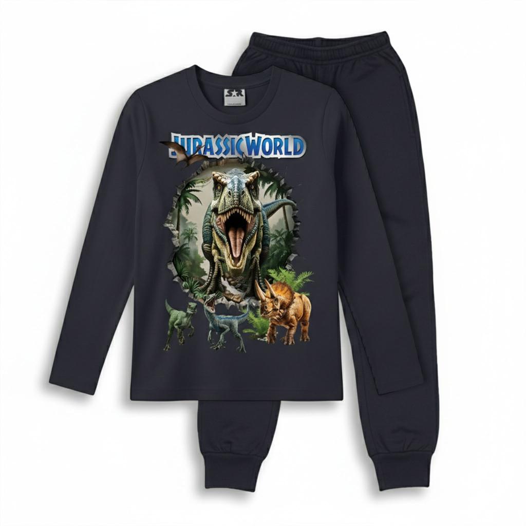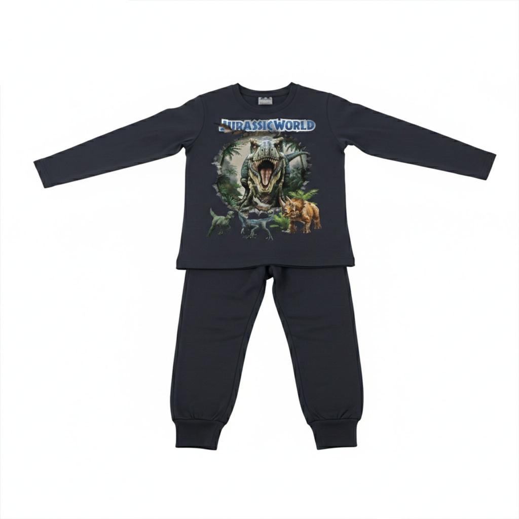 Детски комплект от блуза с дълъг ръкав и долнище в антрацитен цвят, създаден за момчета, които обичат действието, динозаврите и удобството. Впечатляващият DTF принт “Jurassic World” с реалистични динозаври прави визията силна, модерна и супер атрактивна.