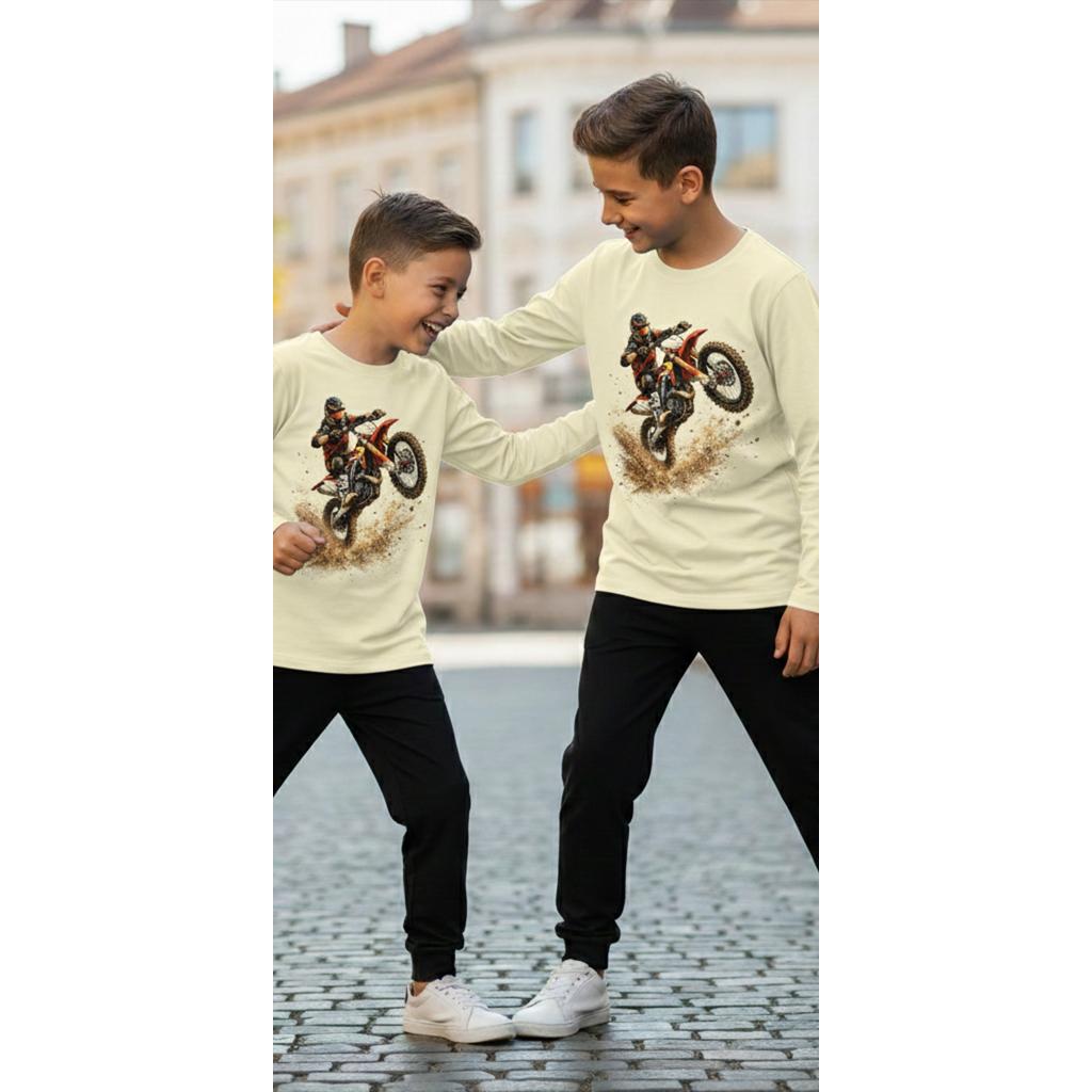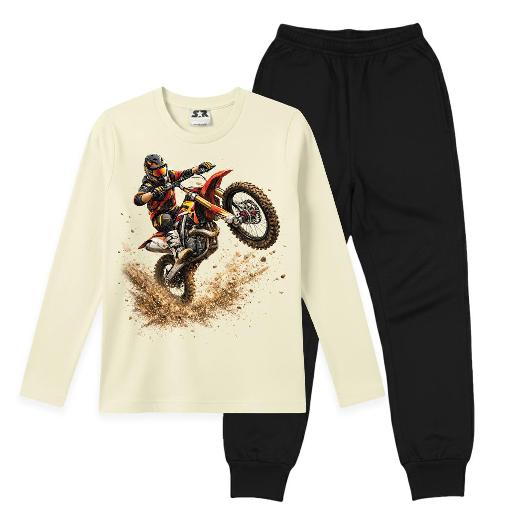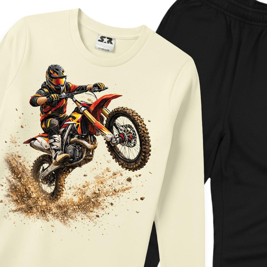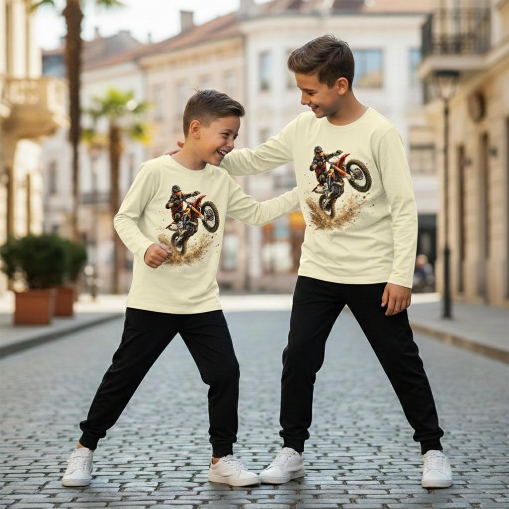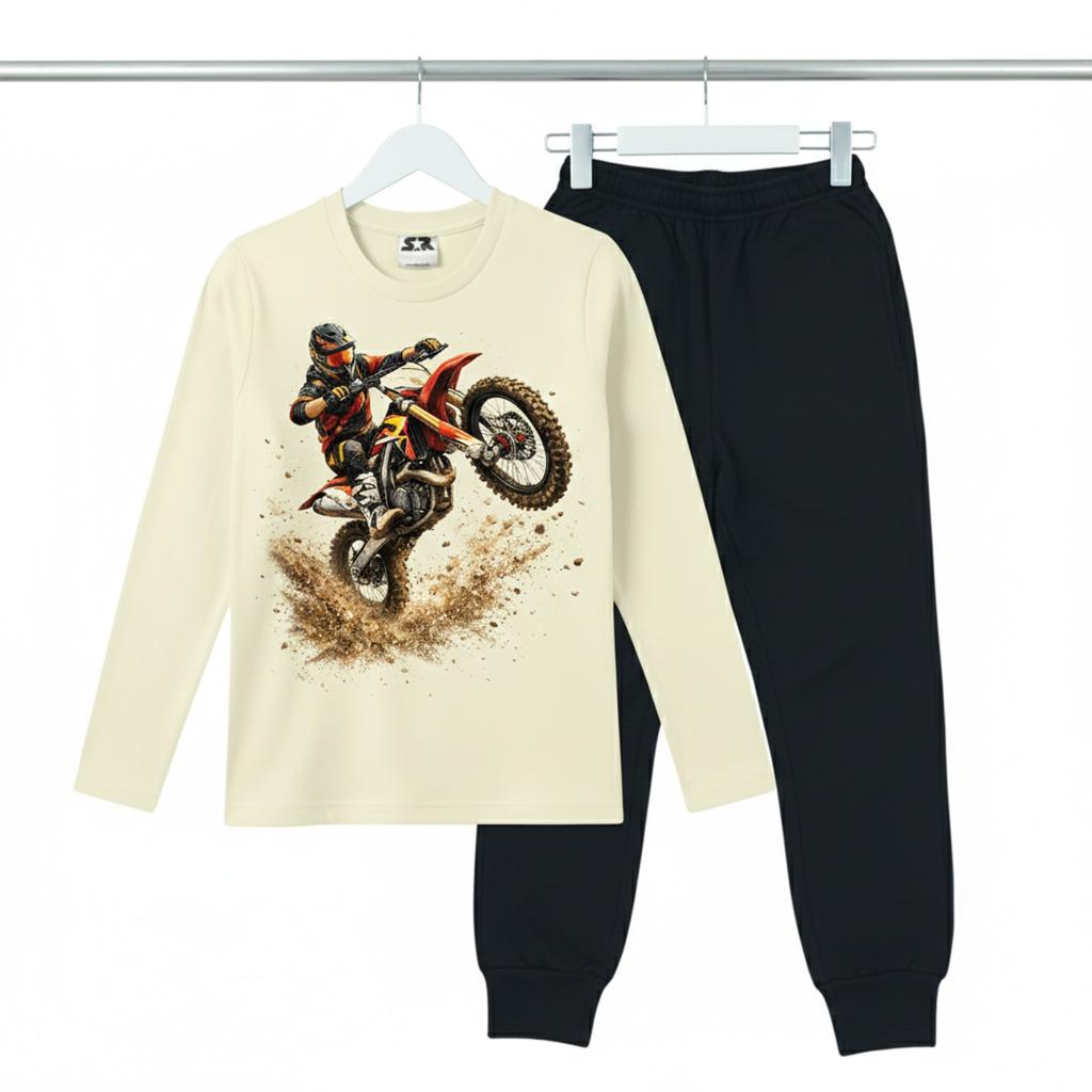 Този детски комплект съчетава ефектна блуза с мотоциклетен DTF принт и тънко, удобно долнище, създадено за активни игри, училище и ежедневни приключения.