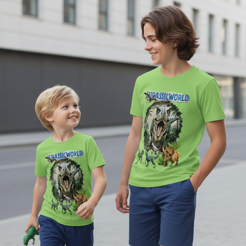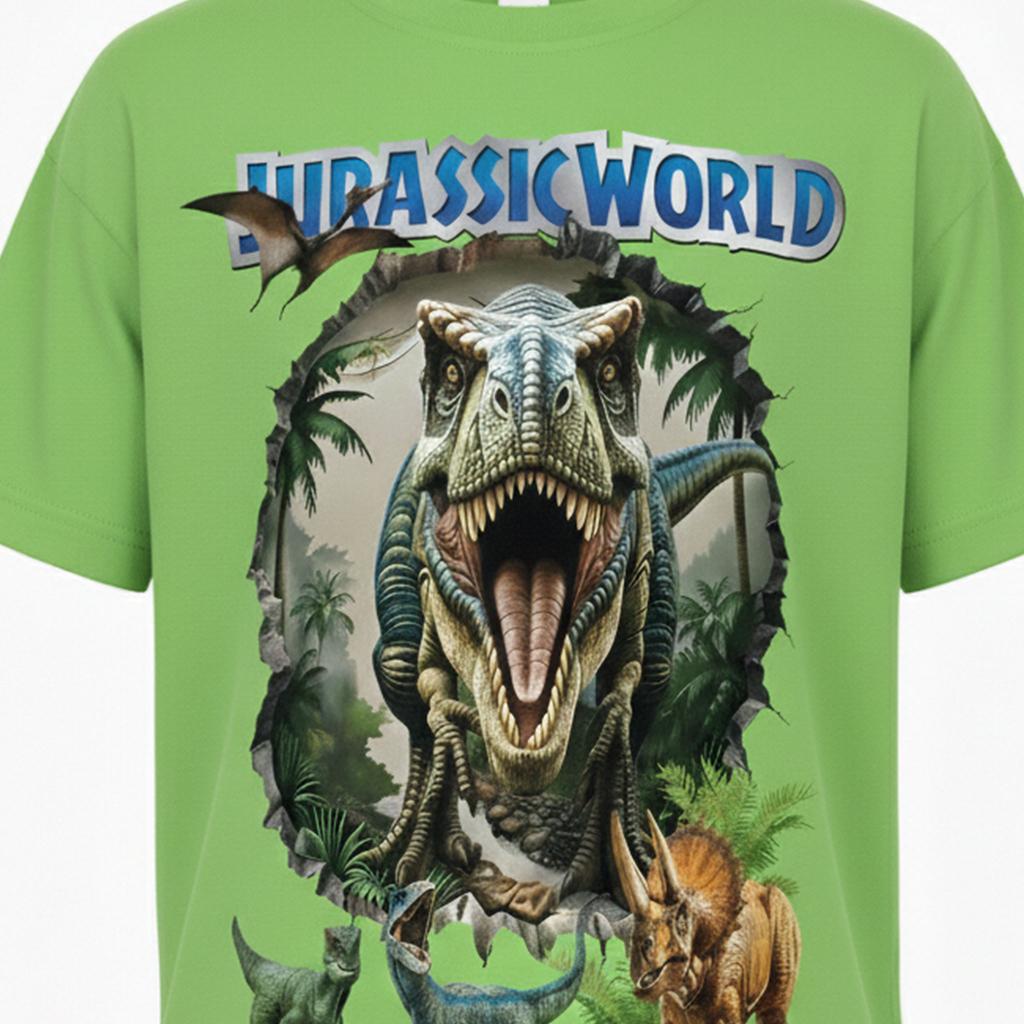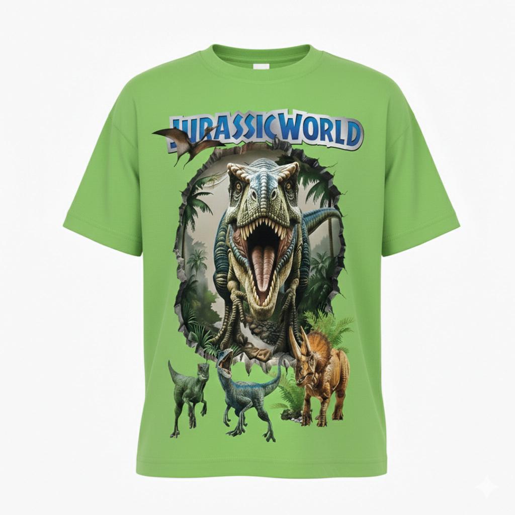 Тази детска тениска в свеж зелен цвят впечатлява с ефектен DTF принт Jurassic World, в който страховитият динозавър буквално „излиза“ от дизайна! Перфектна за деца, които обичат приключения, фантазия и екшън.