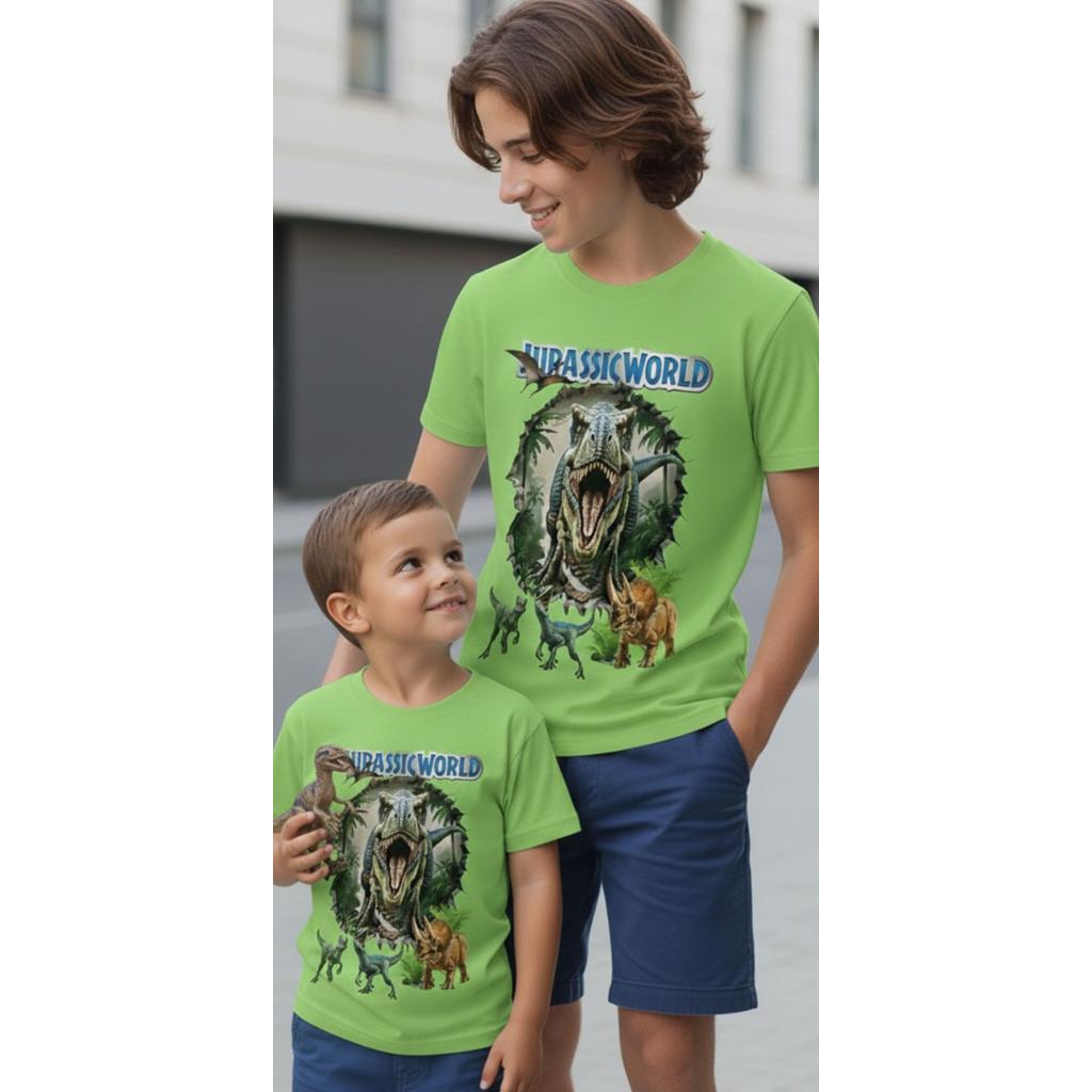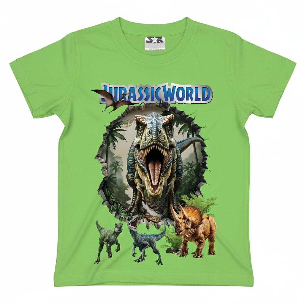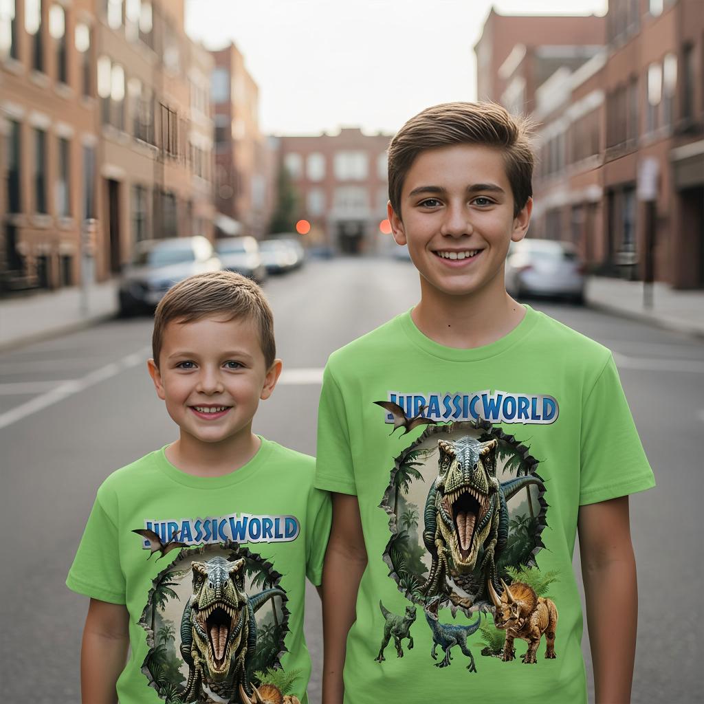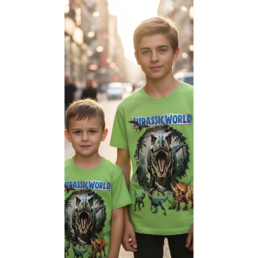 Тази детска тениска в свеж зелен цвят впечатлява с ефектен DTF принт Jurassic World, в който страховитият динозавър буквално „излиза“ от дизайна! Перфектна за деца, които обичат приключения, фантазия и екшън.