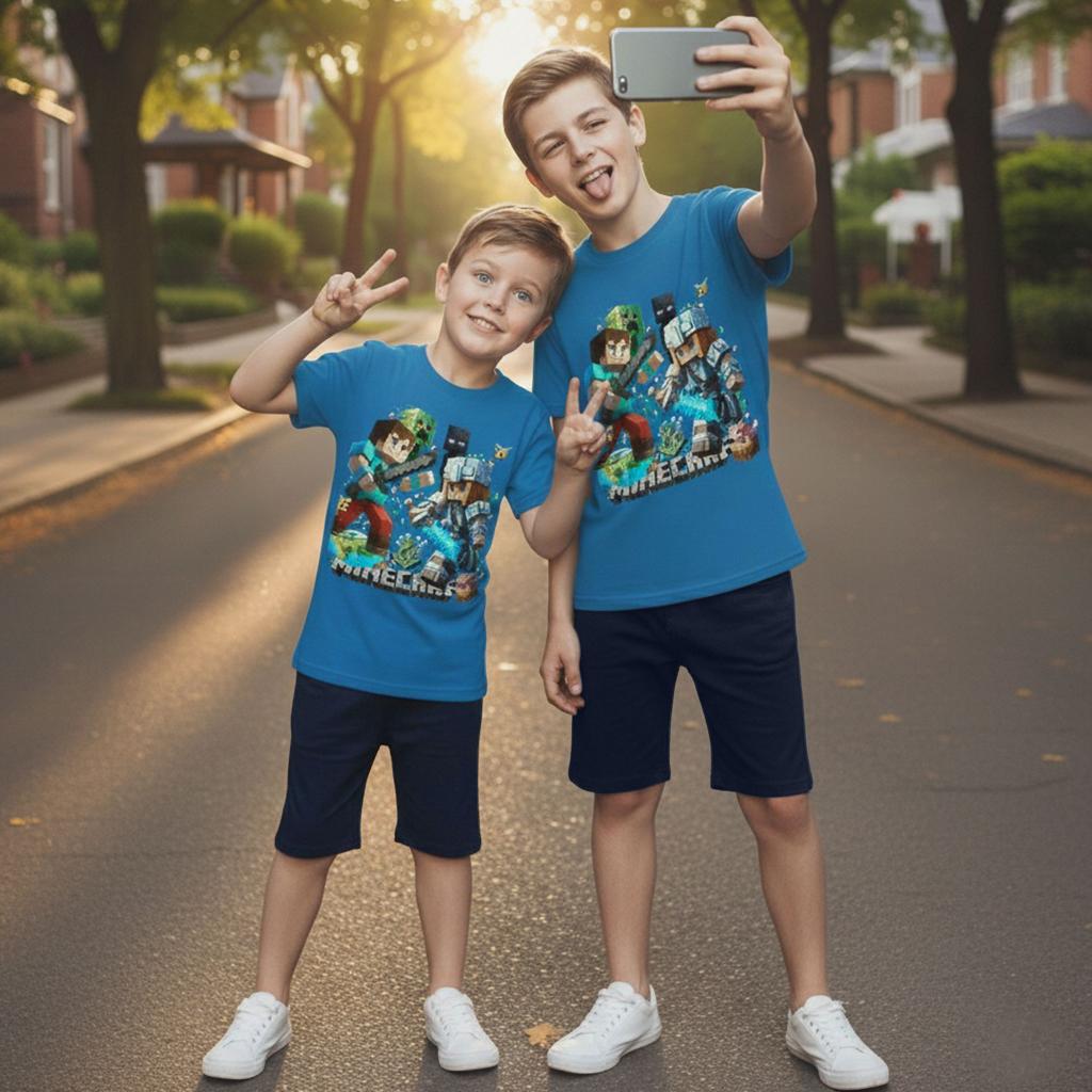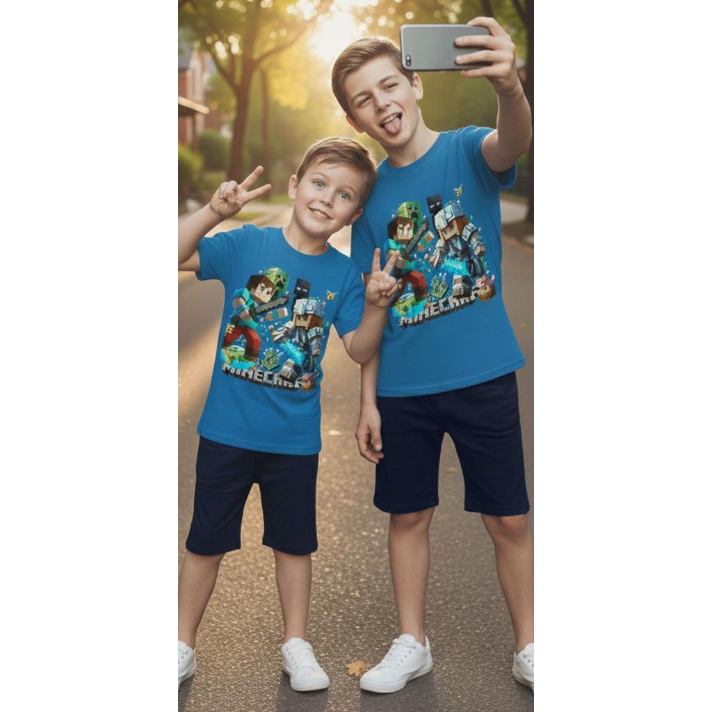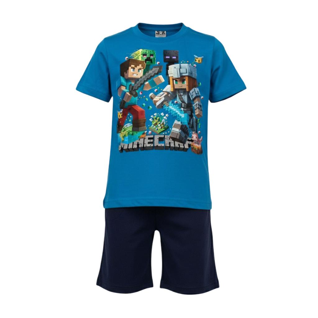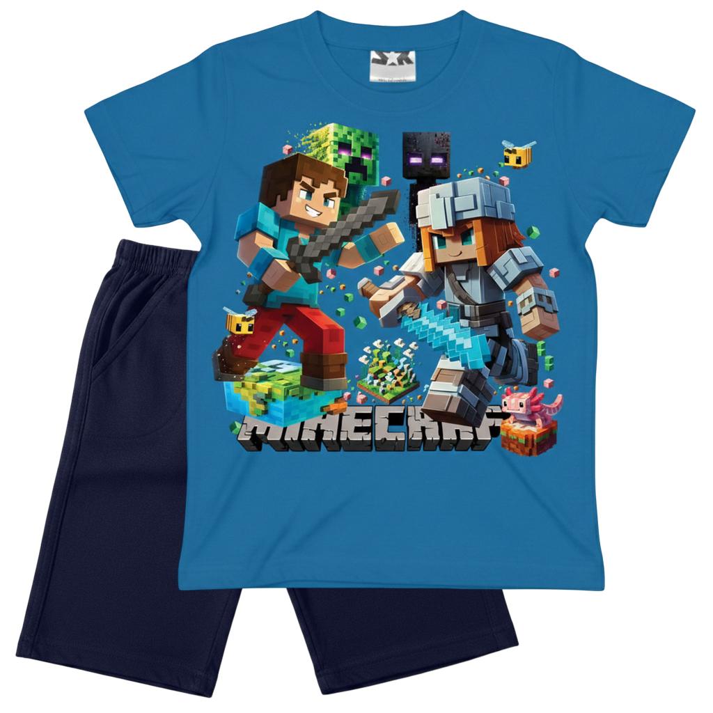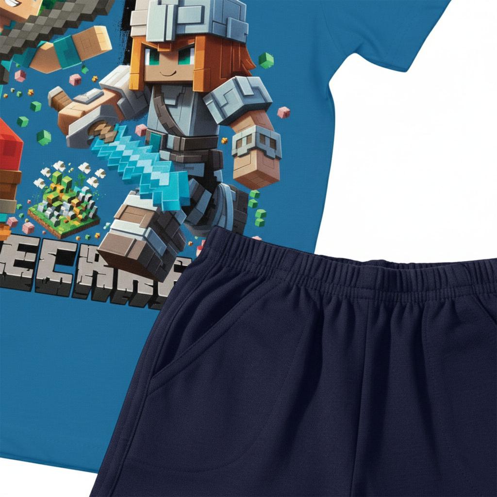 Енергия, приключение и пълен комфорт в един летен комплект! Синята тениска с впечатляващ принт Minecraft се комбинира перфектно с тъмни бермуди за модерна и практична визия, подходяща за активните дни на всяко дете.