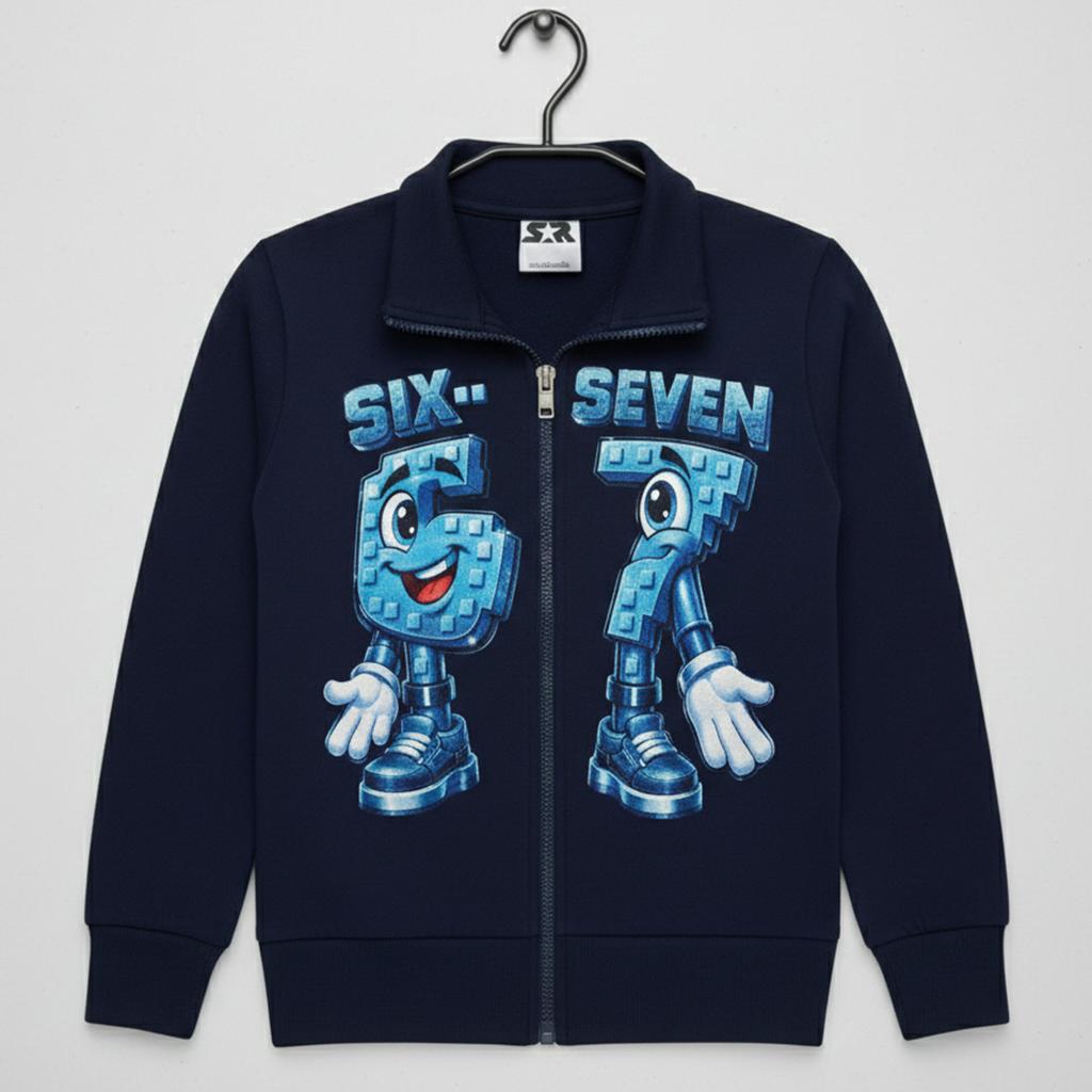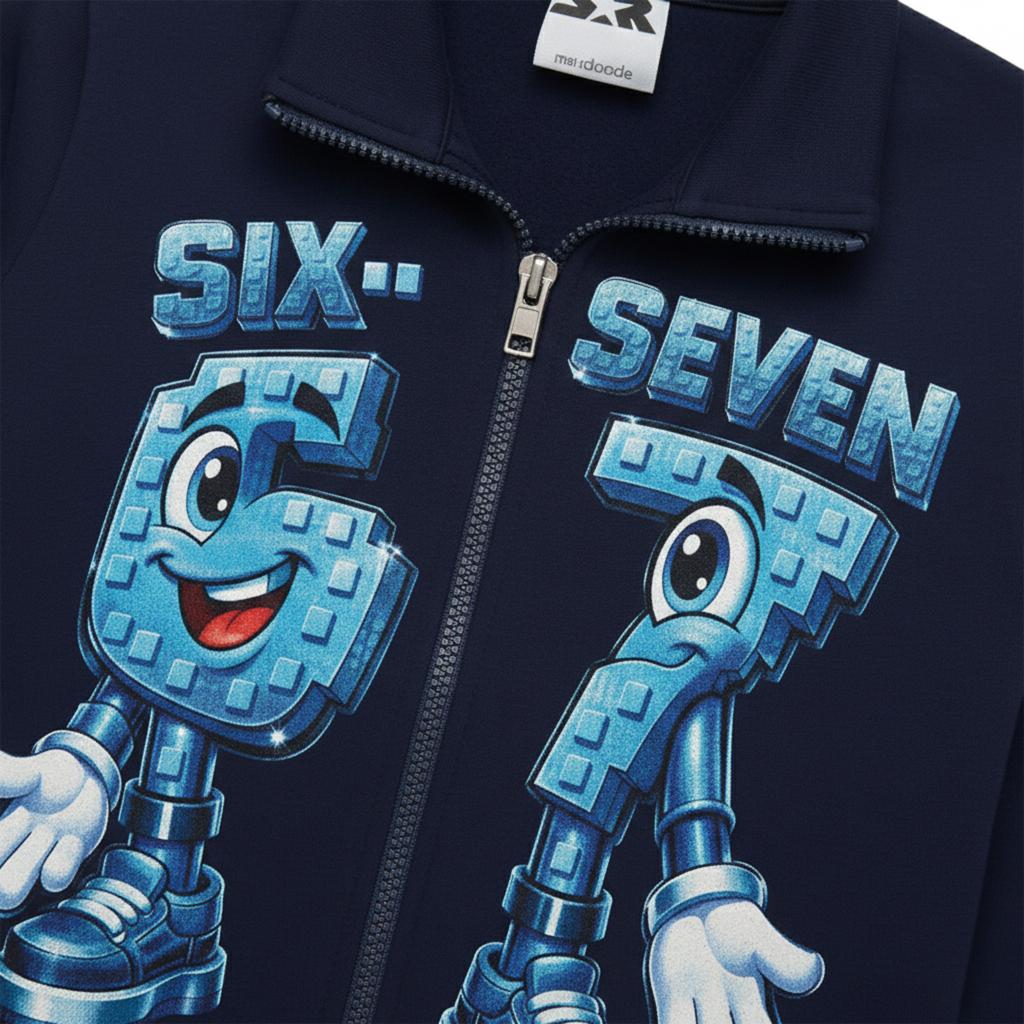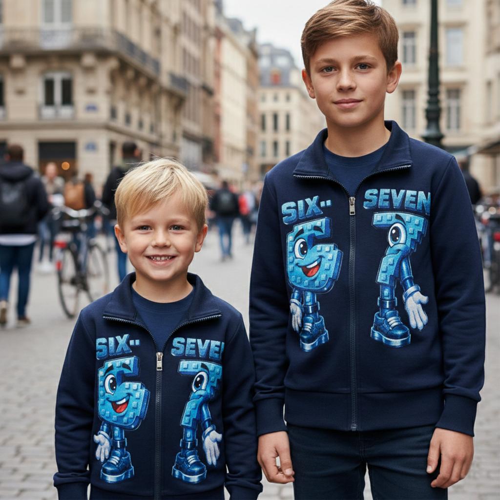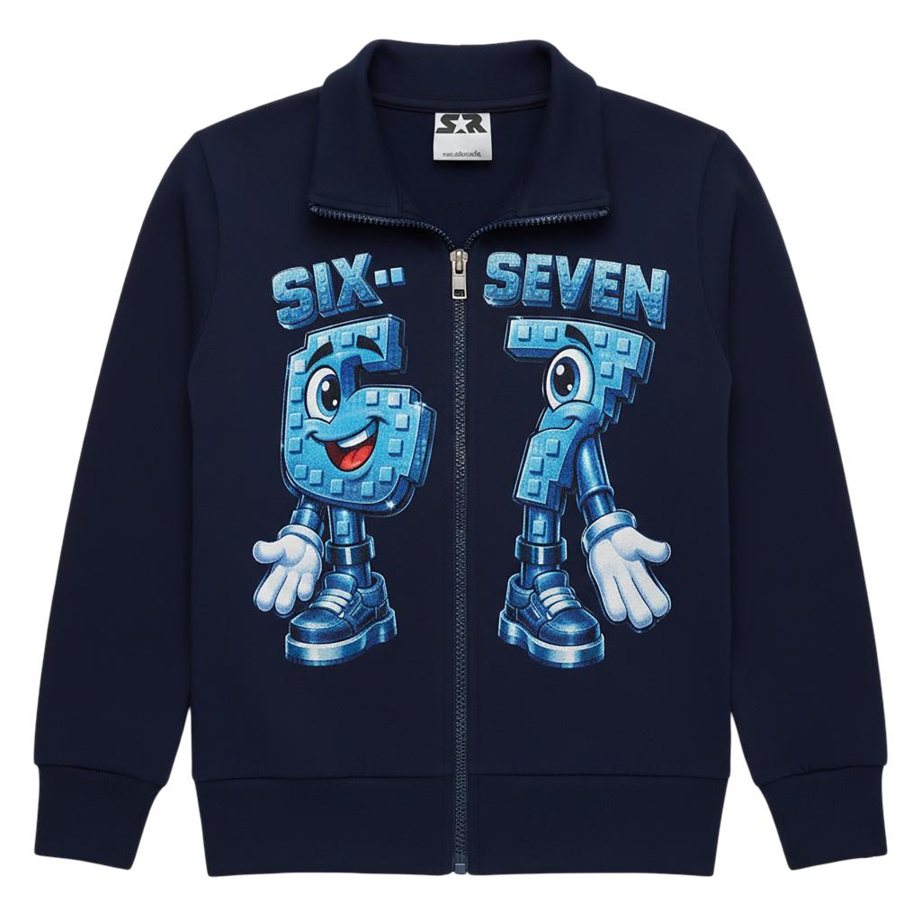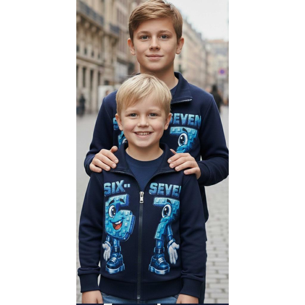 Модерен, удобен и атрактивен – този детски суичър в тъмносин цвят впечатлява с ефектен принт „Six & Seven“ в забавен анимационен стил. Ярките сини детайли изпъкват върху наситената основа и създават свежа и запомняща се визия.