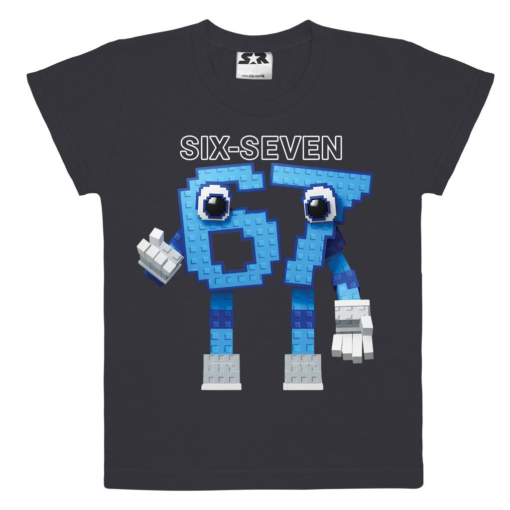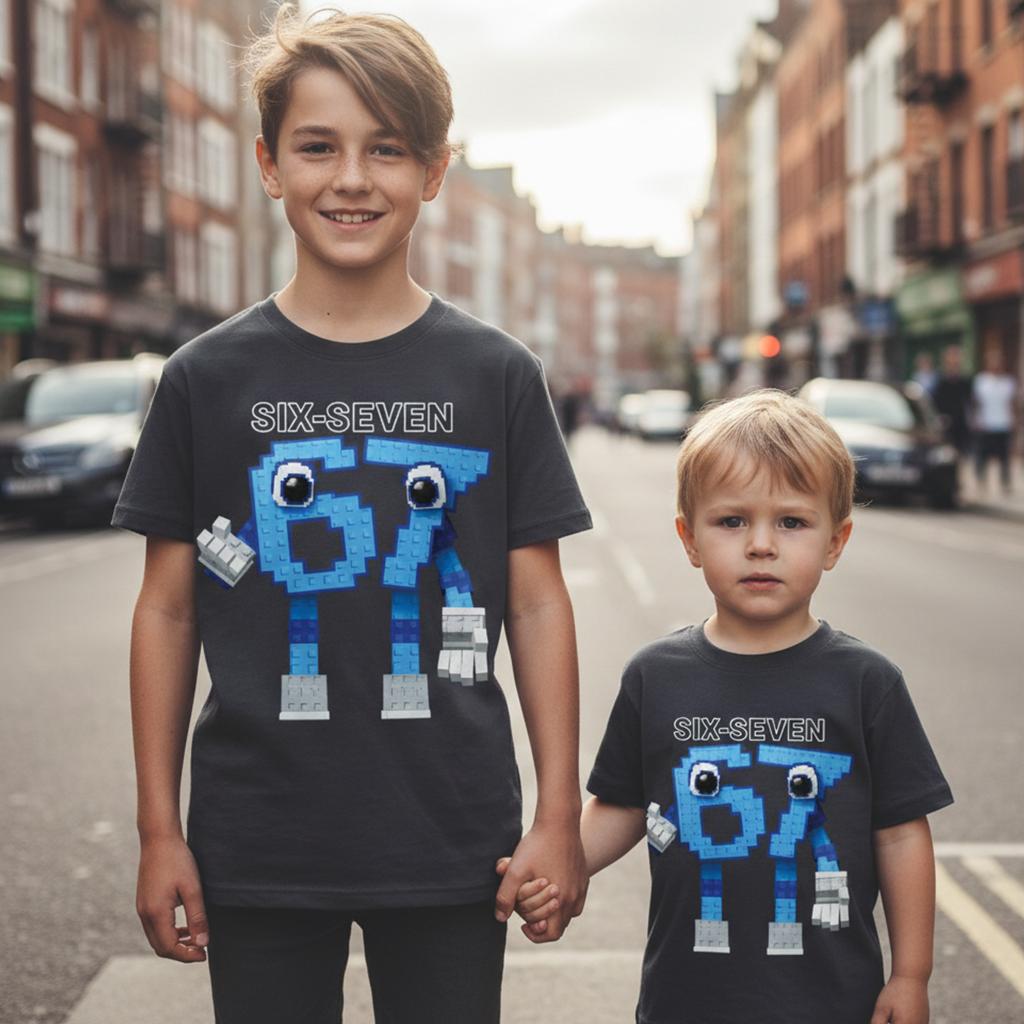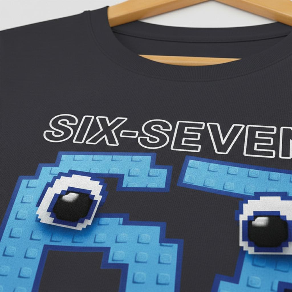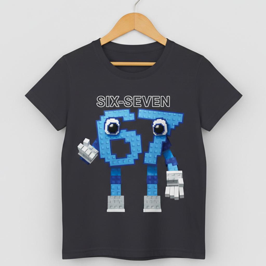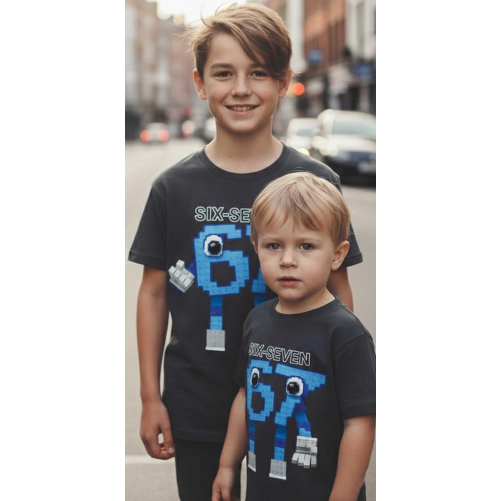 Стилна и модерна детска тениска в тъмносин цвят с атрактивен принт „Six-Seven“. Дизайнът с обемни цифри 6 и 7 в свеж син нюанс придава игрив и разпознаваем характер, който веднага привлича вниманието.