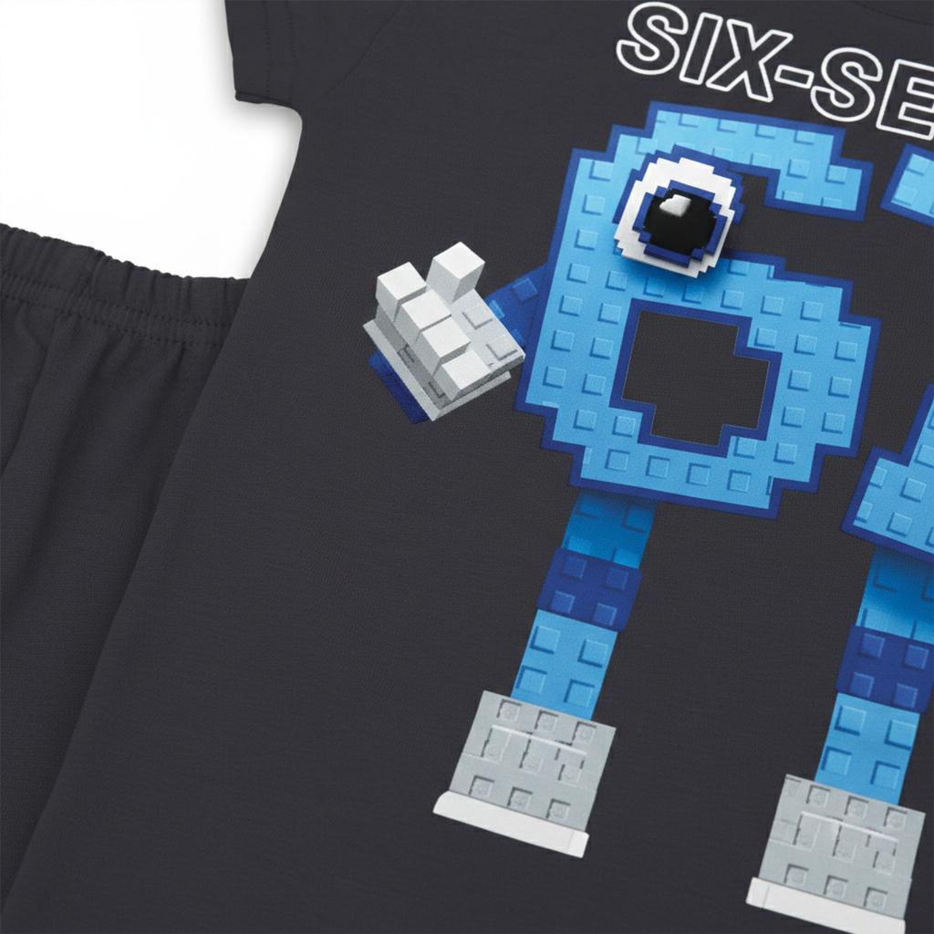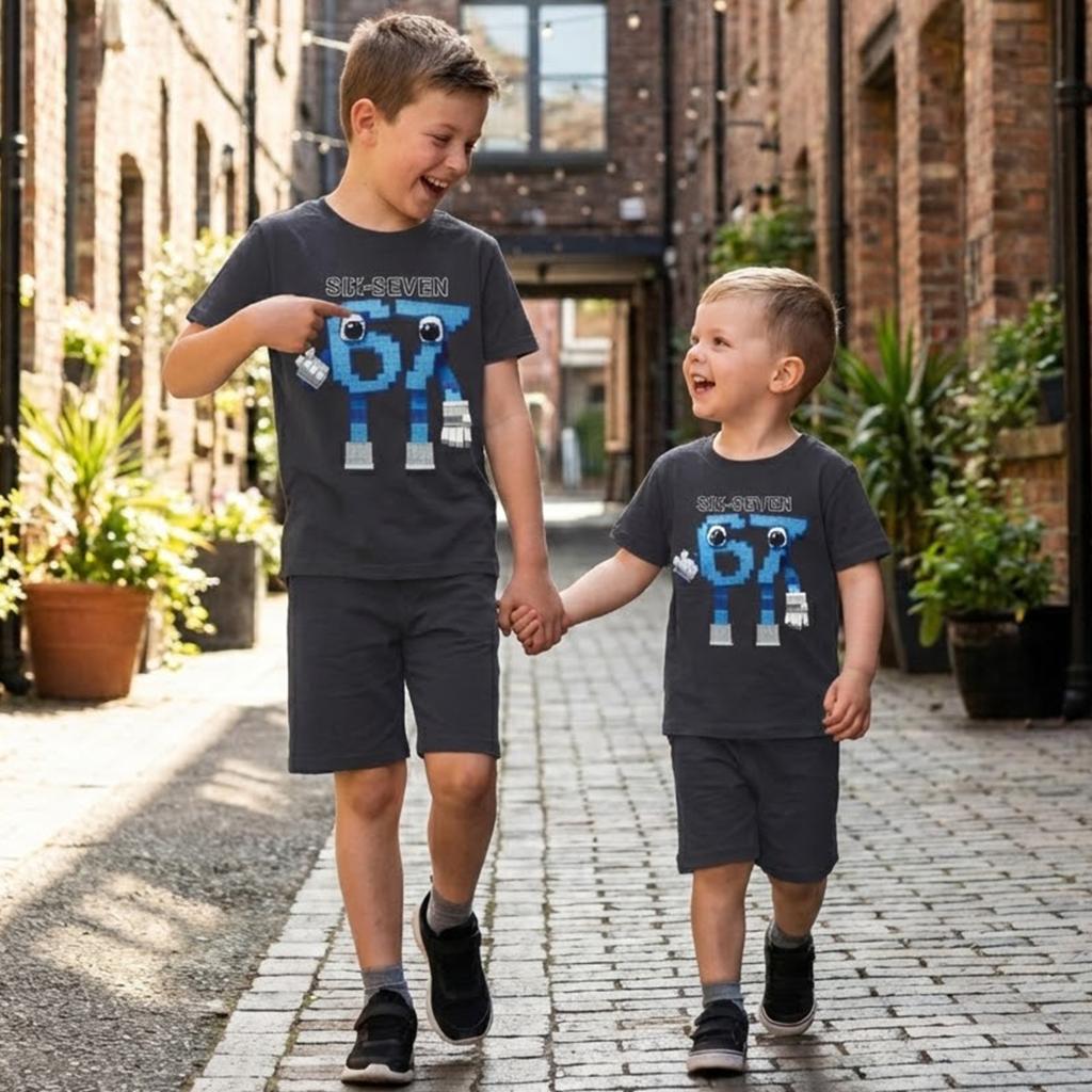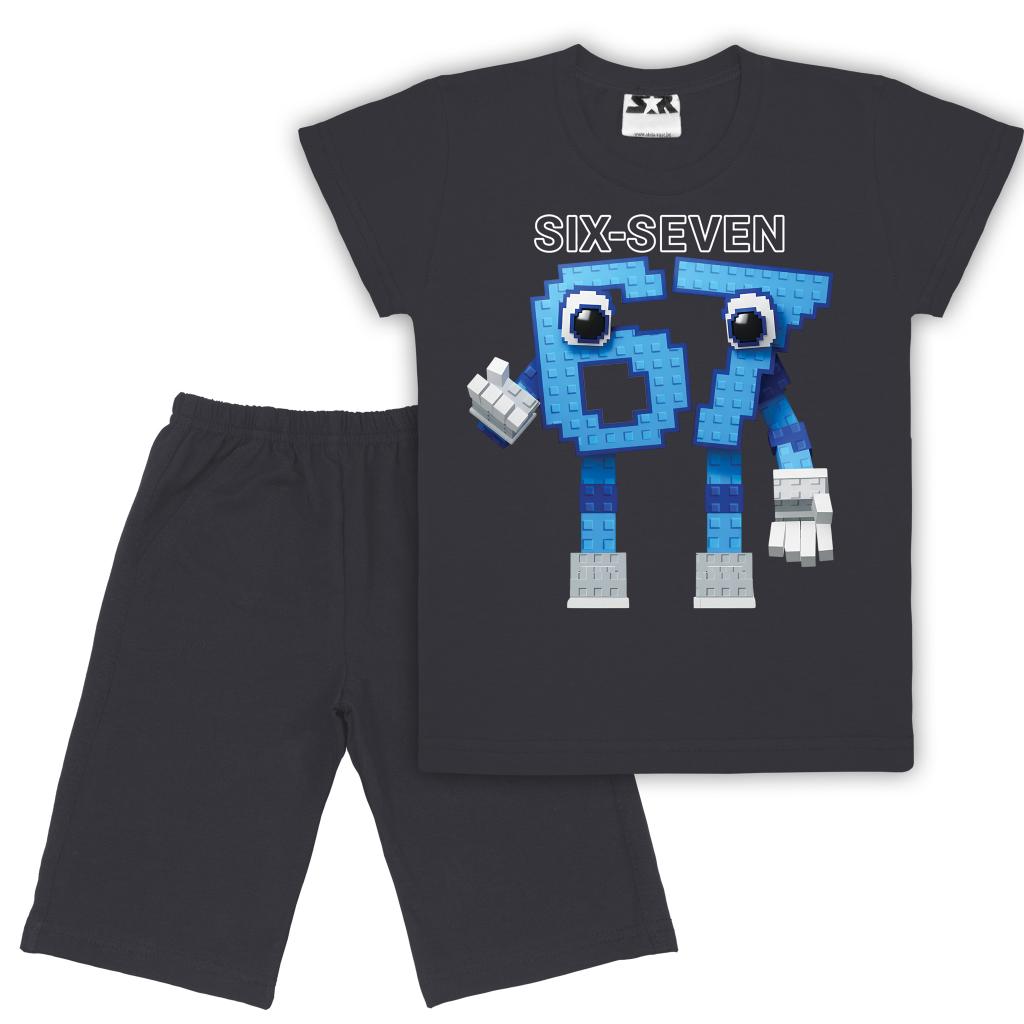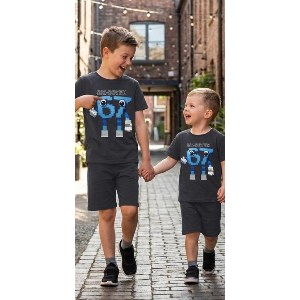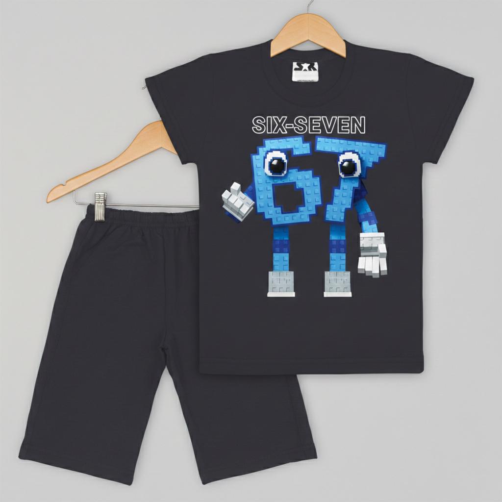 Стилен летен комплект в наситен цвят с атрактивен принт „Six-Seven“. Свежият дизайн с обемни цифри 6 и 7 в син нюанс придава модерна и игрива визия, която децата харесват, а родителите избират заради удобството.