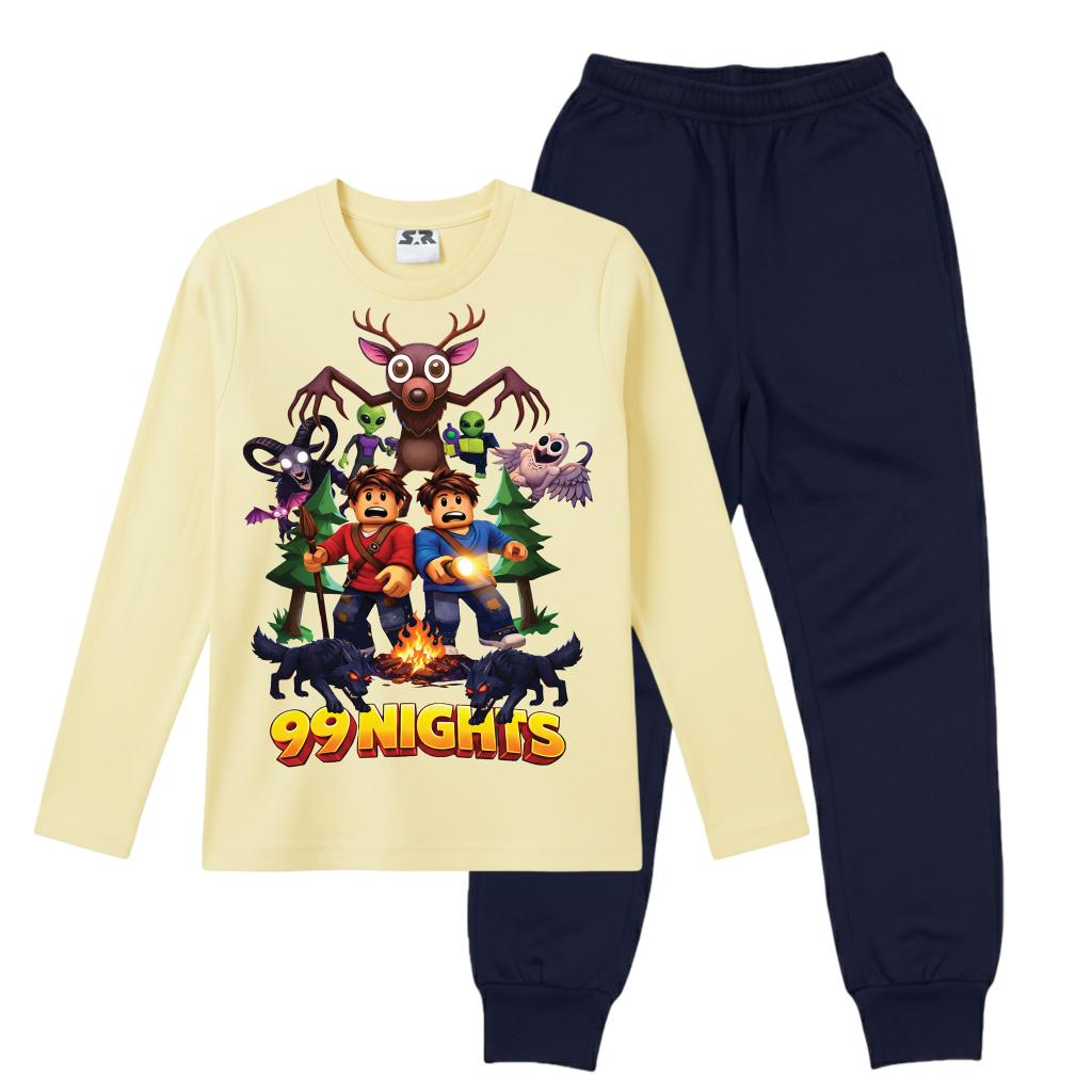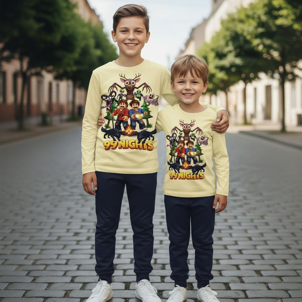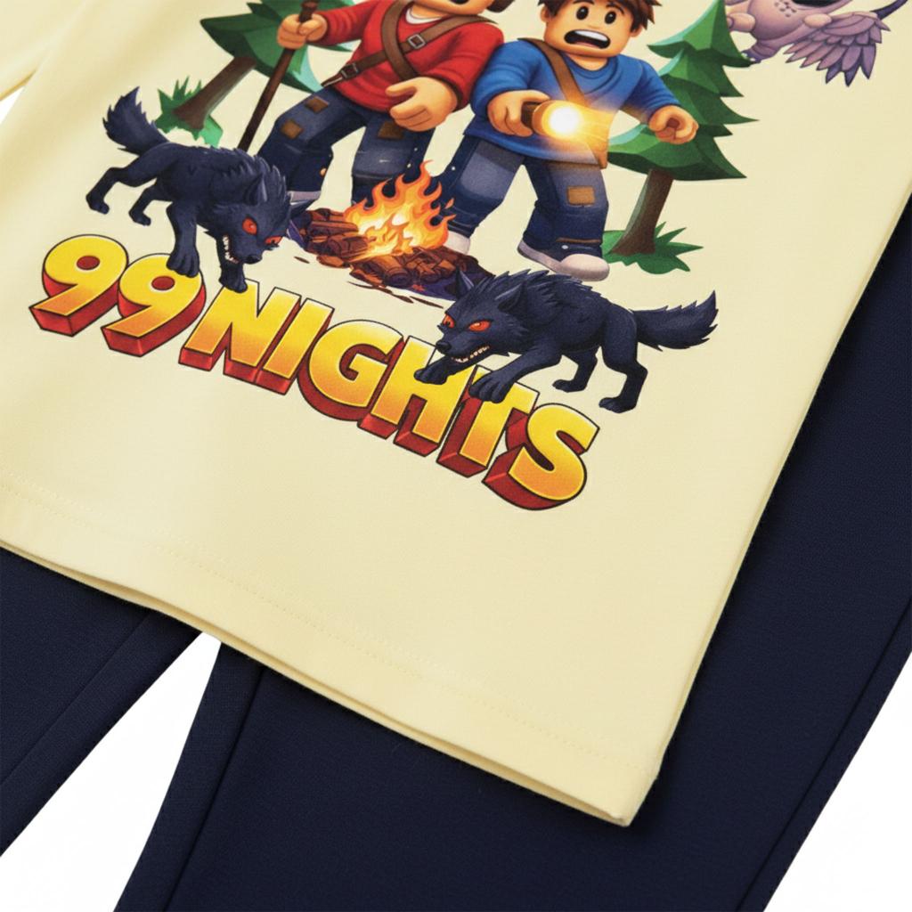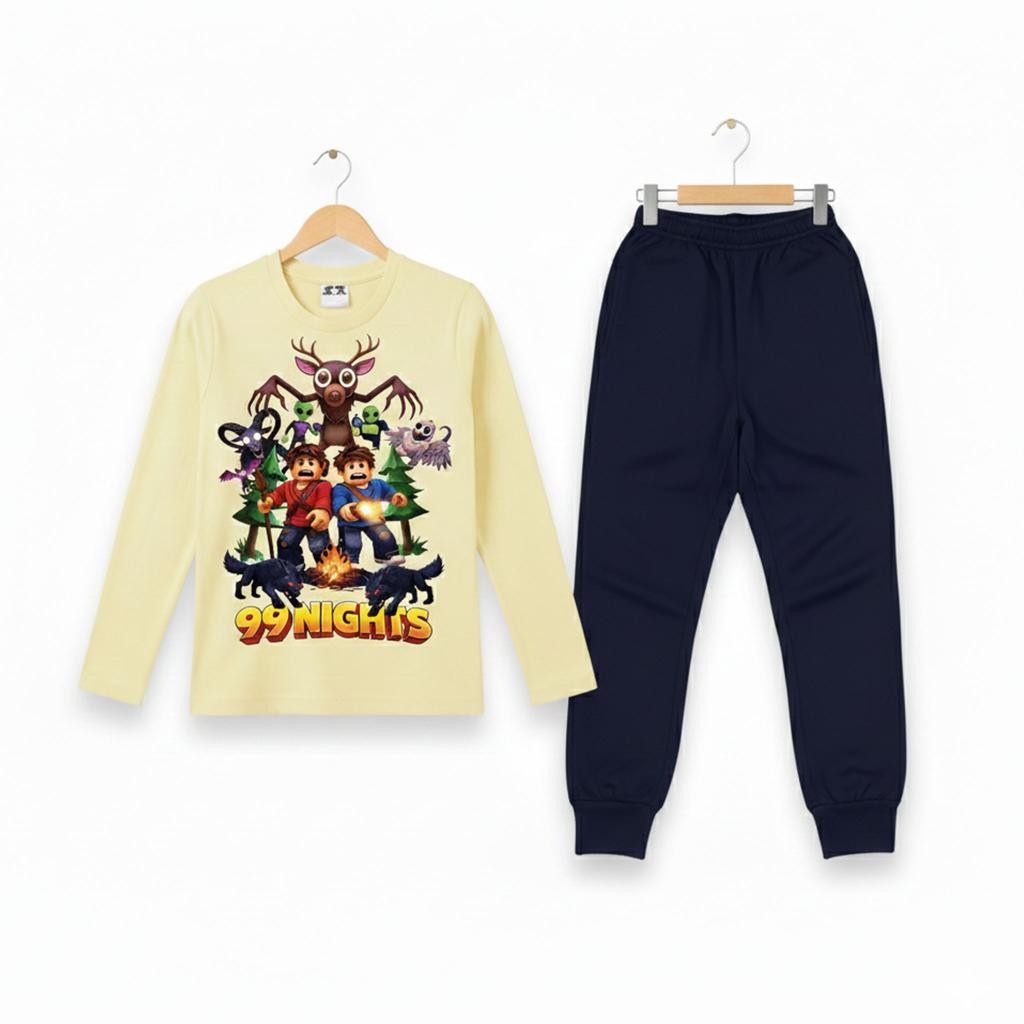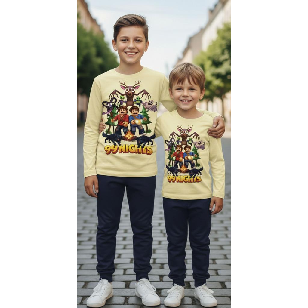 Свеж, модерен и удобен комплект за активните деца. Ментовата блуза с впечатляващ приключенски принт „99 Nights in the Forest“ се комбинира с тъмно спортно долнище за балансирана и стилна визия.