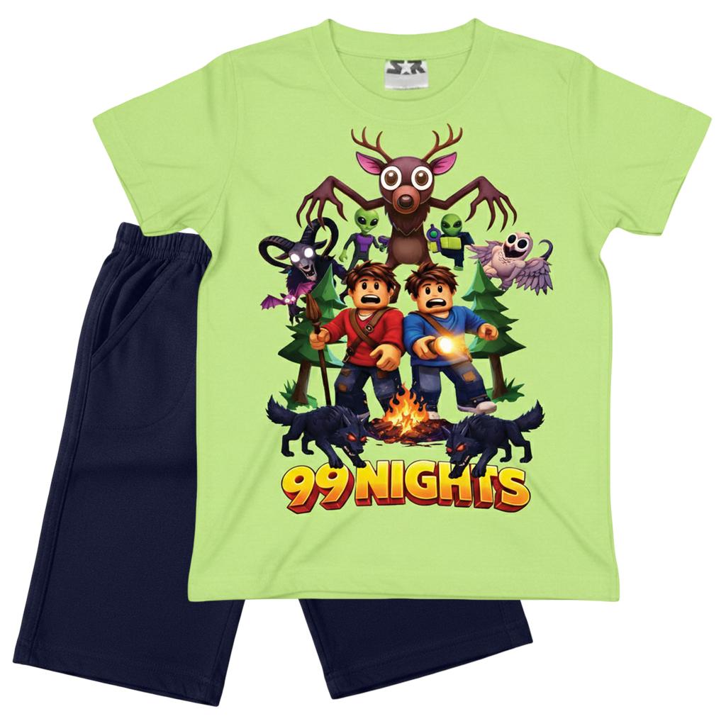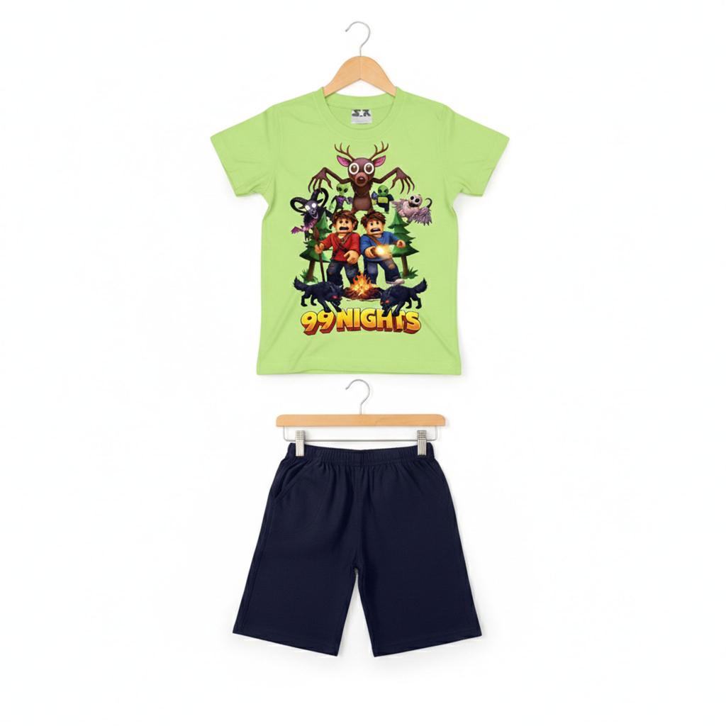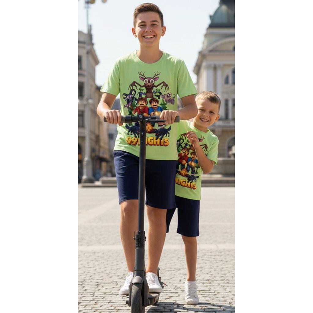 Свежа комбинация, която веднага привлича вниманието! Зелена тениска с ефектен принт „99 Nights in the Forest“ носи настроение и приключенски дух, а тъмните бермуди балансират визията и я правят практична за всекидневието.