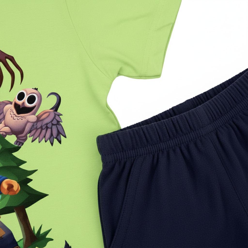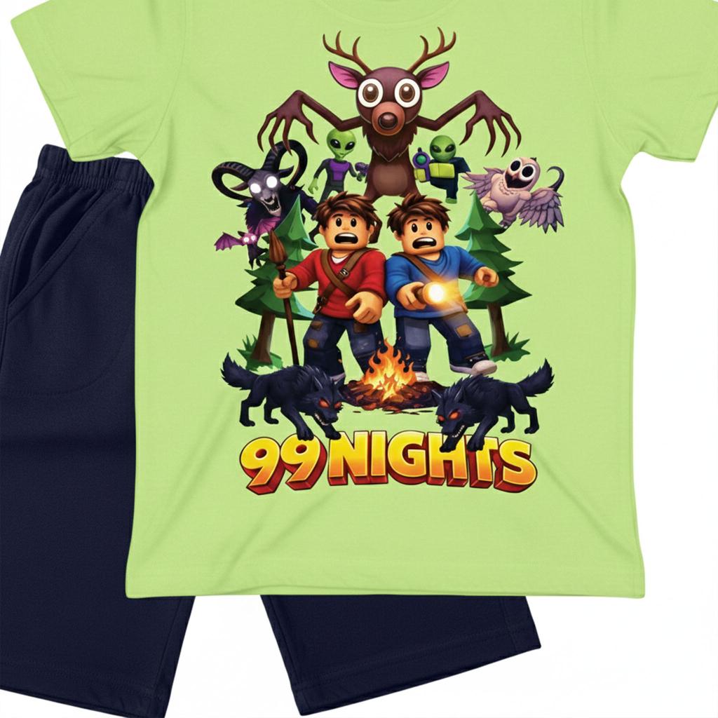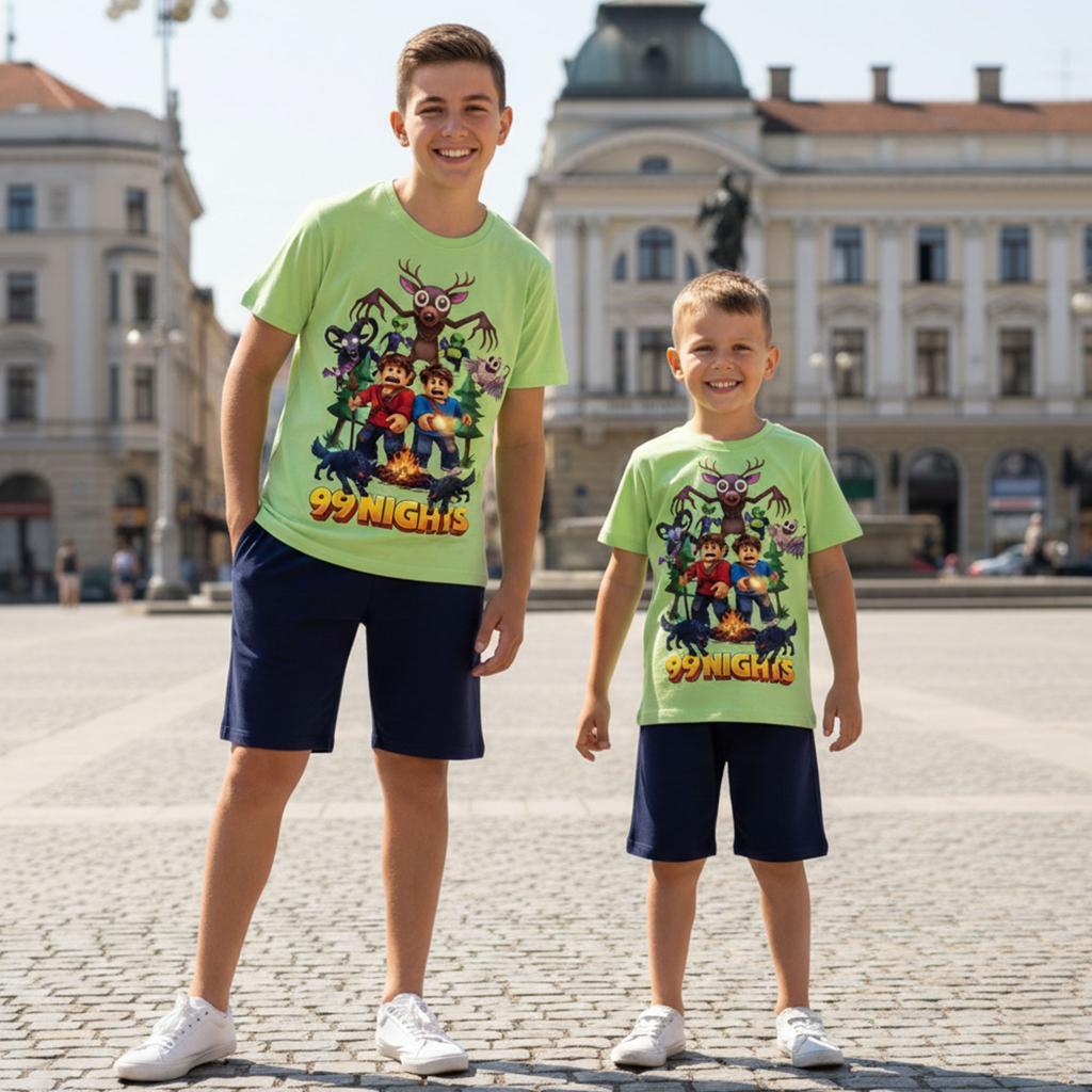 Свежа комбинация, която веднага привлича вниманието! Зелена тениска с ефектен принт „99 Nights in the Forest“ носи настроение и приключенски дух, а тъмните бермуди балансират визията и я правят практична за всекидневието.